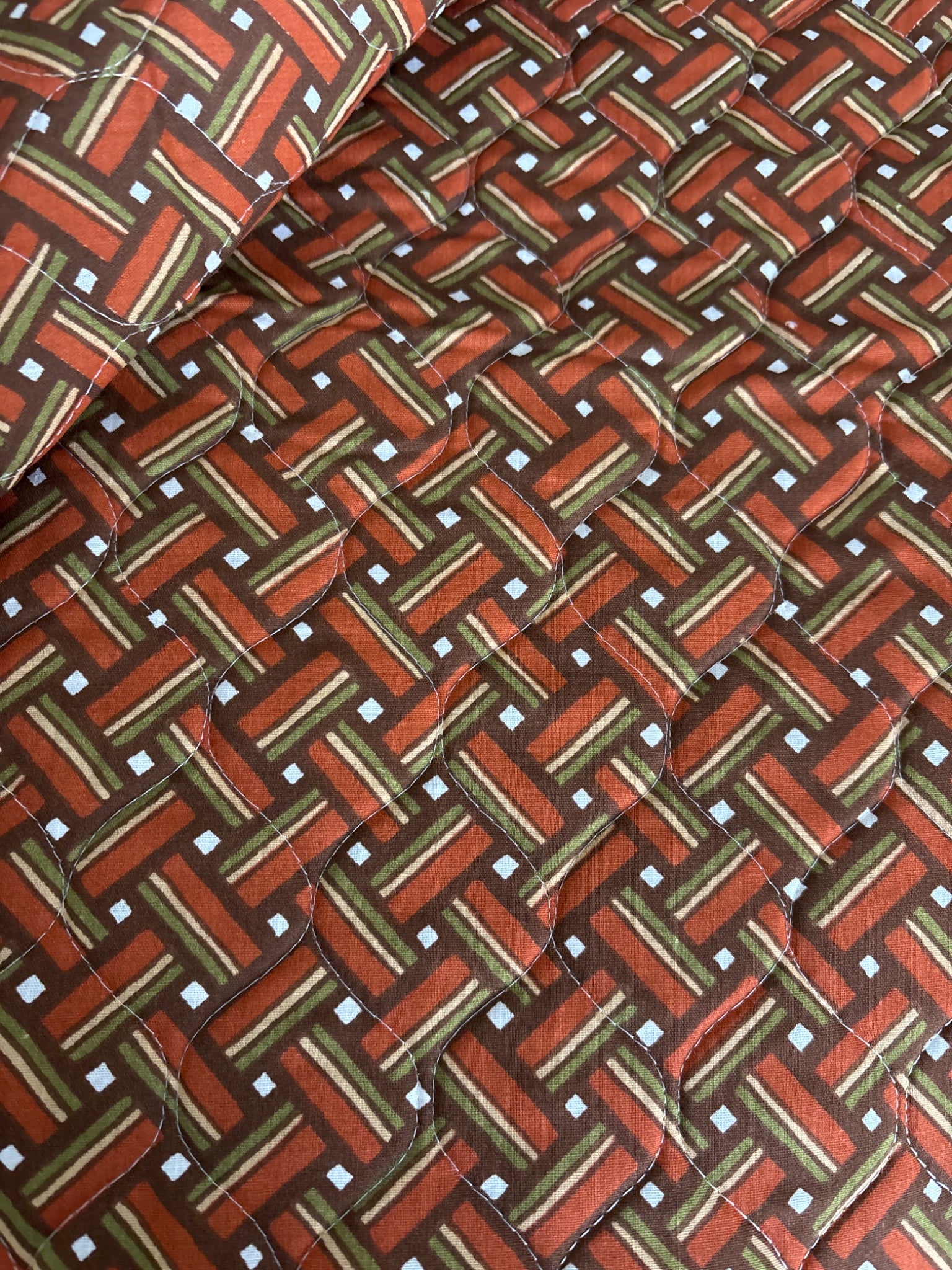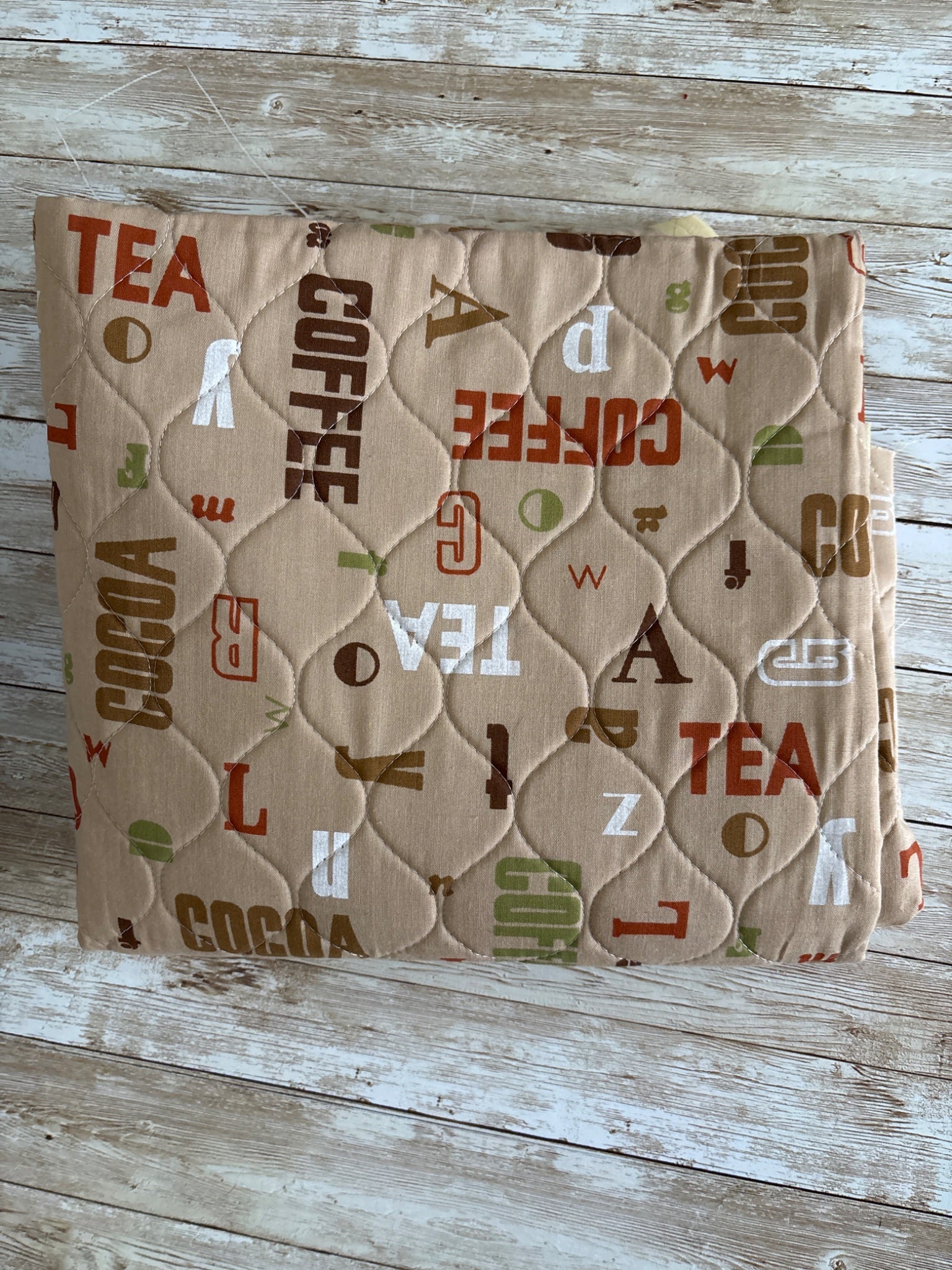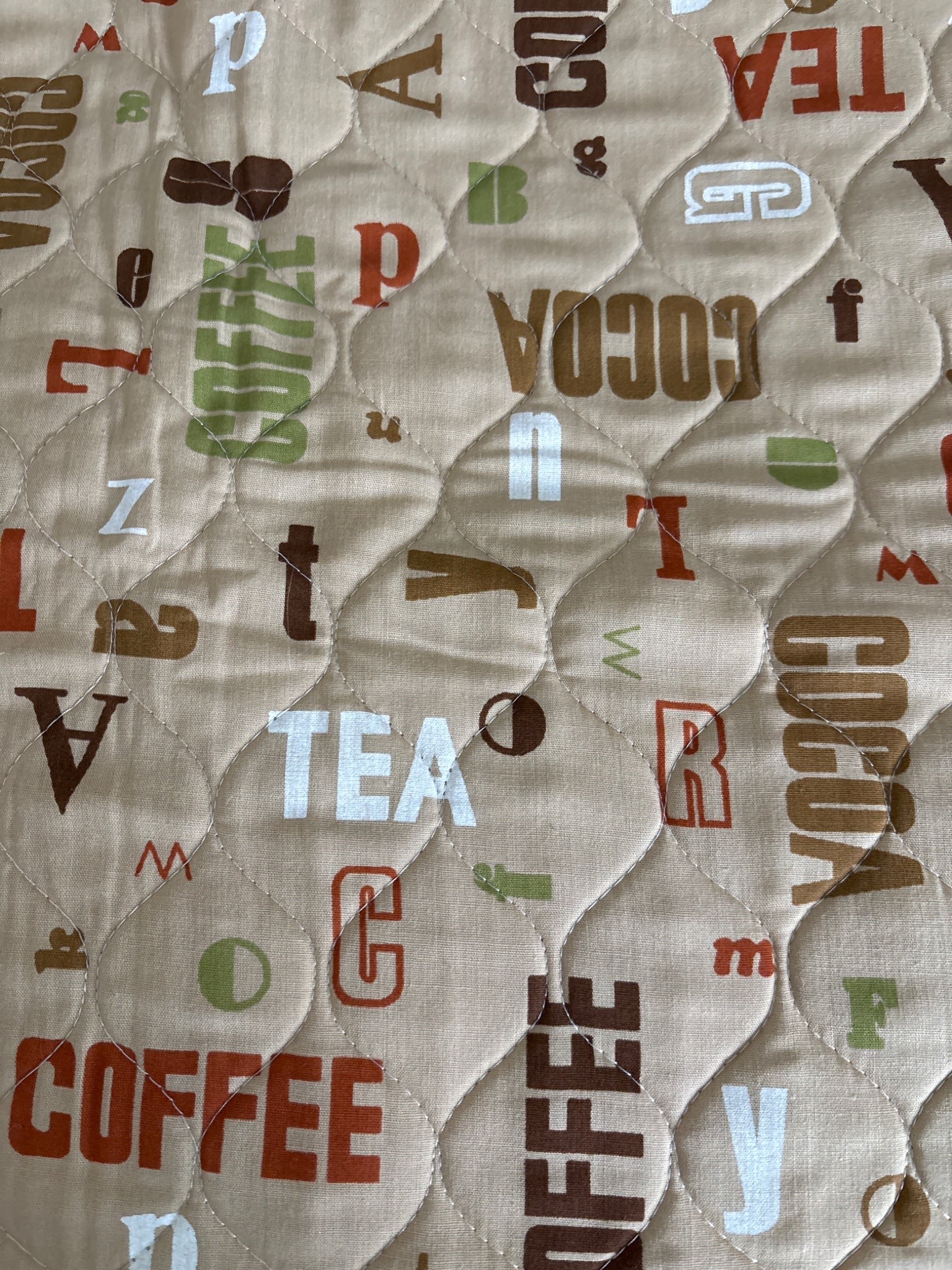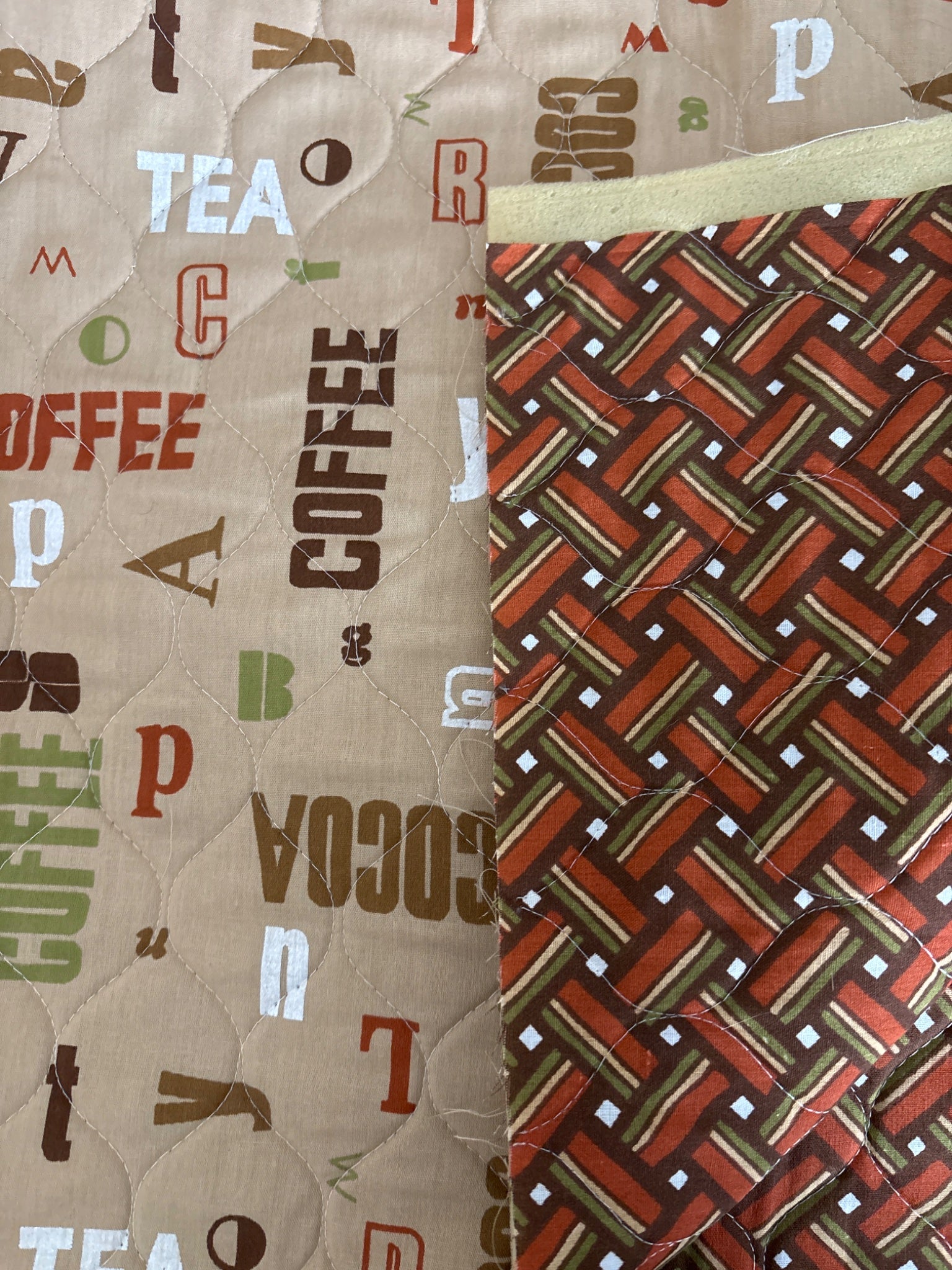 Vintage quilted fabric, coffee and tea print on one side and orange/green/tan geometric shapes on the opposite side. Foam batting is sewn in, all it needs is finished or cut to whatever project you want.