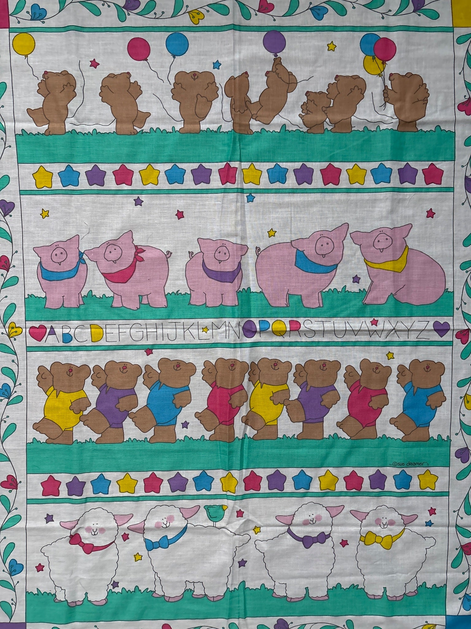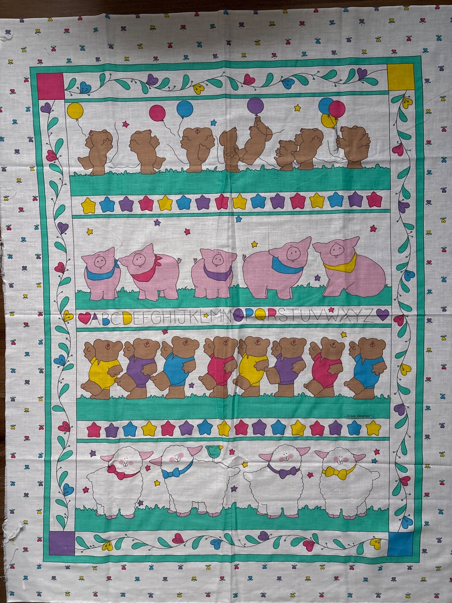 Quilt panel featuring animals along with different shapes and the alphabet. Fabric is in the thinner side but cute nonetheless.