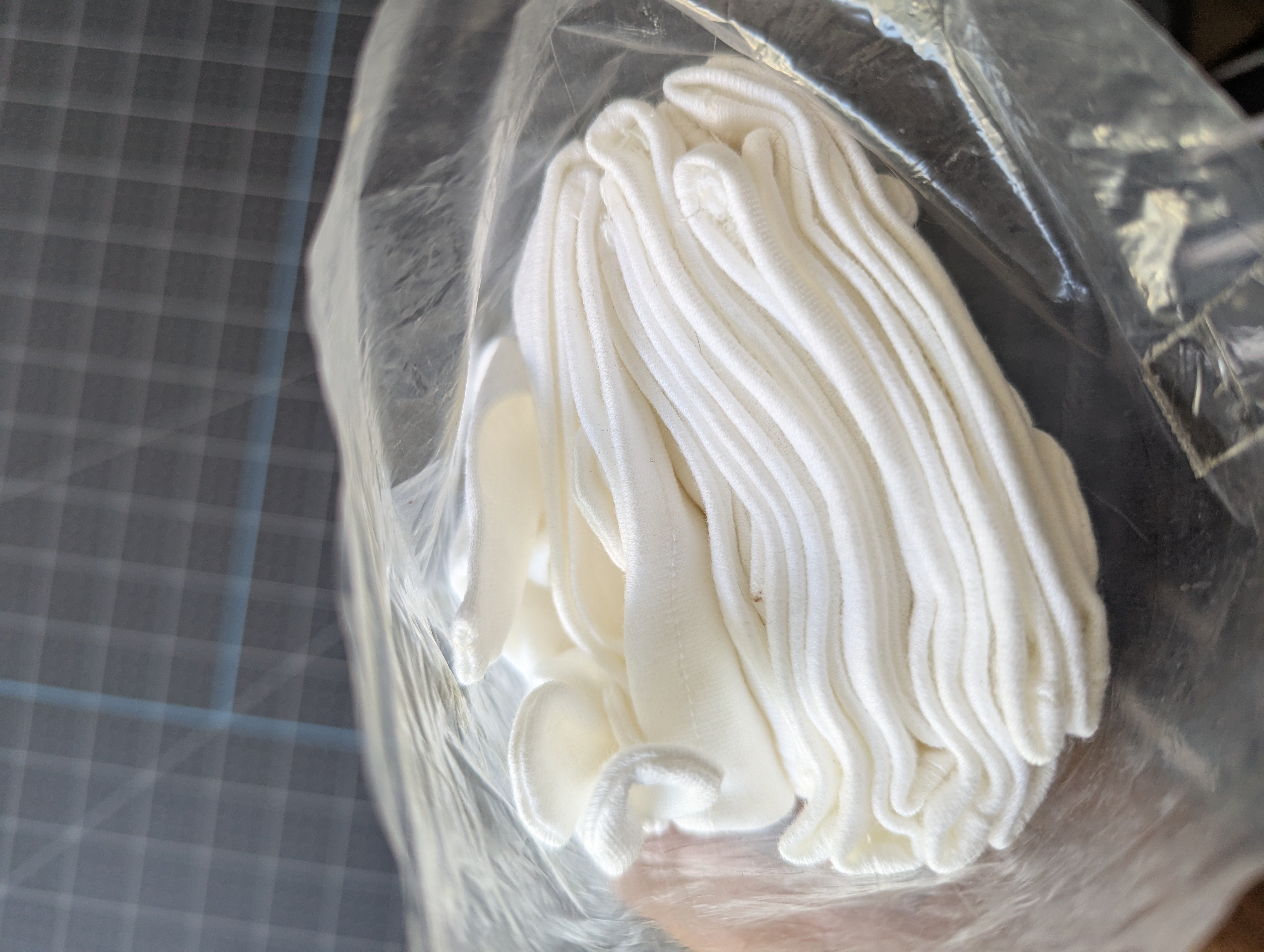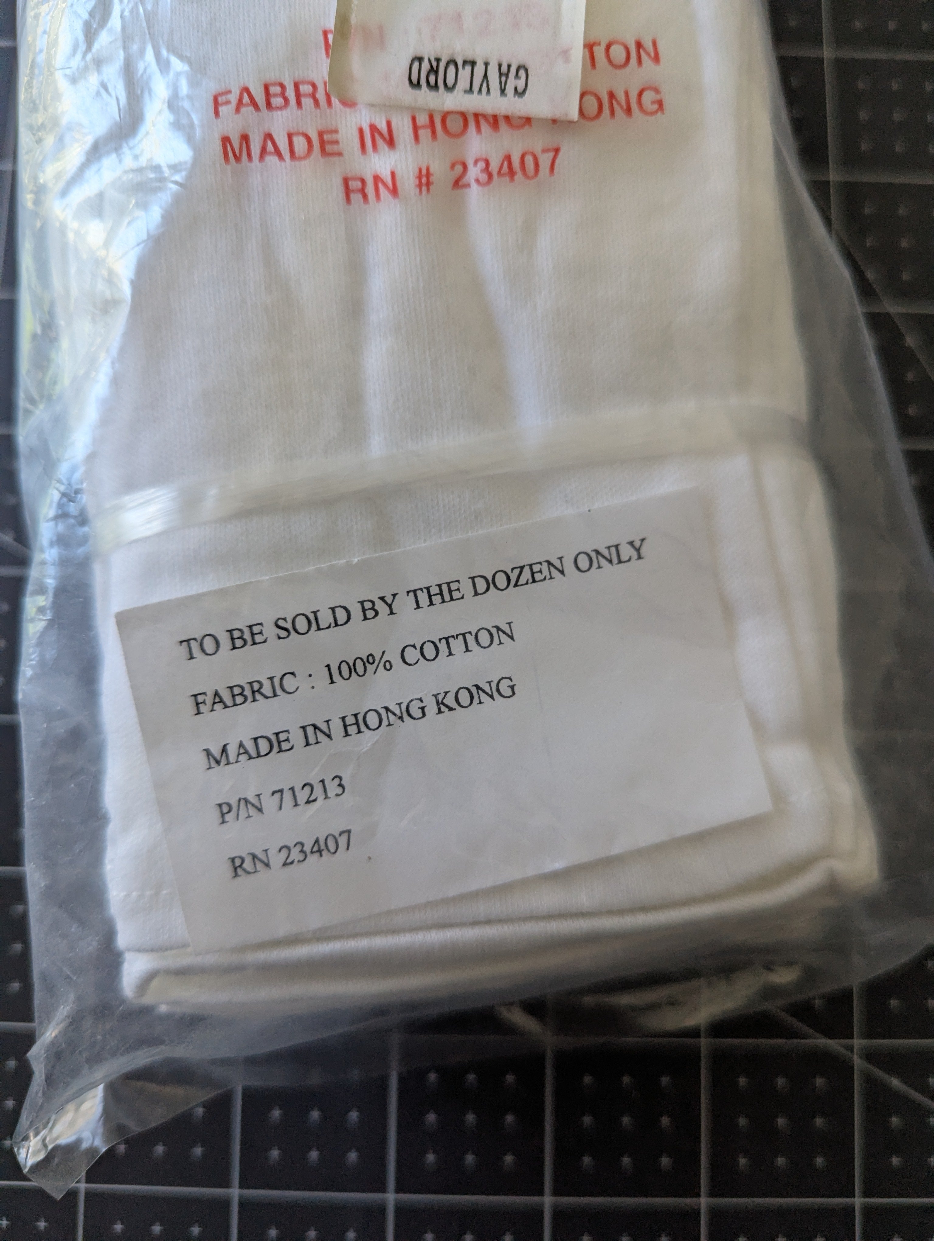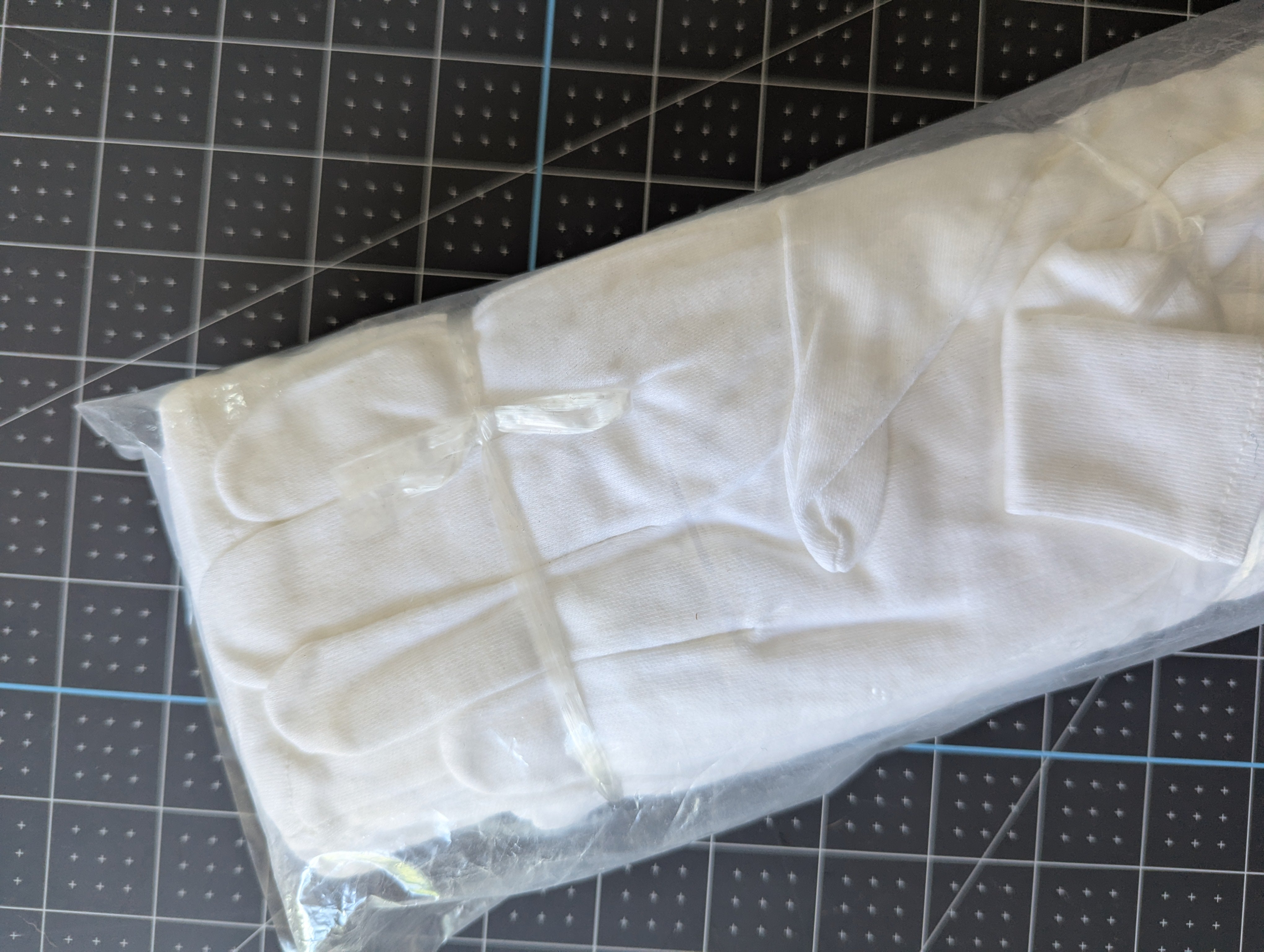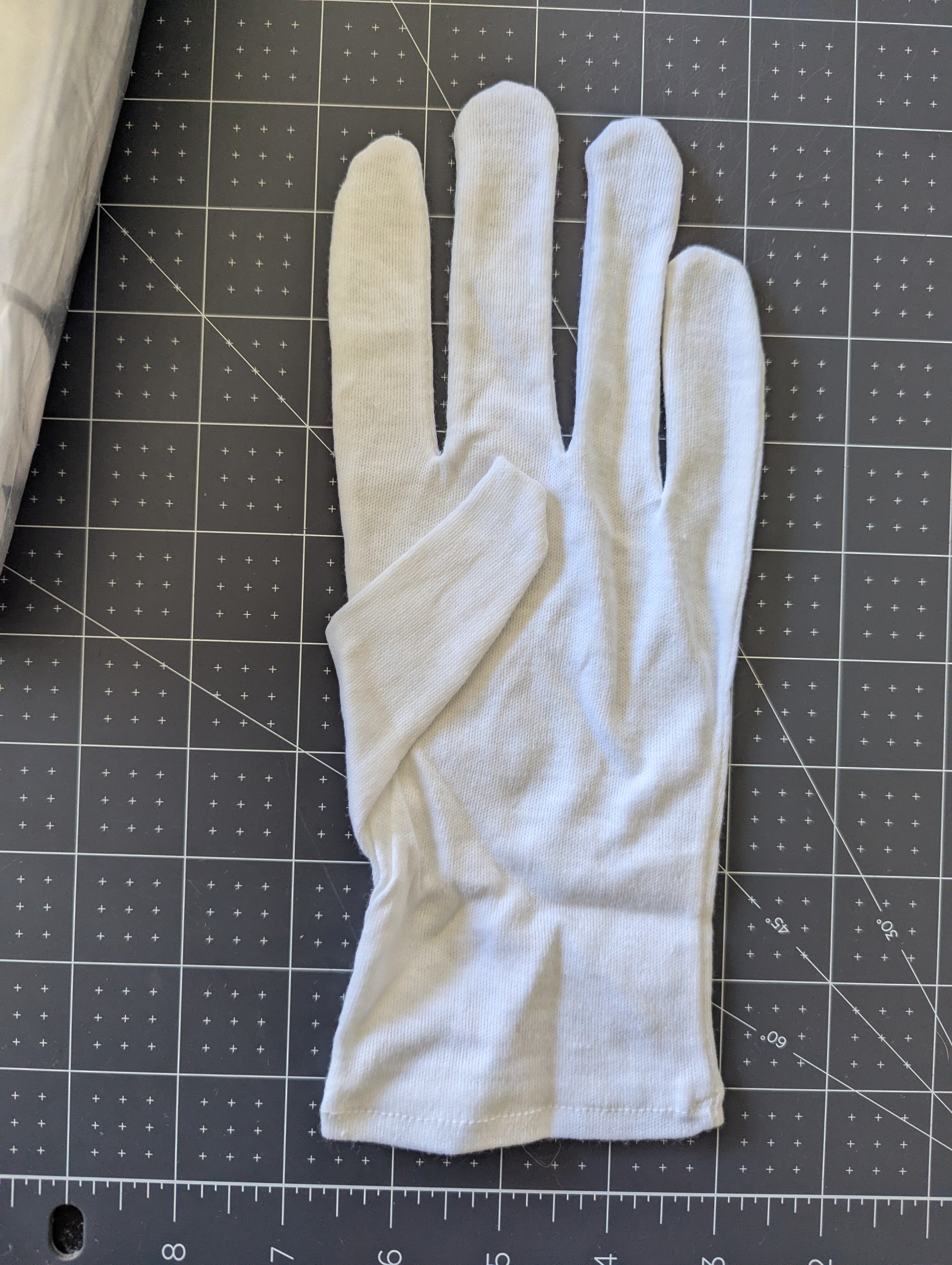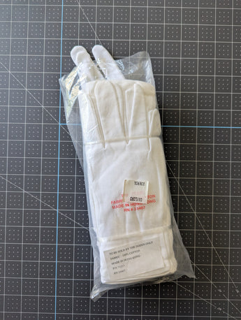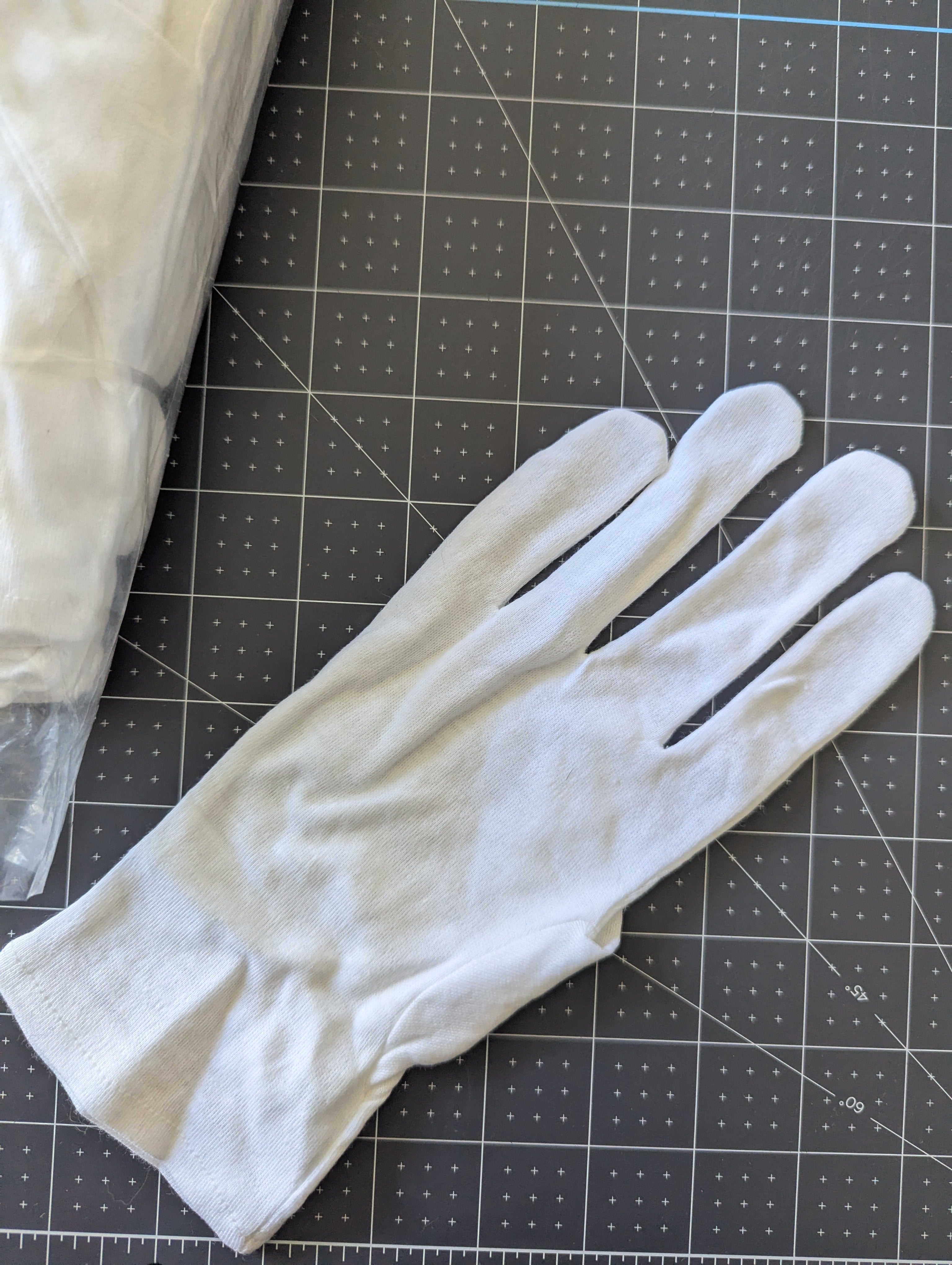 We've pulled a glove out from this set of unused white cotton gloves for size reference, otherwise these gloves are still new and bound together. You'll receive the entire pack.