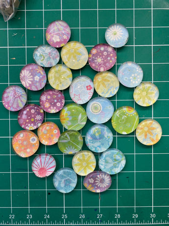 27 floral glass magnets I made some years ago with mighty magnets. They never sold when I was doing markets and now I am tired of toting them around. Maybe someone else can do something creative with them.