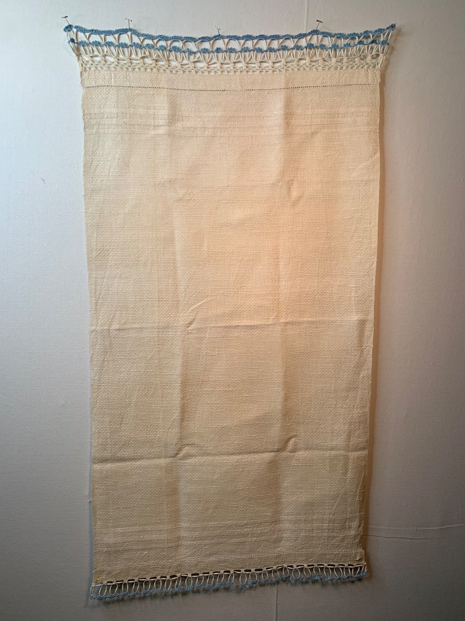Lovely Off White hand woven blue crochet florettes hanging from the white satin wrapped warp. Just a stunning effect. No stains,holes,rips or tears. 34 1/2"L X 18"W A lovely decorator towel for a bathroom or dresser scarf. The length and quality of the white hand woven fabric in this towel makes a perfect substraight for an embroidery base. However, this piece is so pretty one would probably just want to use it as originally intended.