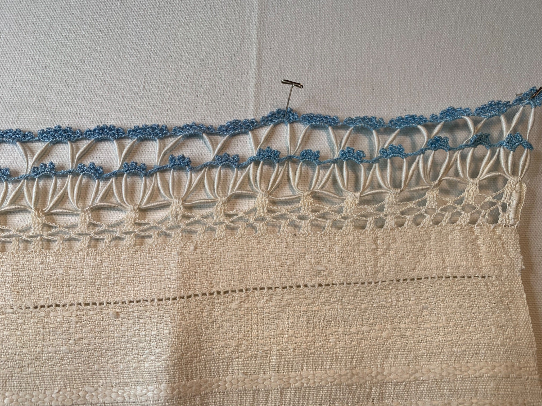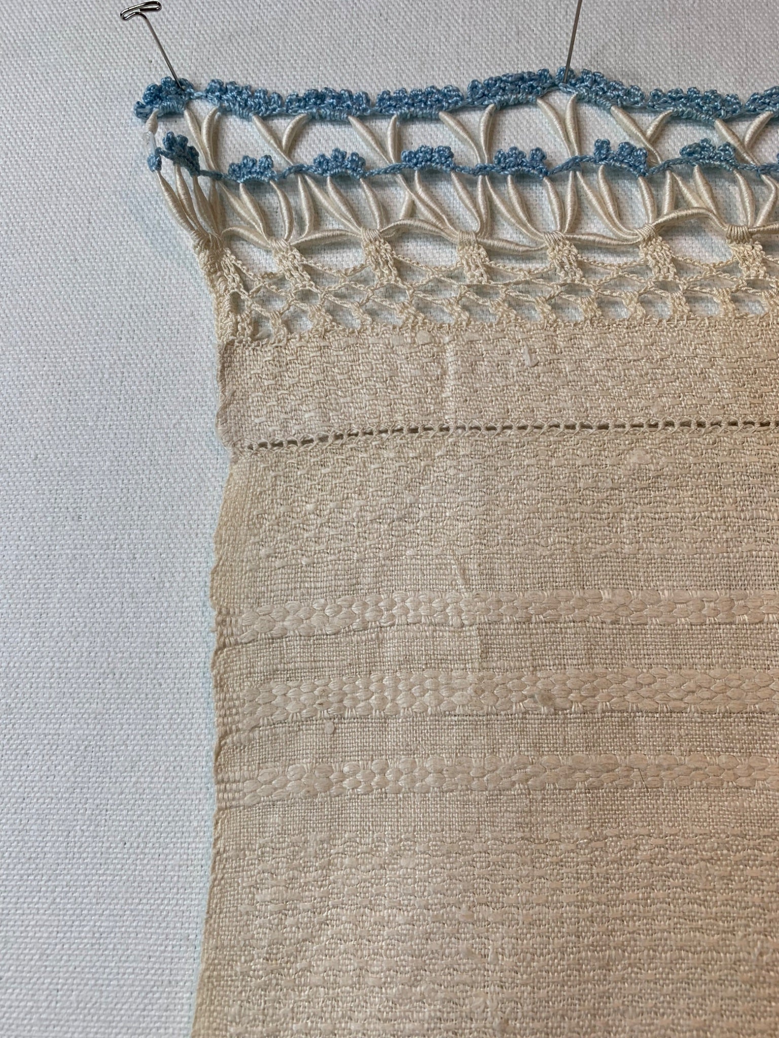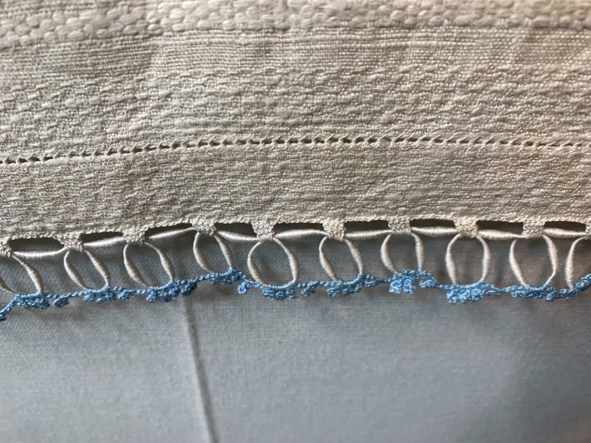 Off White Linen Hand Towel with Lt. Blue Crochet Crochet Edging 34”L X 18”W