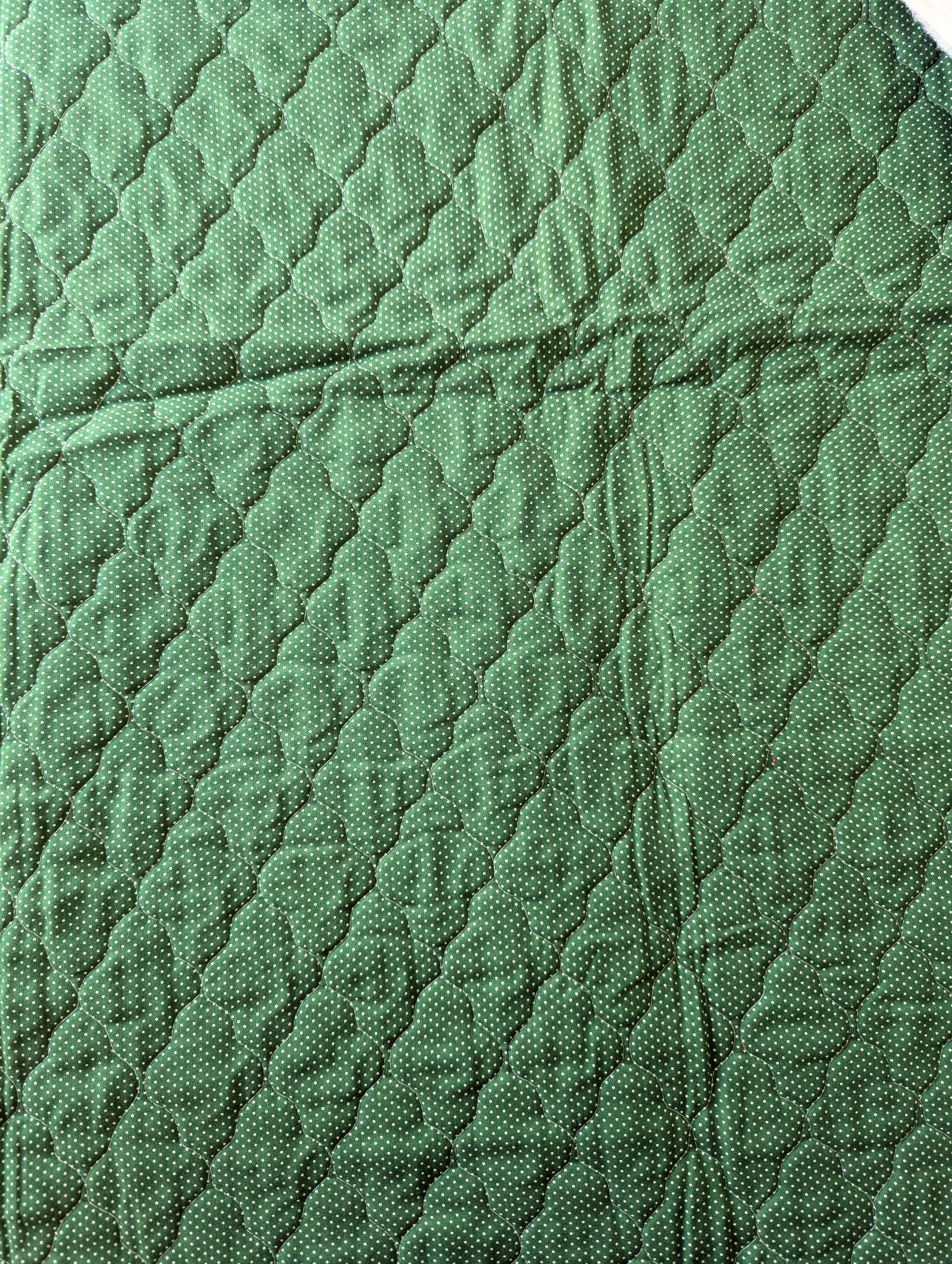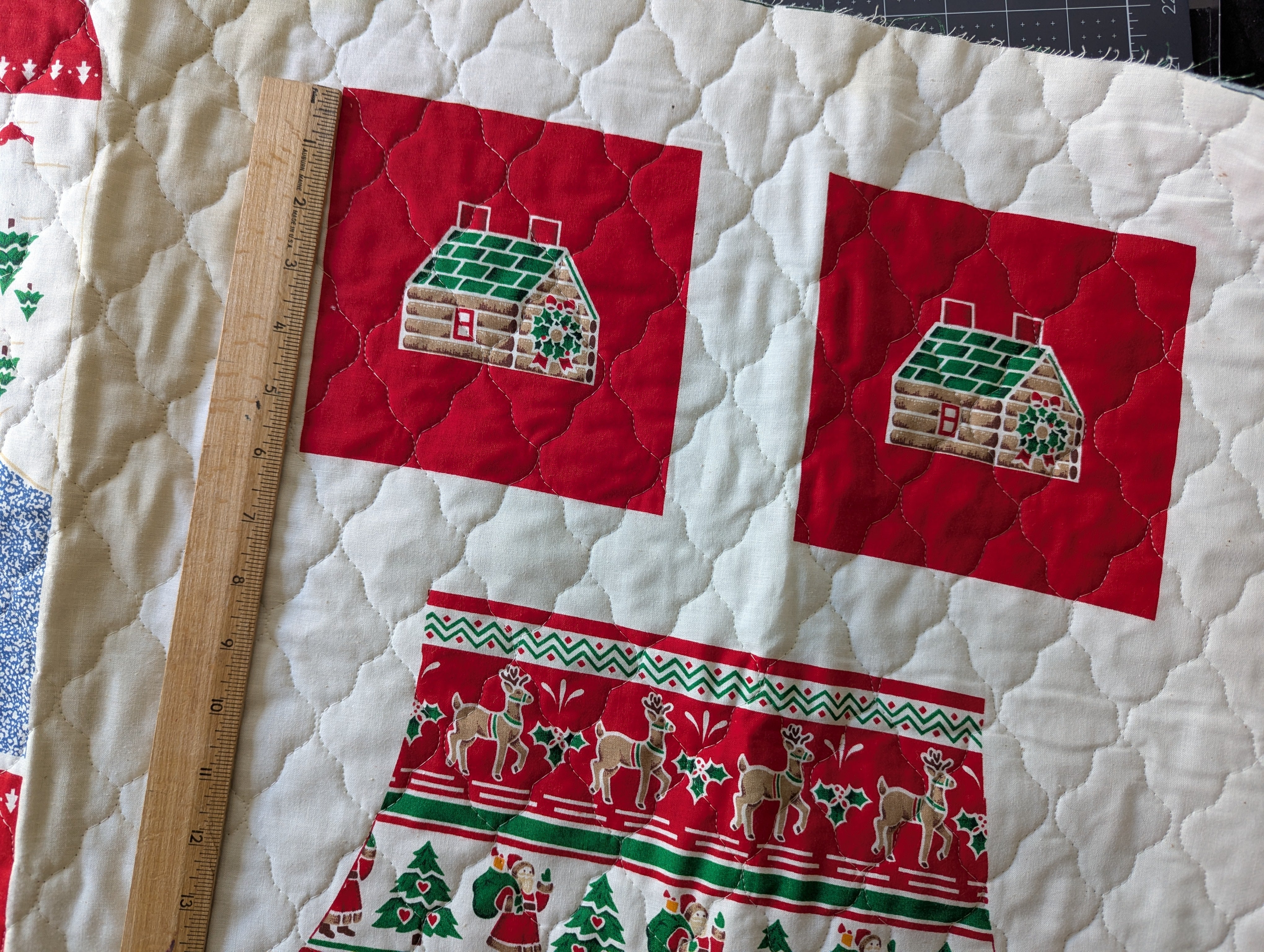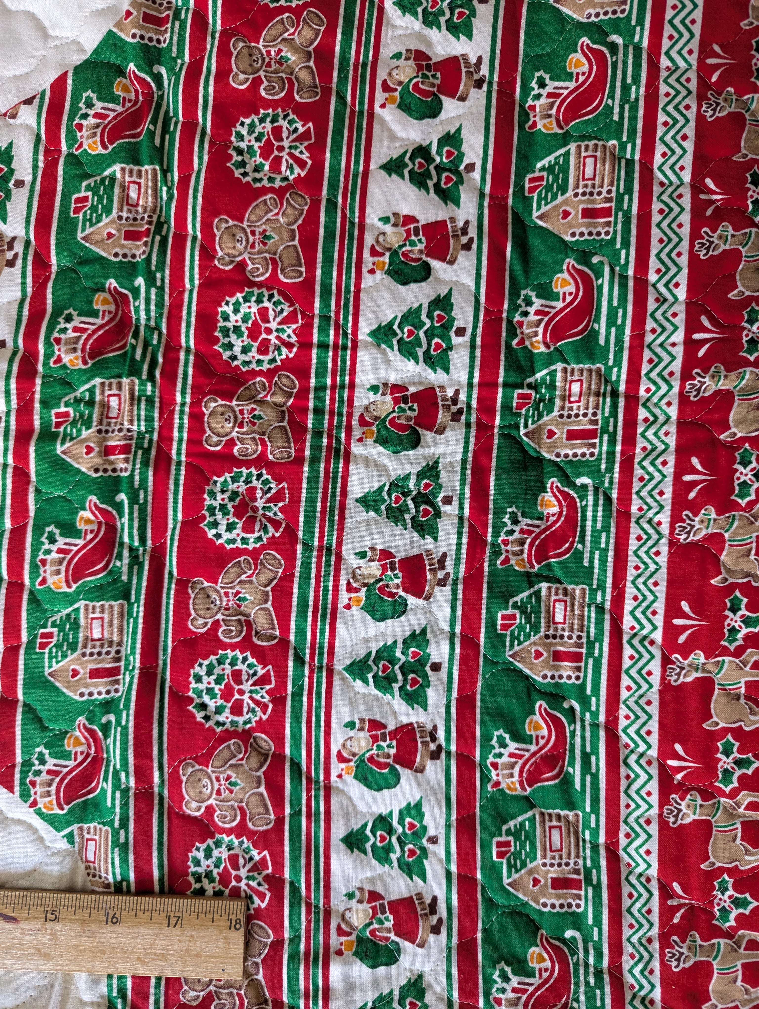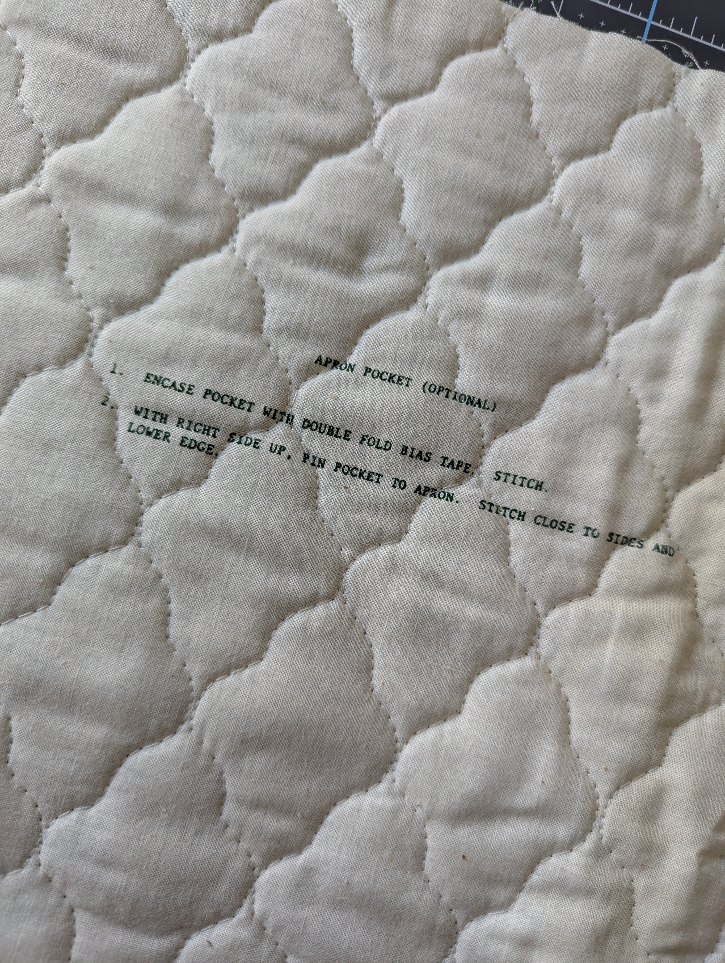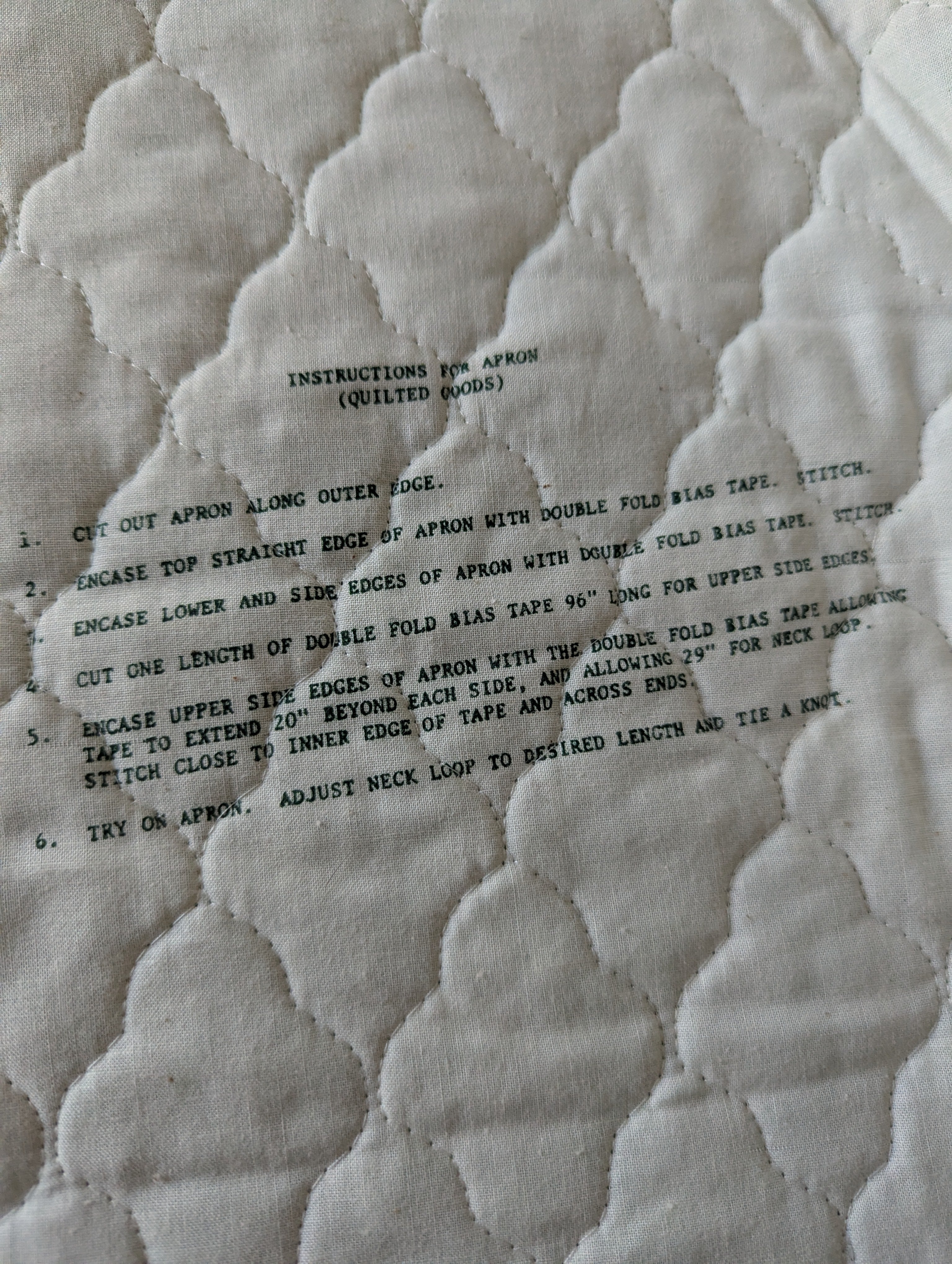 A quilted panel with two printed apron pieces, and two pockets meant for optional addition to the aprons. Does not include apron strings. Aprons are fairly small, a ruler is included for added size reference. There is some yellowing on parts of the white fabric, but doesn't appear to have covered much (if at all?) of the aprons. They seem to be in good condition.