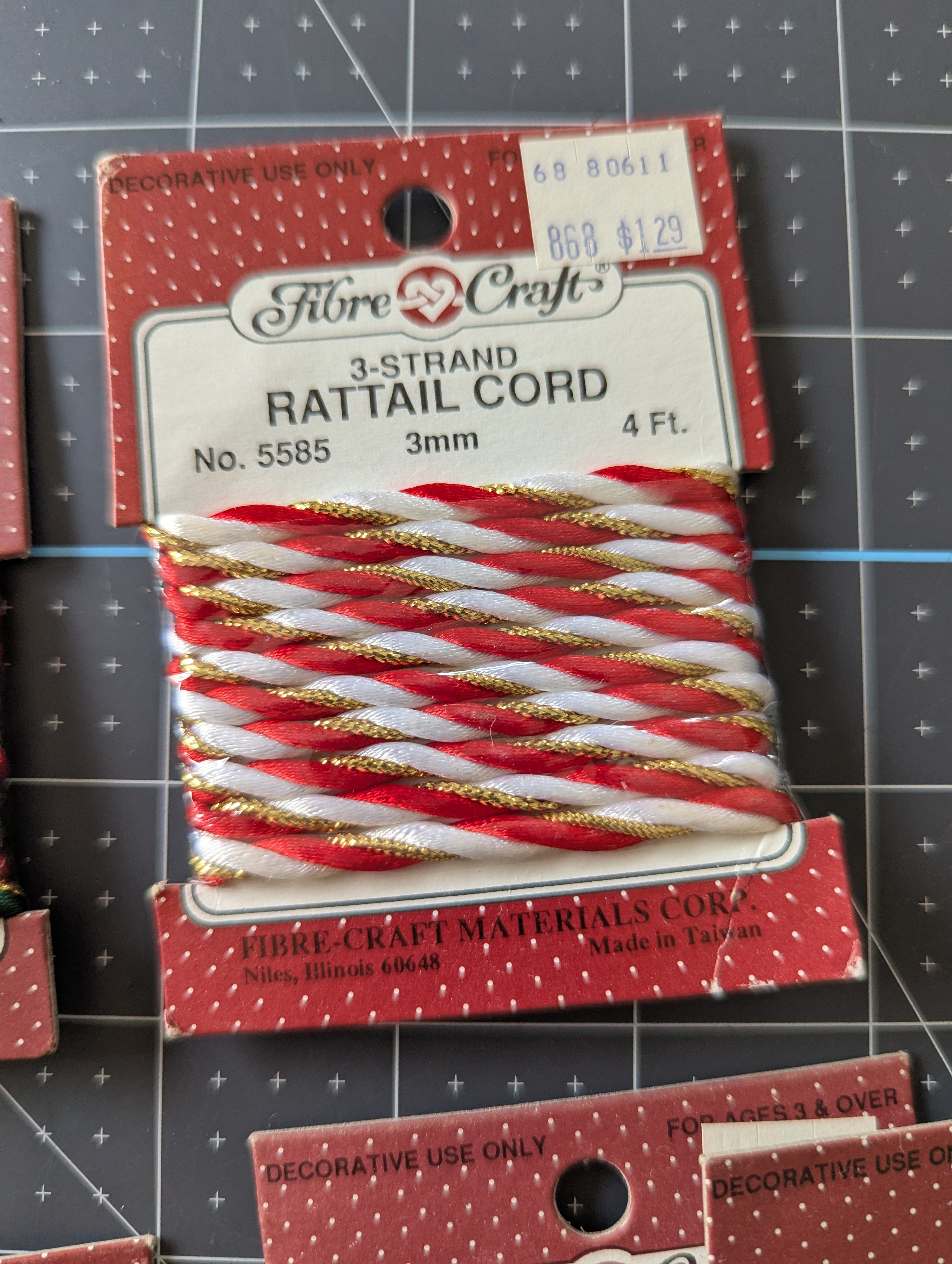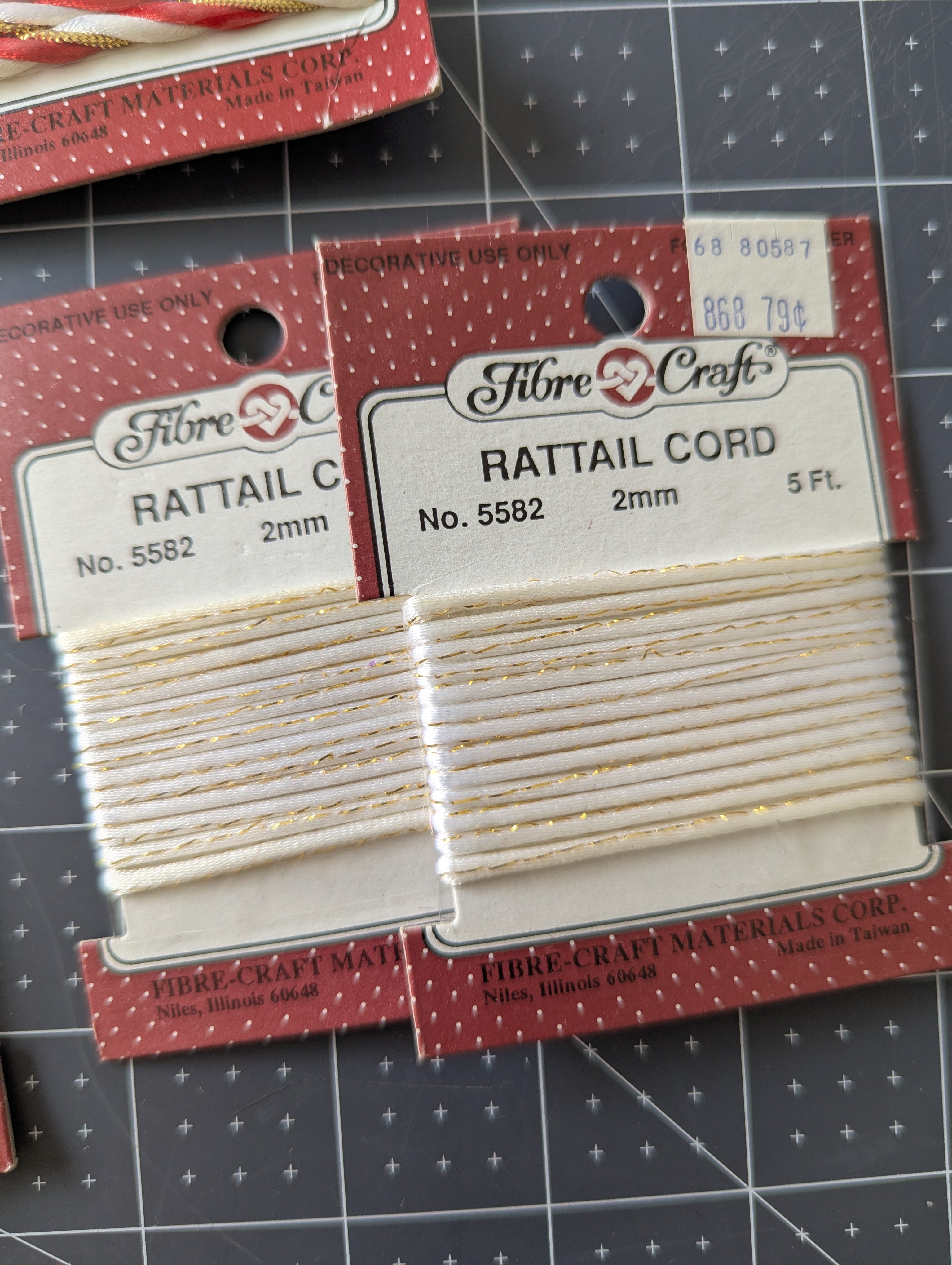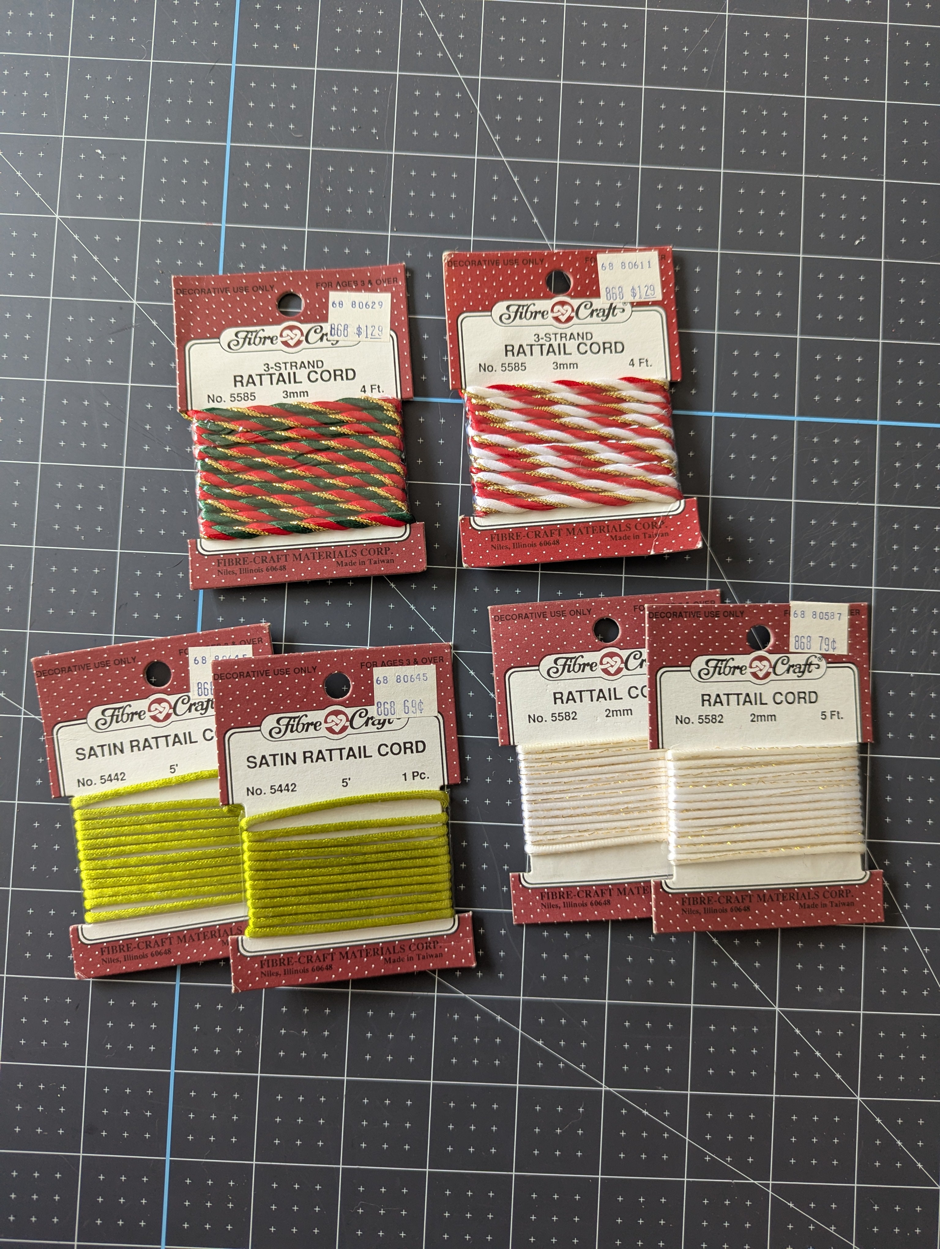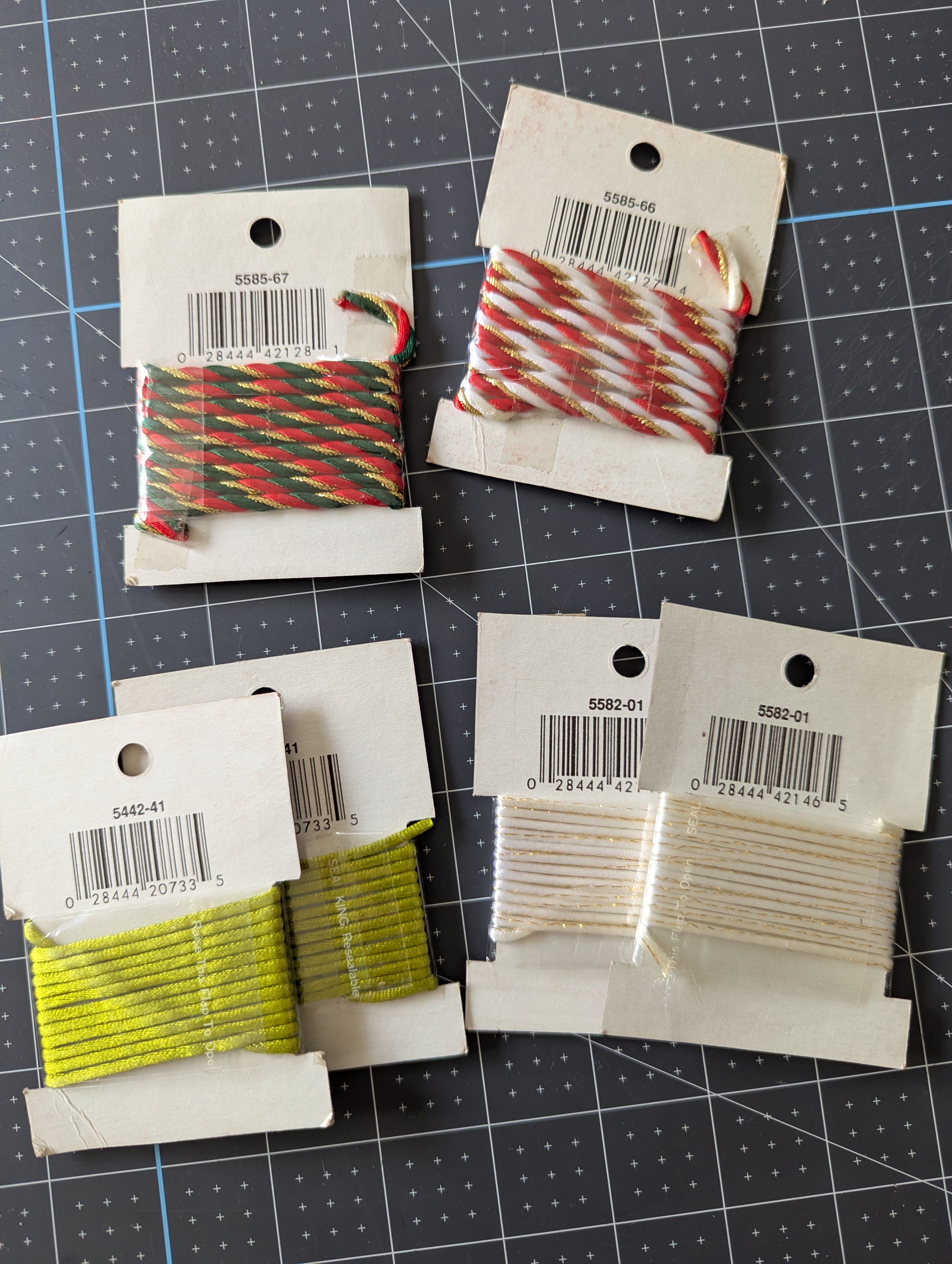 You'll receive all pictured cord, with four total styles: #5585 - red green and gold, #5585 - red, white and gold, #5442 - light green, #5582 - white with gold floss.