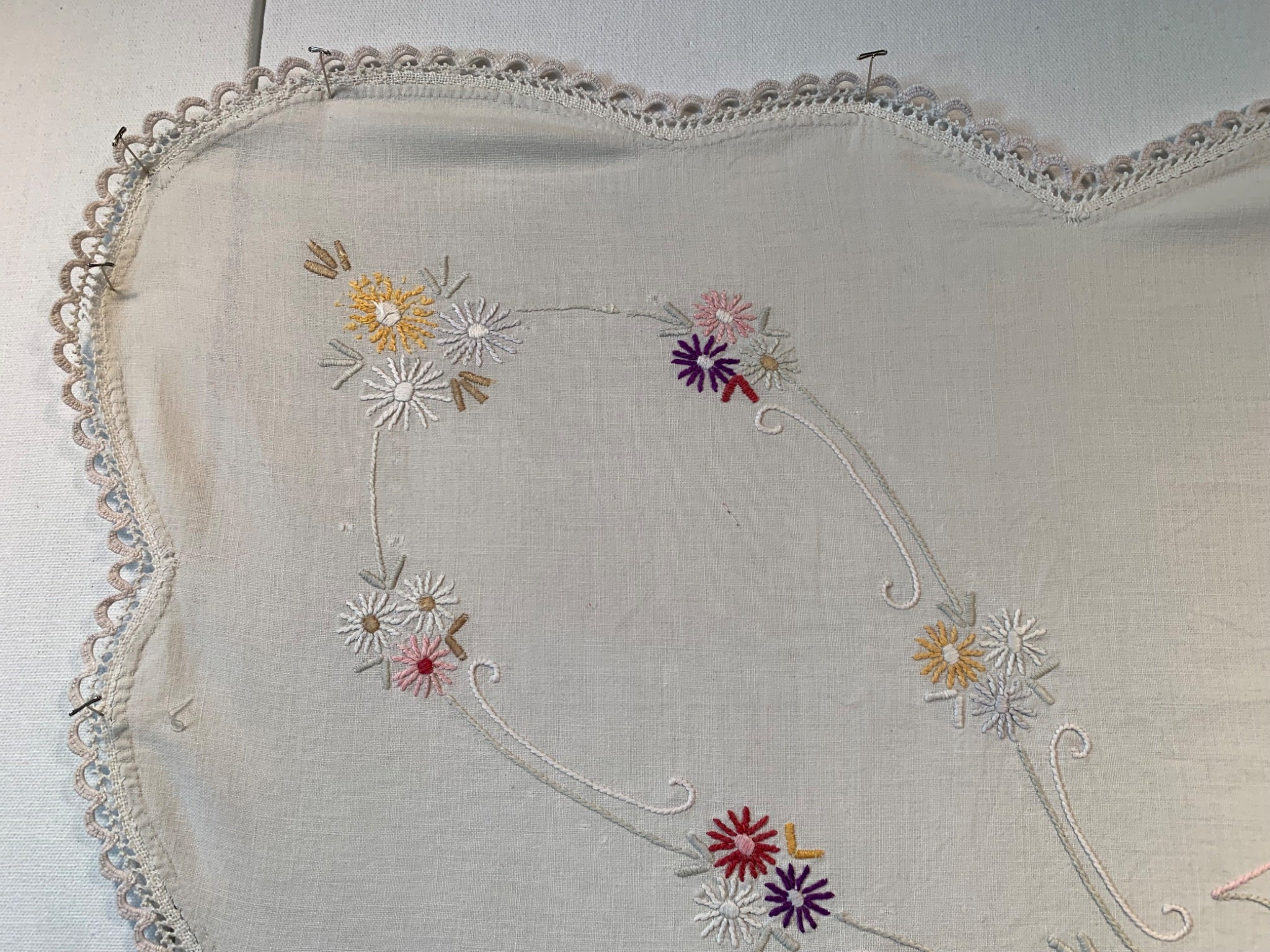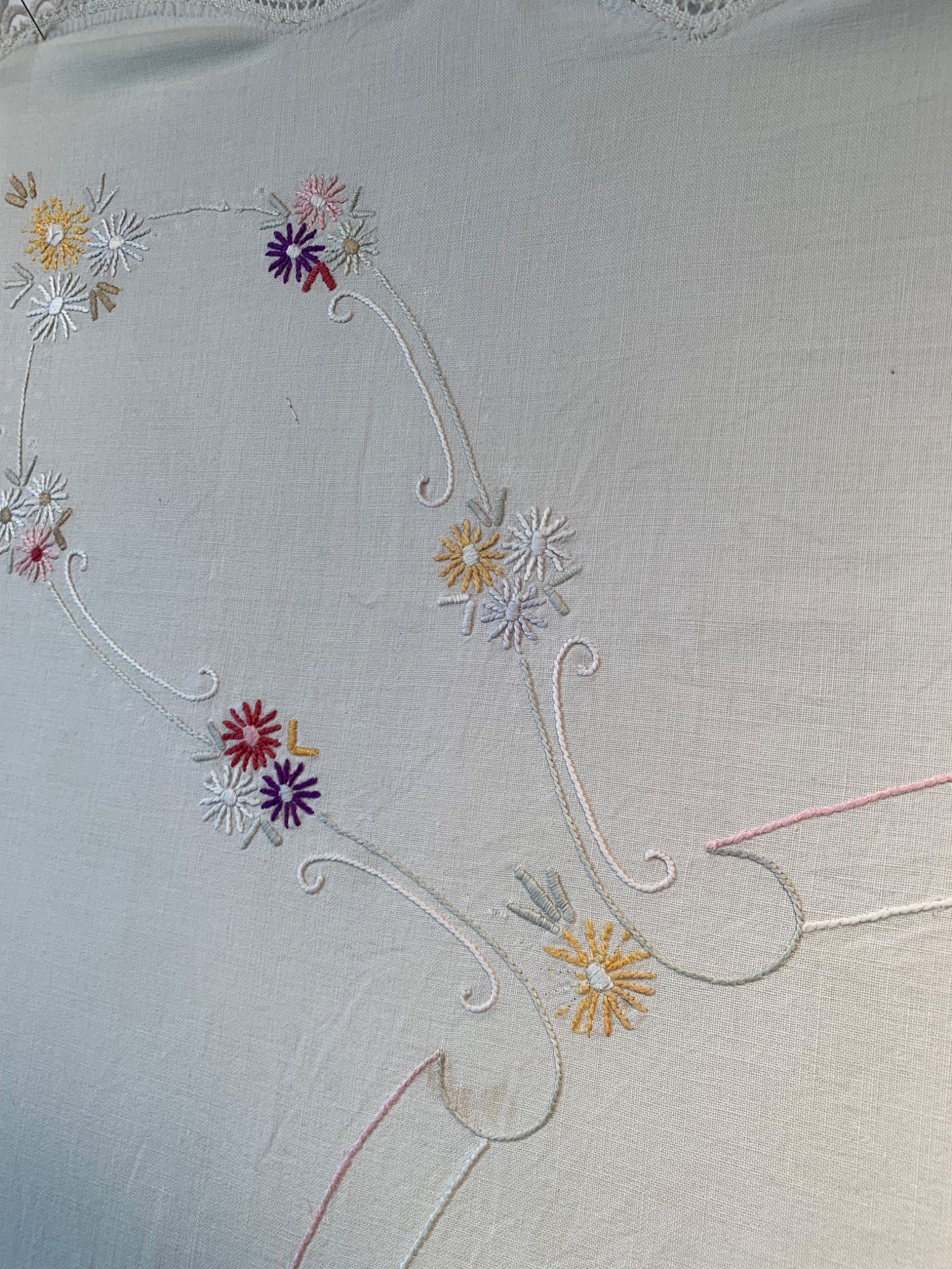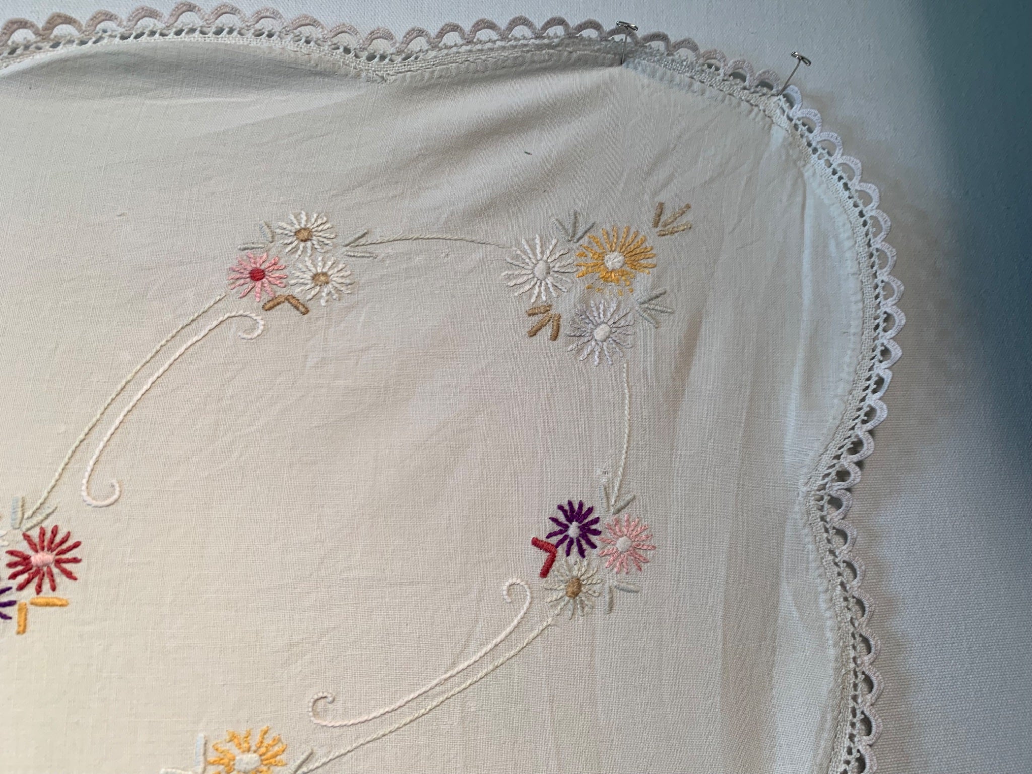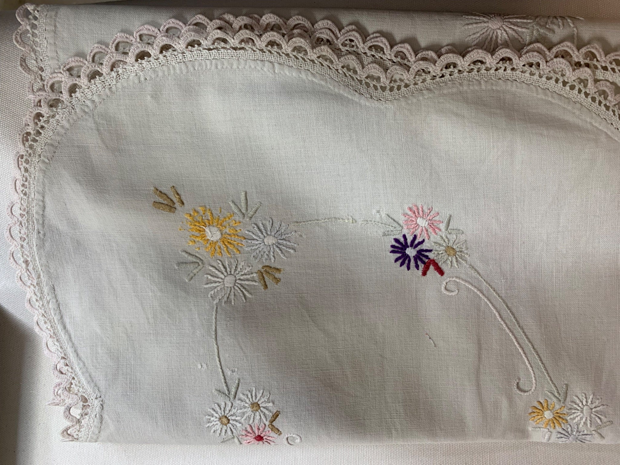 Pretty Linen hand embroidered and crochet bordered table cloth. There are a few small holes on the interior of the table cloth and near the embroidery that would need mending. There is one small unraveling of the crochet edge. Please see photo's. This table cloth would also be a good base for hand printing and dying or to use the embroidery in collage quilting or for appliqué. The embroidered flowers are multi colors of gold, white, maroon, deep purple & pink. They are in a three flower tear drop design to the corners & connected with chain and satin stitch lines circling the center table cloth. The crochet edge is of a small loop design.