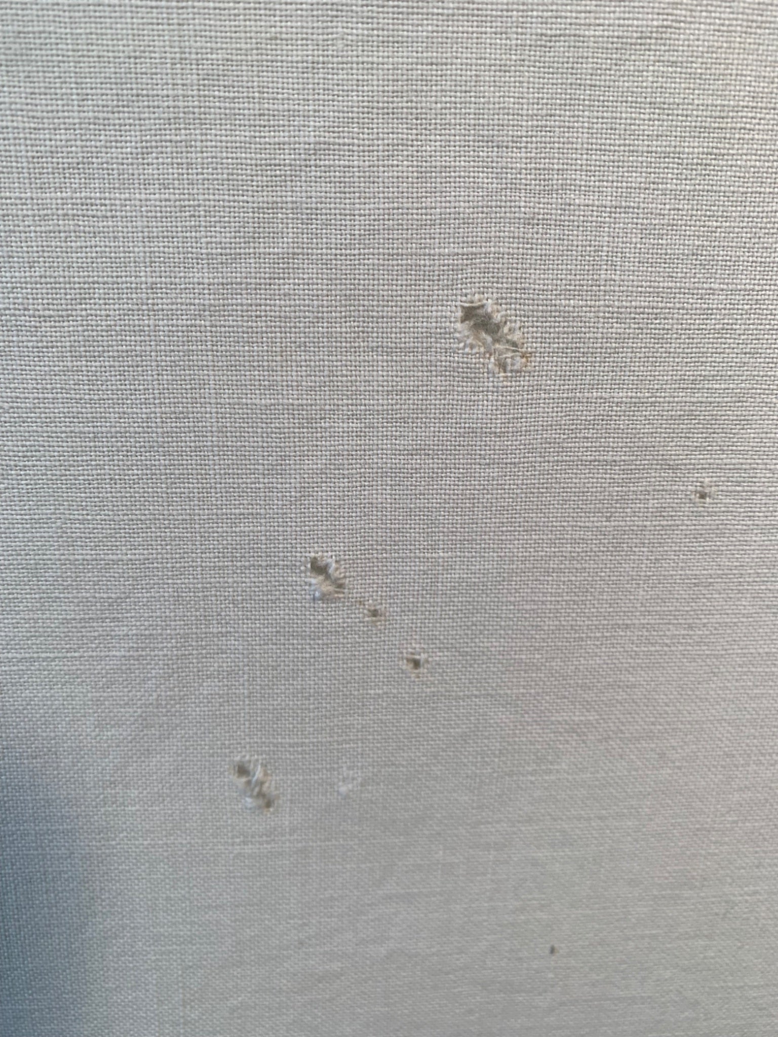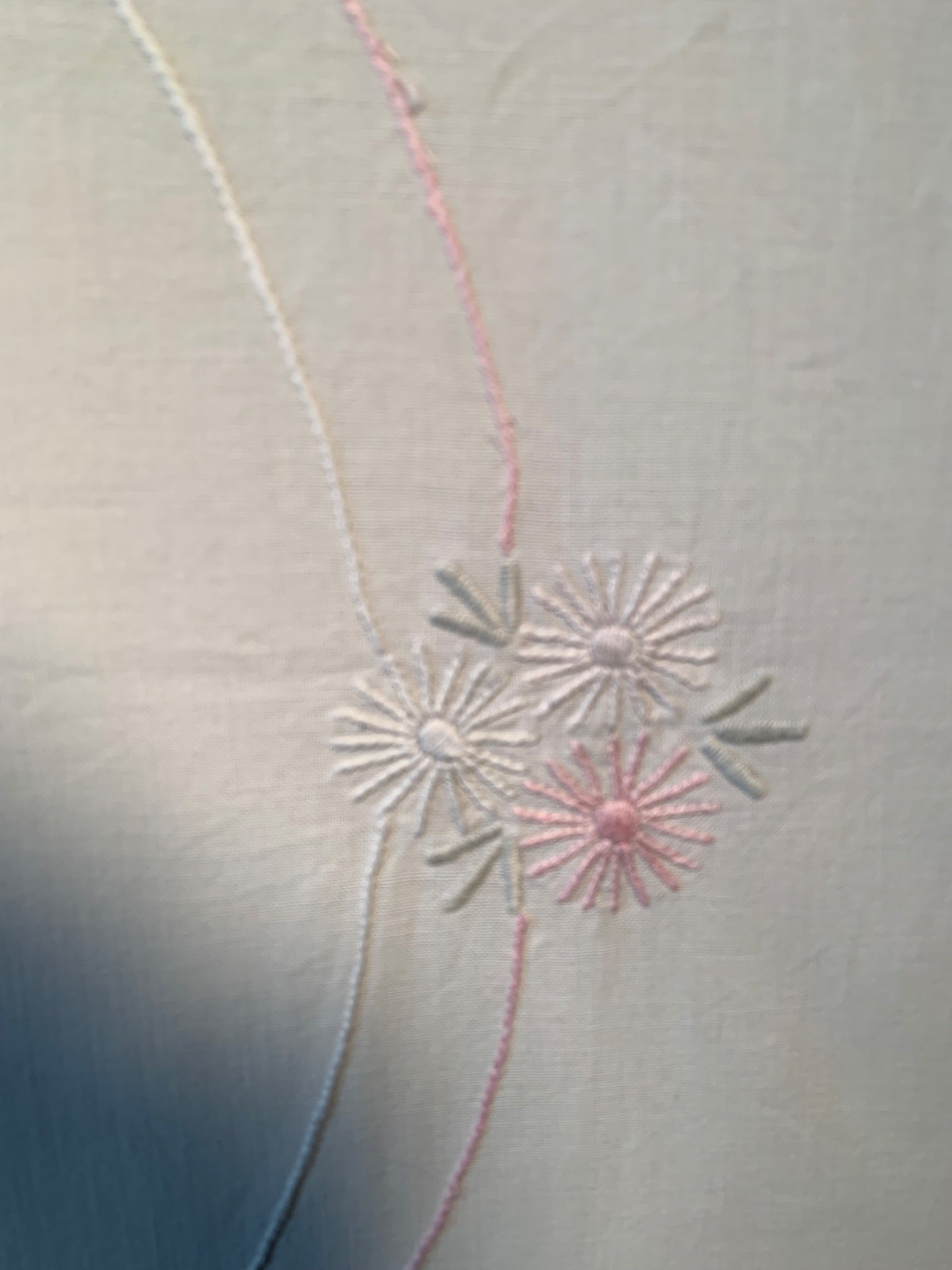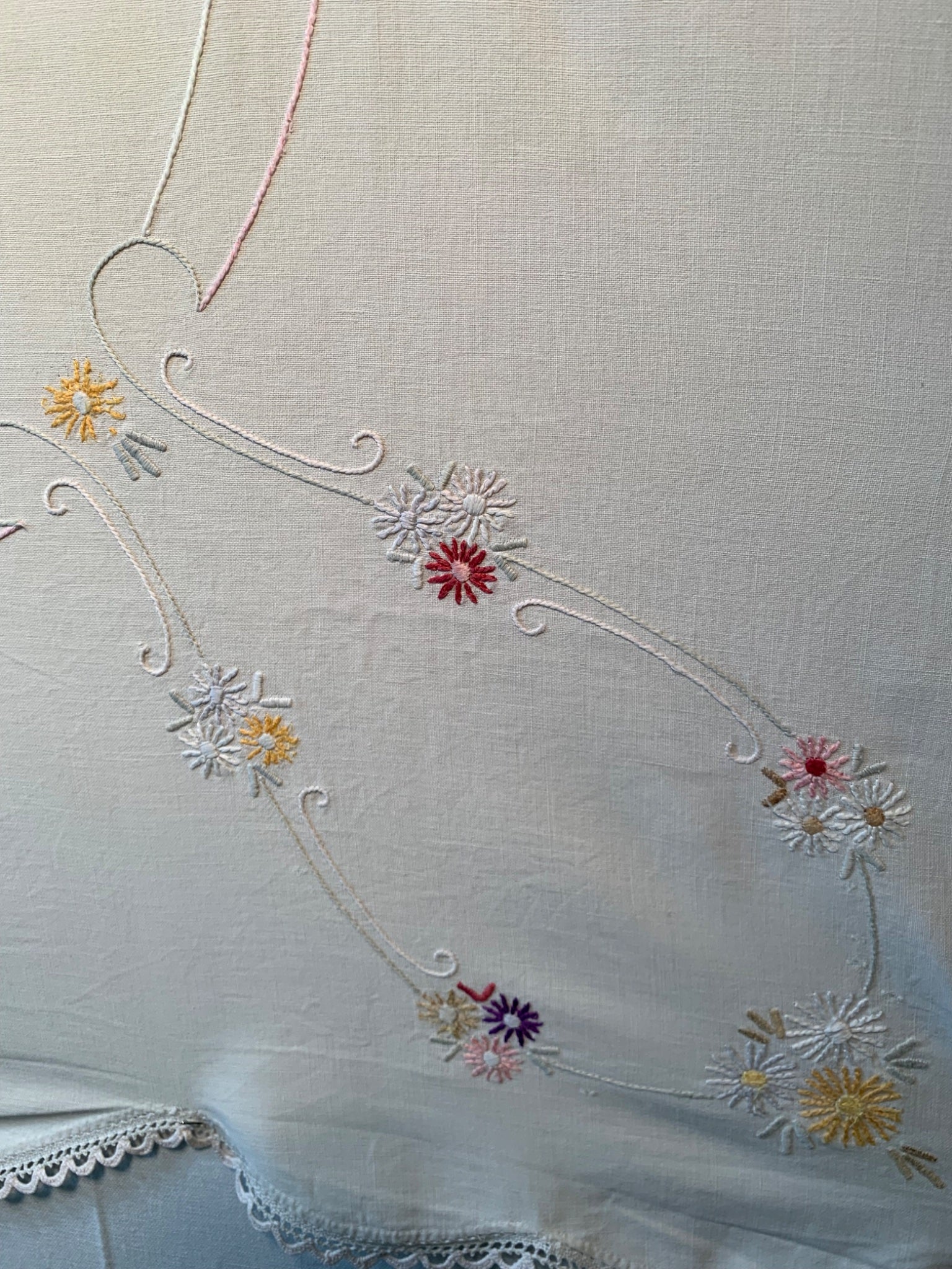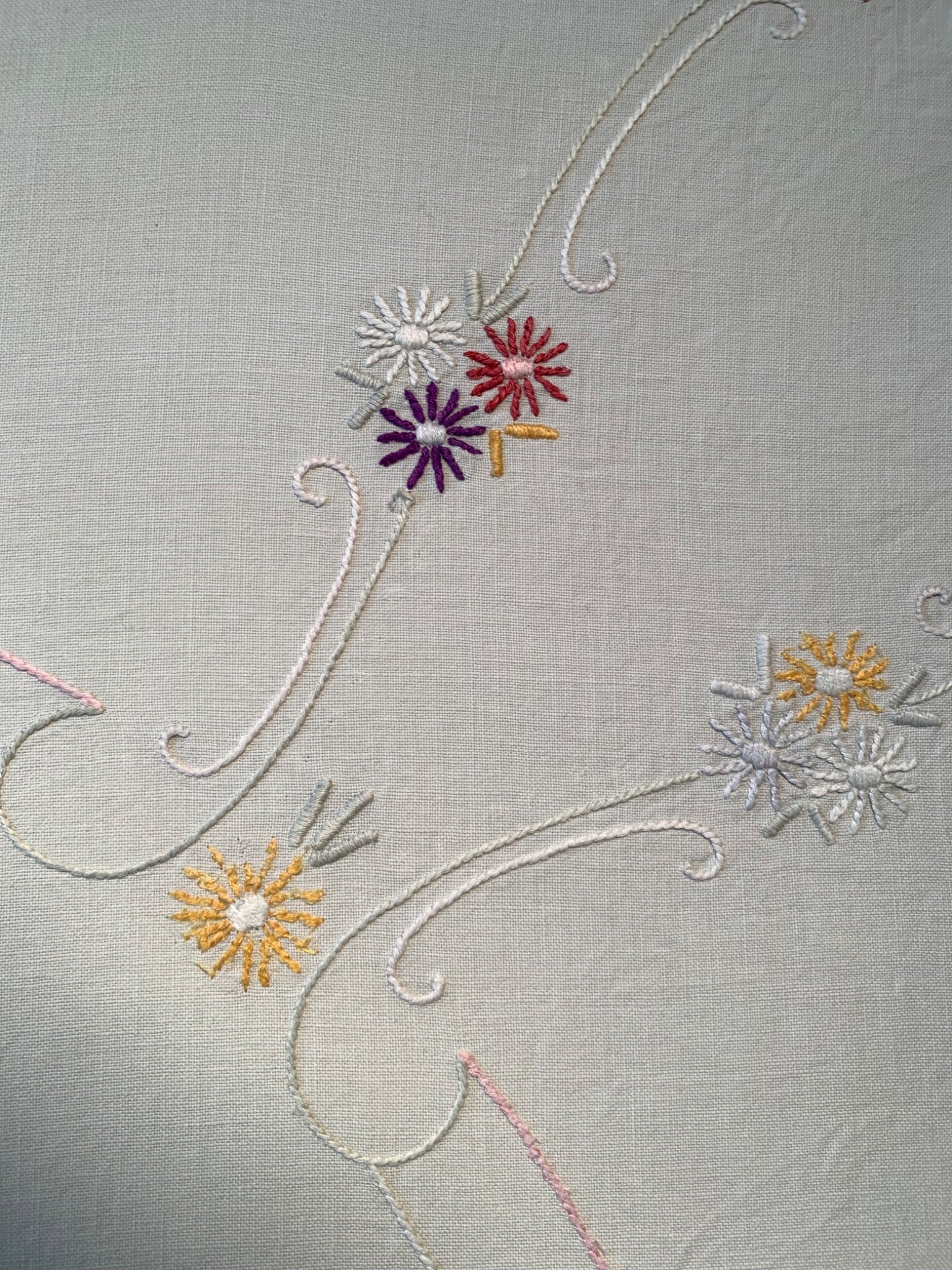 Pretty Linen hand embroidered and crochet bordered table cloth. There are a few small holes on the interior of the table cloth and near the embroidery that would need mending. There is one small unraveling of the crochet edge. Please see photo's. This table cloth would also be a good base for hand printing and dying or to use the embroidery in collage quilting or for appliqué. The embroidered flowers are multi colors of gold, white, maroon, deep purple & pink. They are in a three flower tear drop design to the corners & connected with chain and satin stitch lines circling the center table cloth. The crochet edge is of a small loop design.