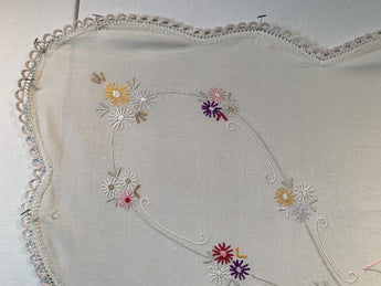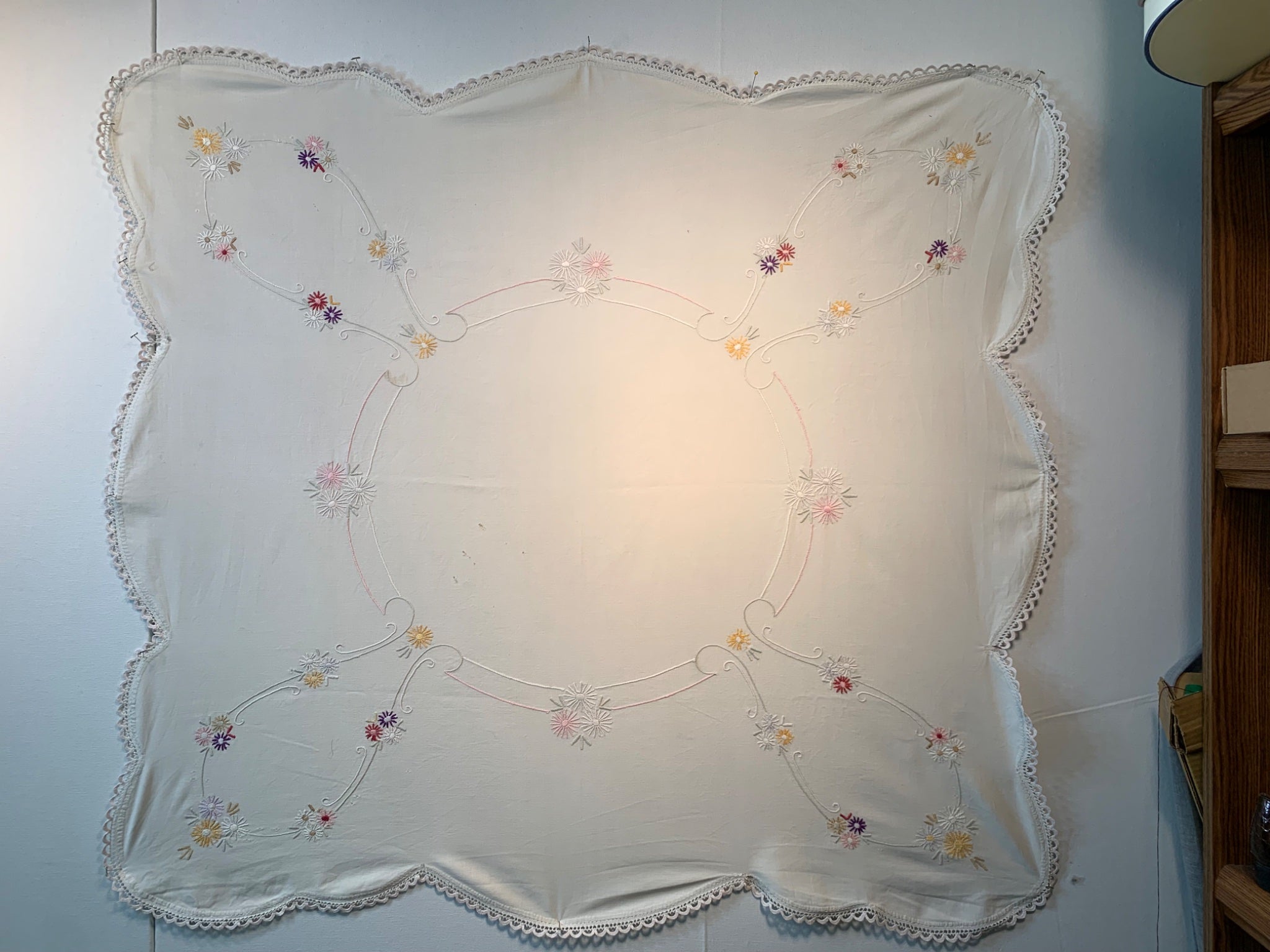 Scalloped Edge Crochet Satin Stitched Floral Pastel Design Table Cloth 40”W X 37”L