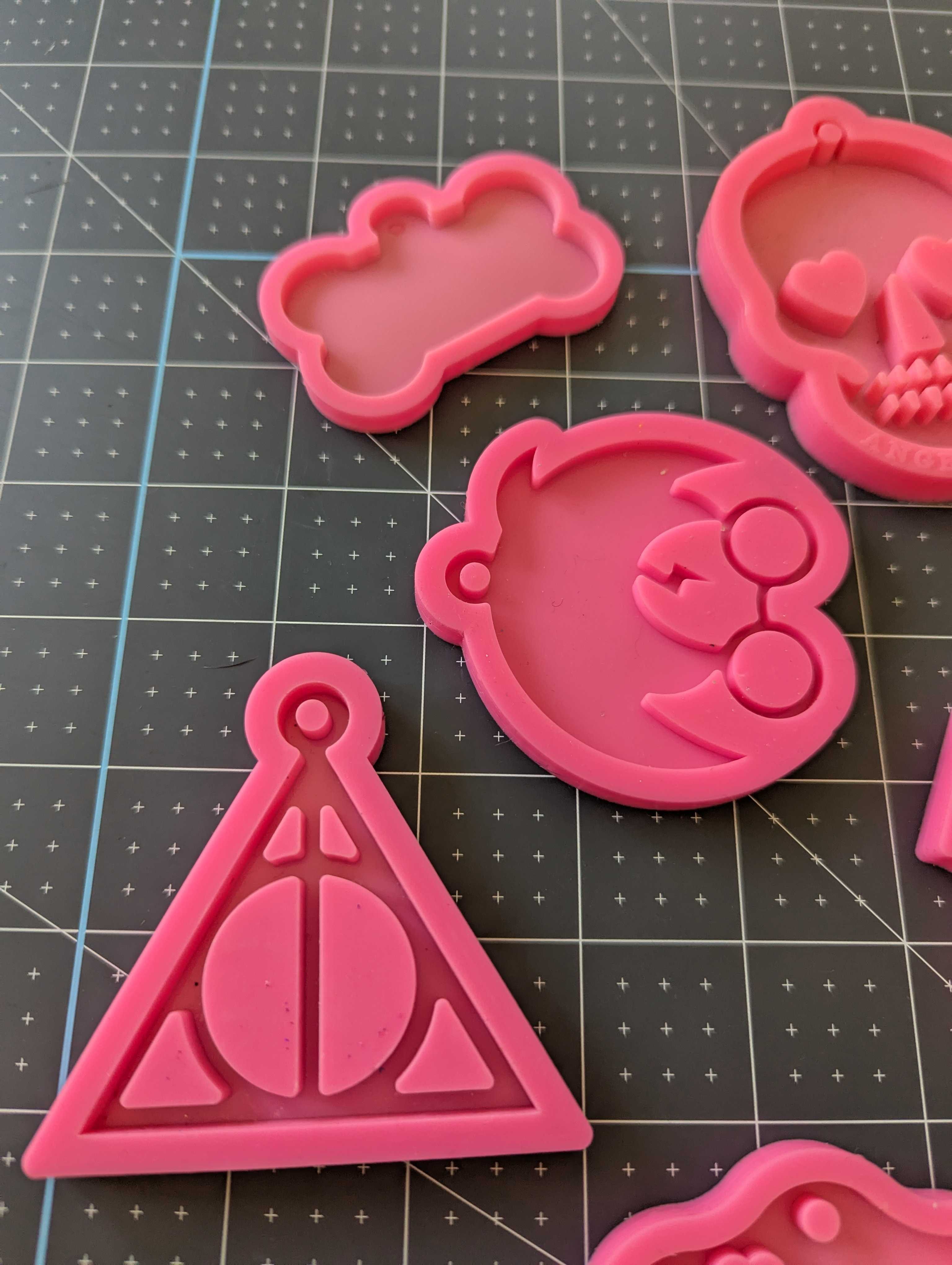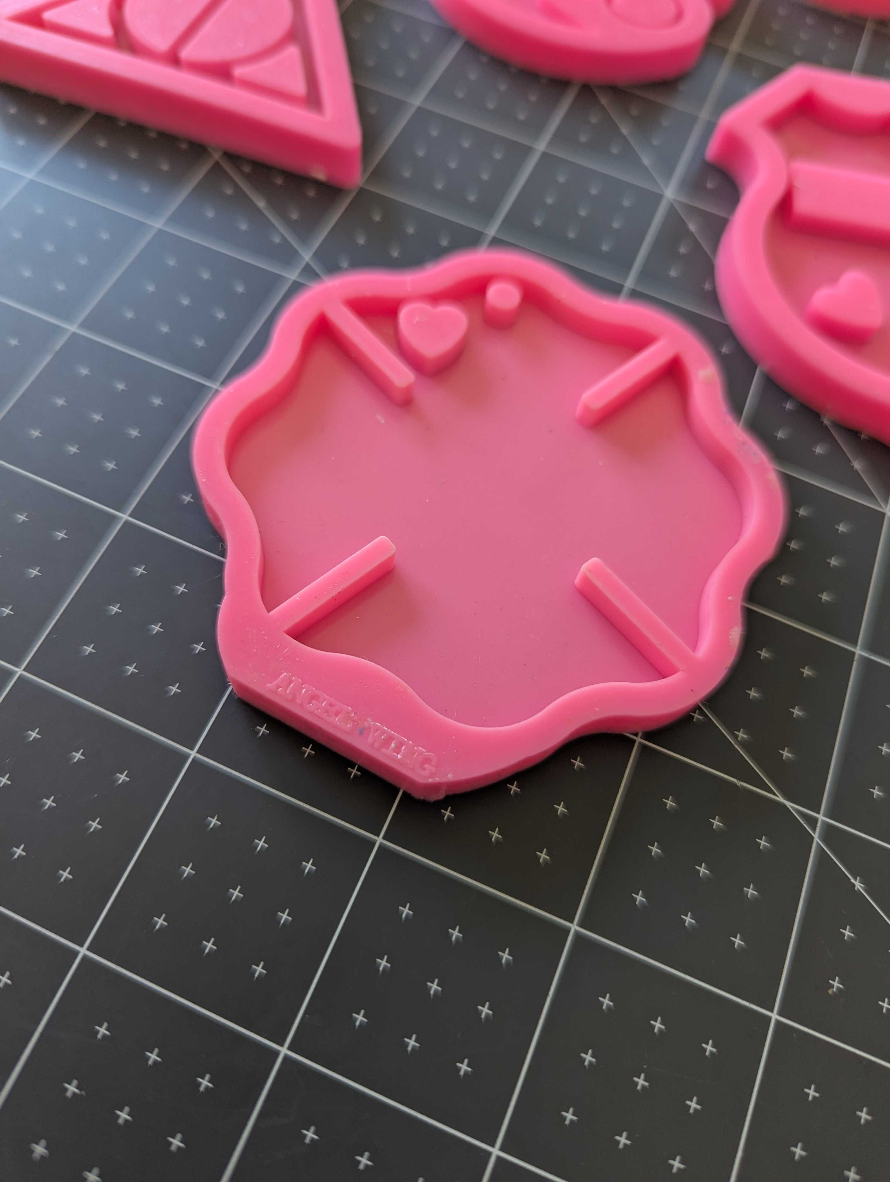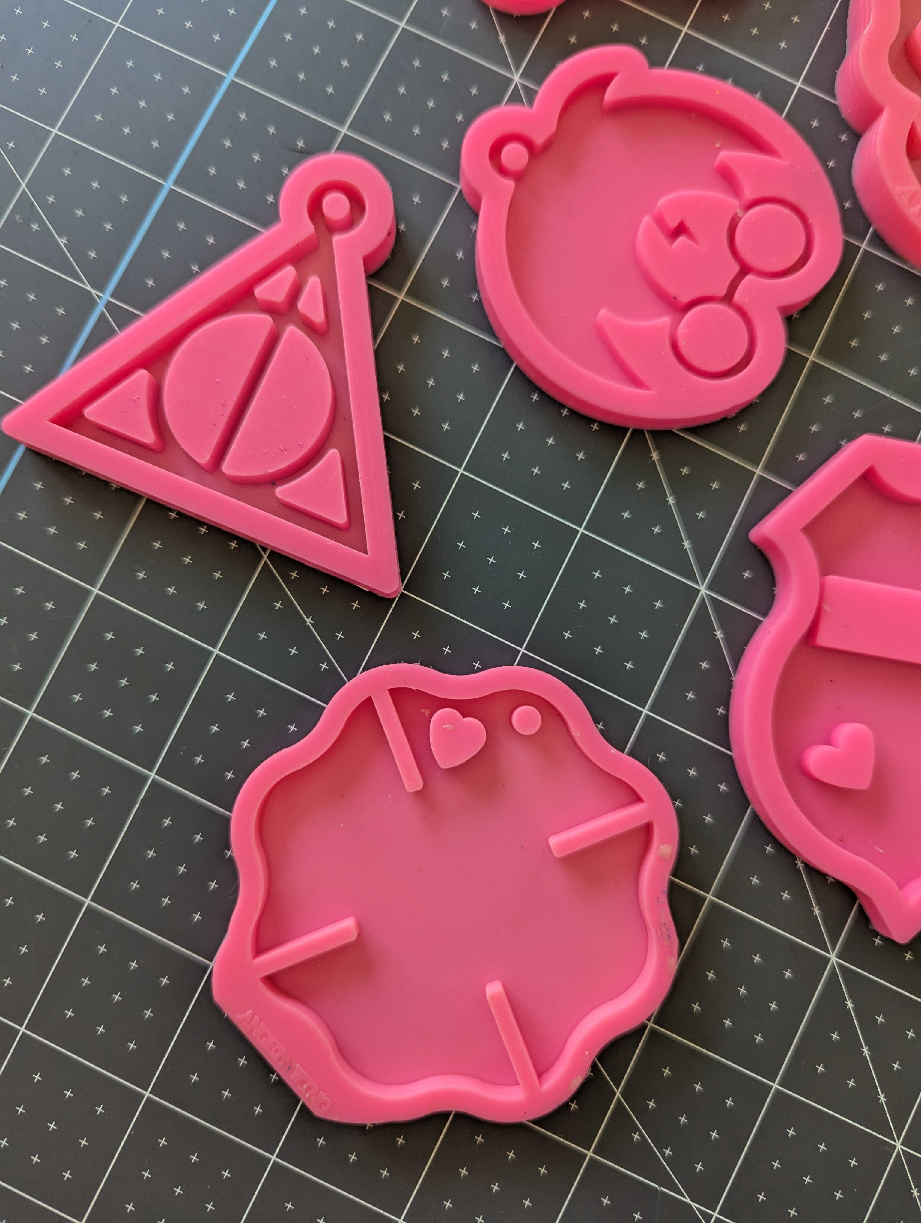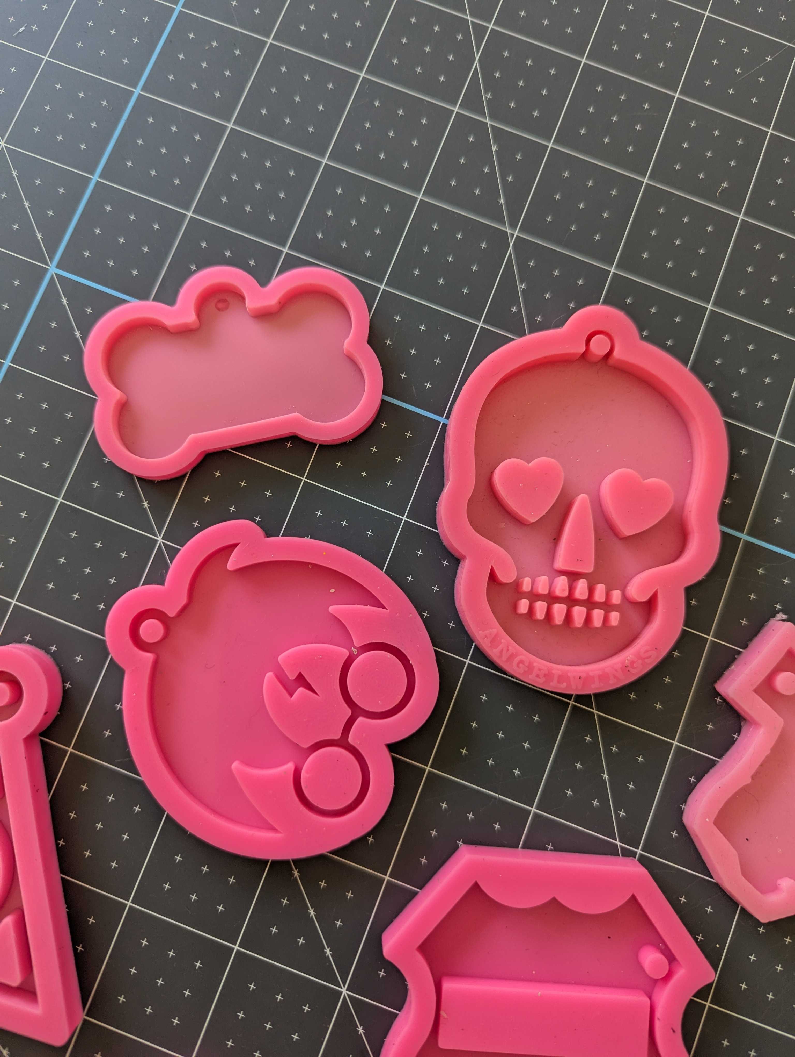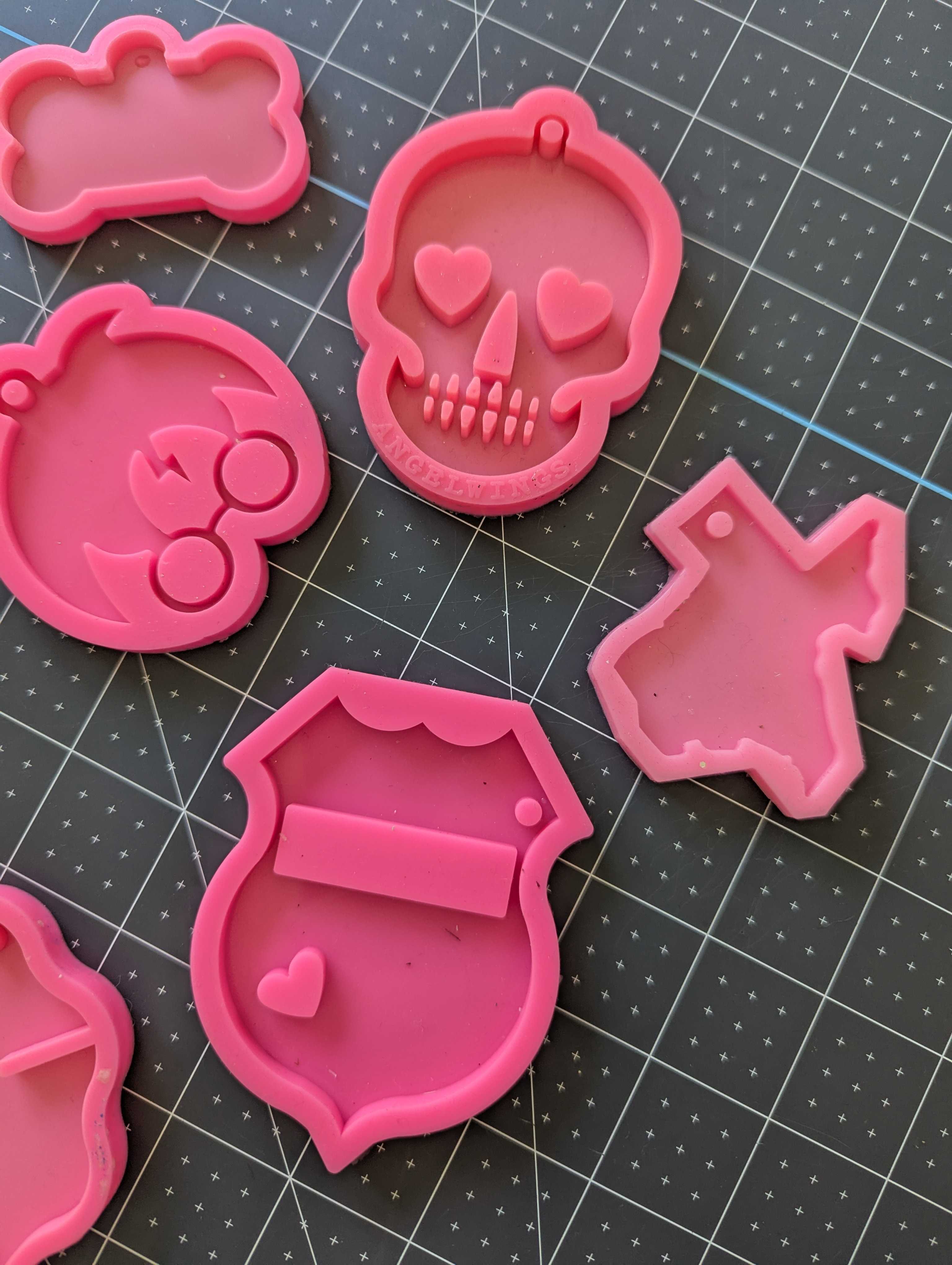 A set of molds, likely used for resin by previous owner. Recommend cleaning if intending to use for baking. Molds are in good condition, ready for their next home. Mat board is in inches for size reference.