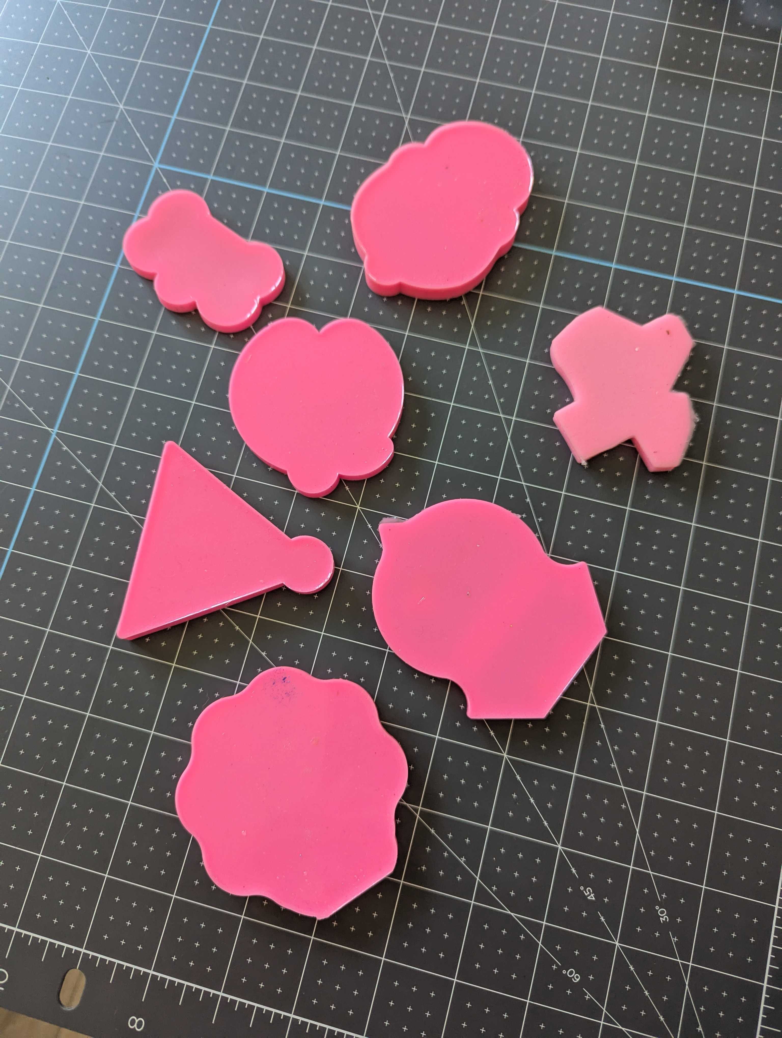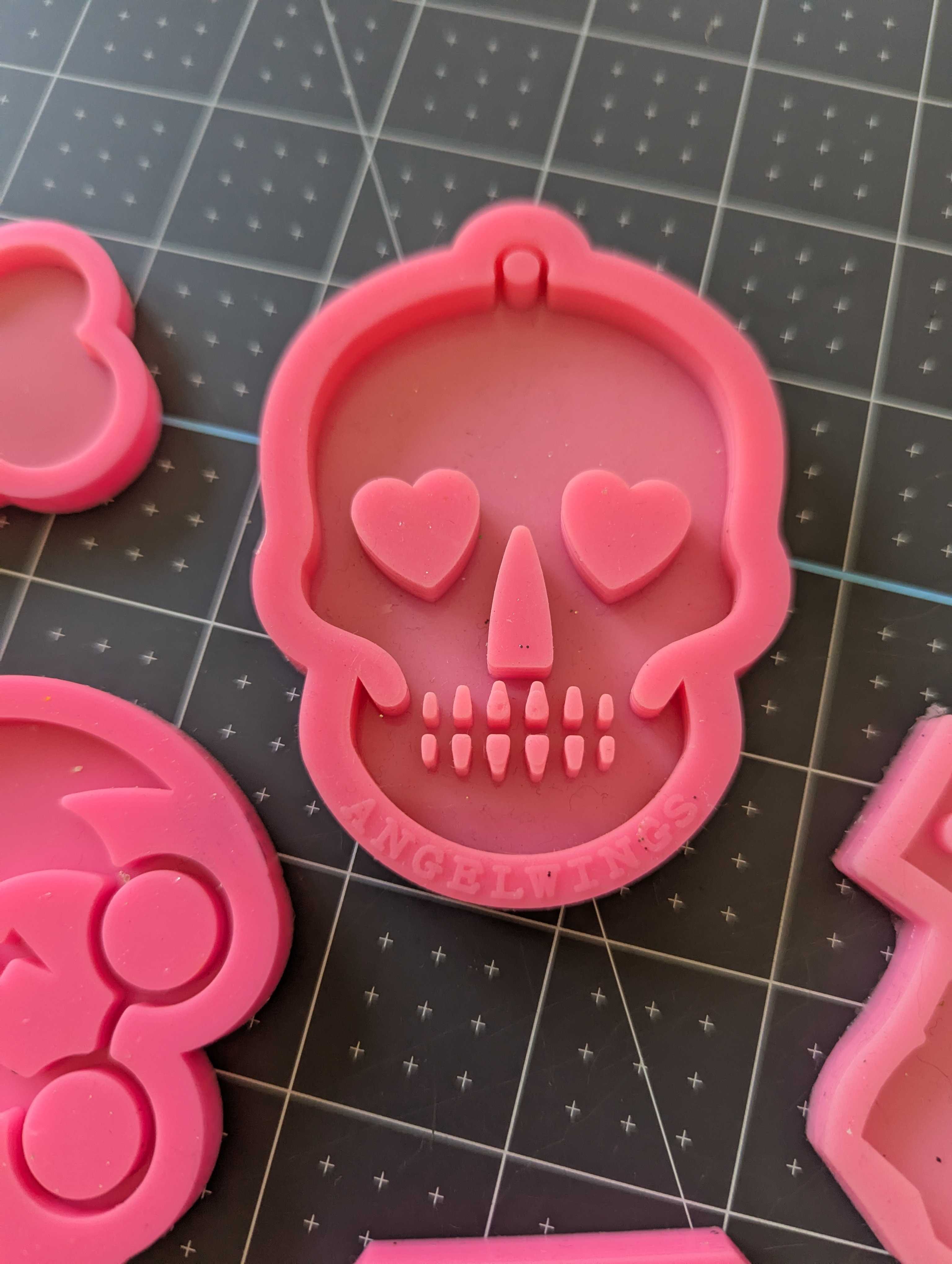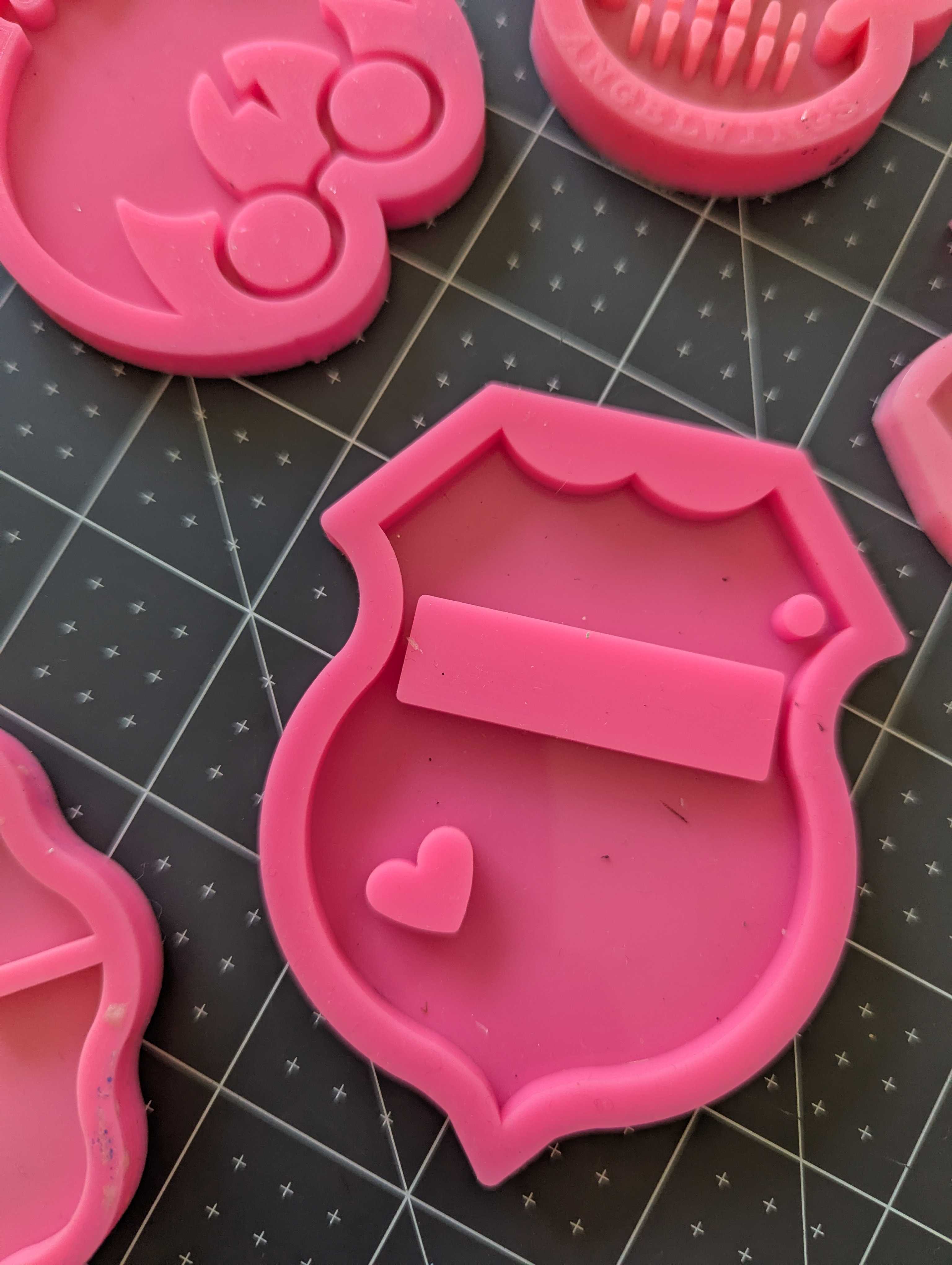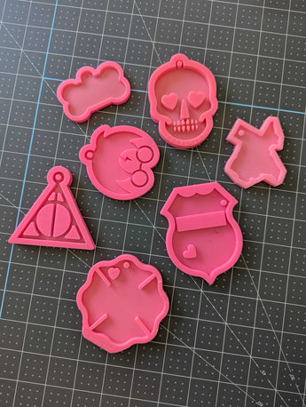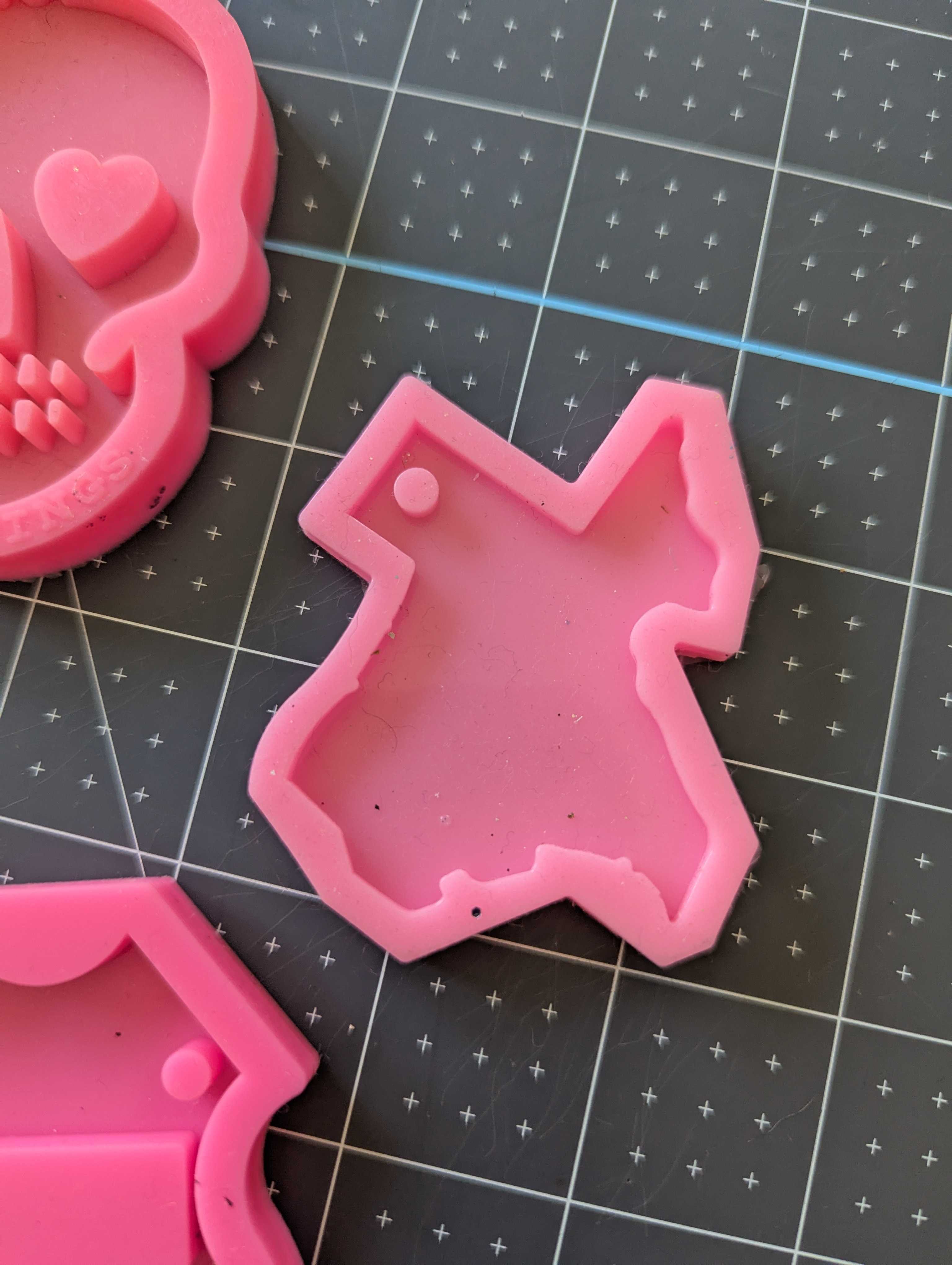 A set of molds, likely used for resin by previous owner. Recommend cleaning if intending to use for baking. Molds are in good condition, ready for their next home. Mat board is in inches for size reference.