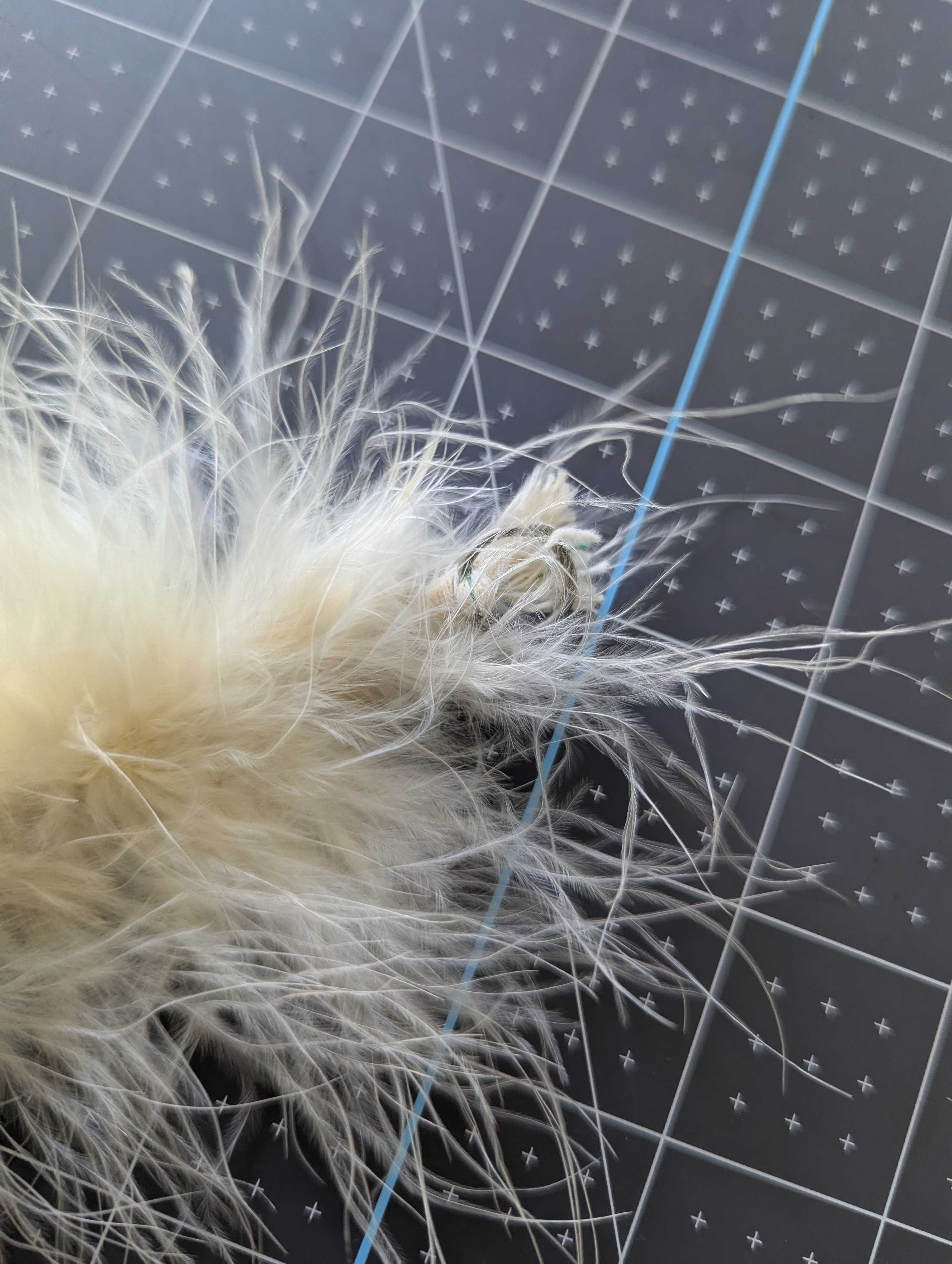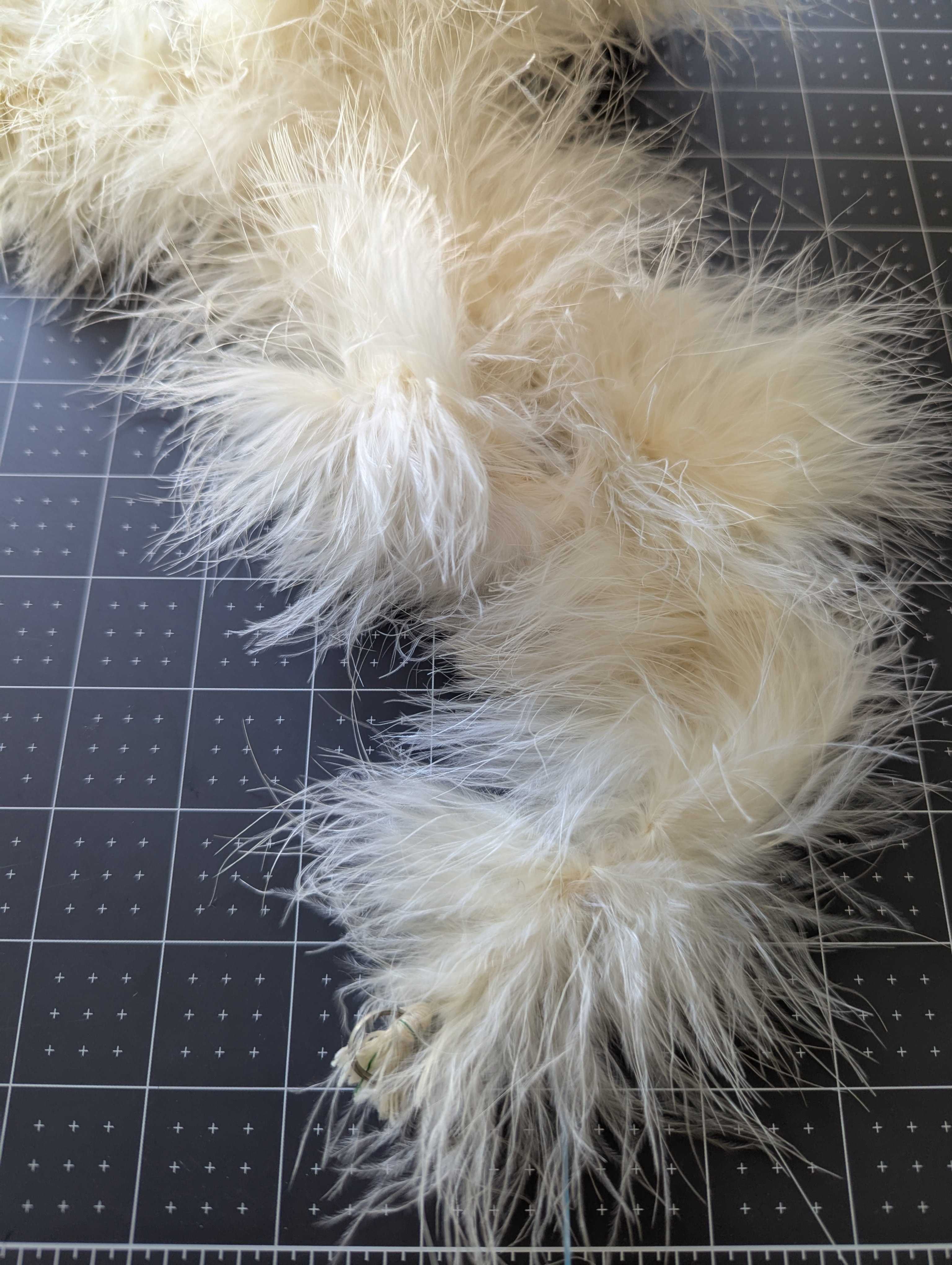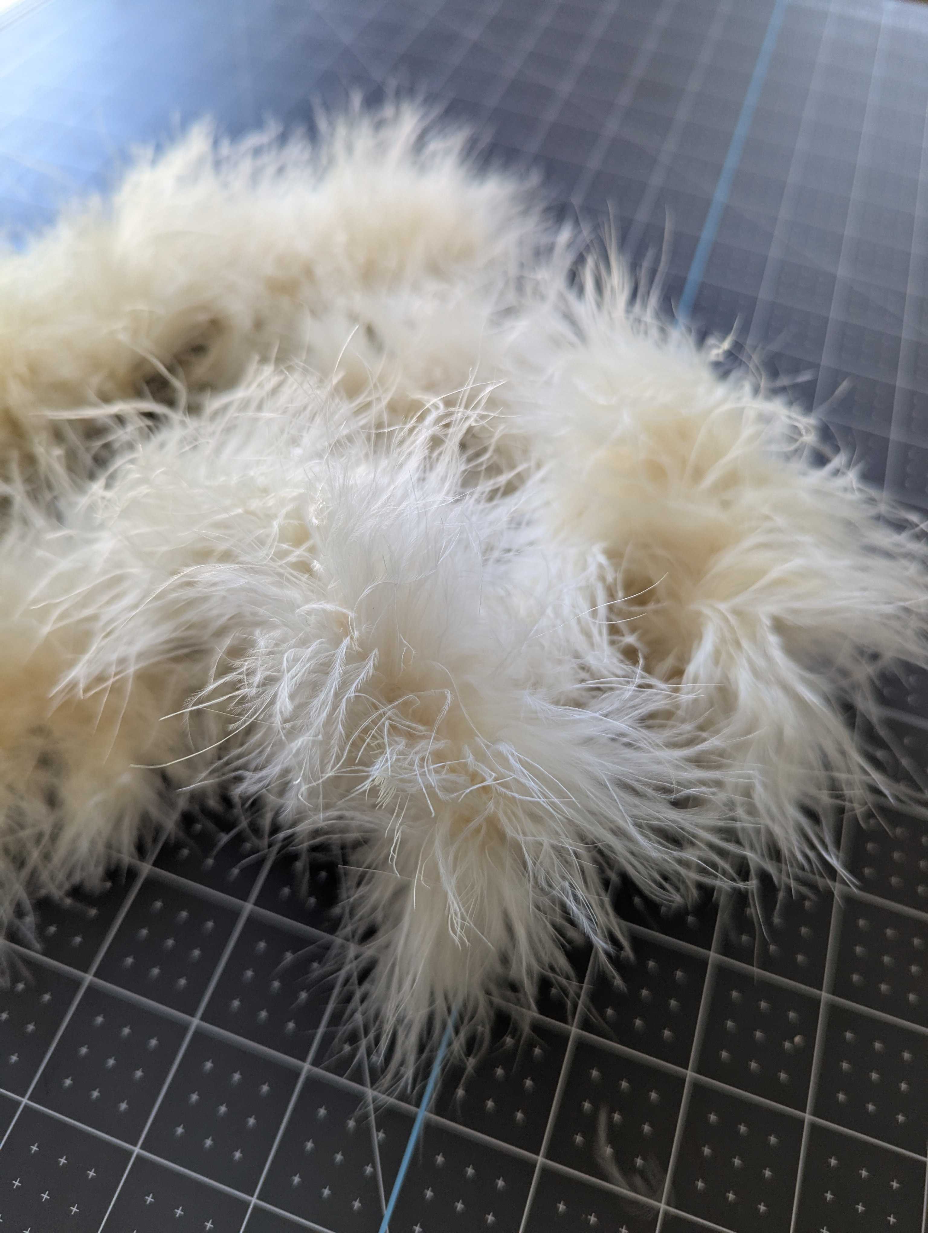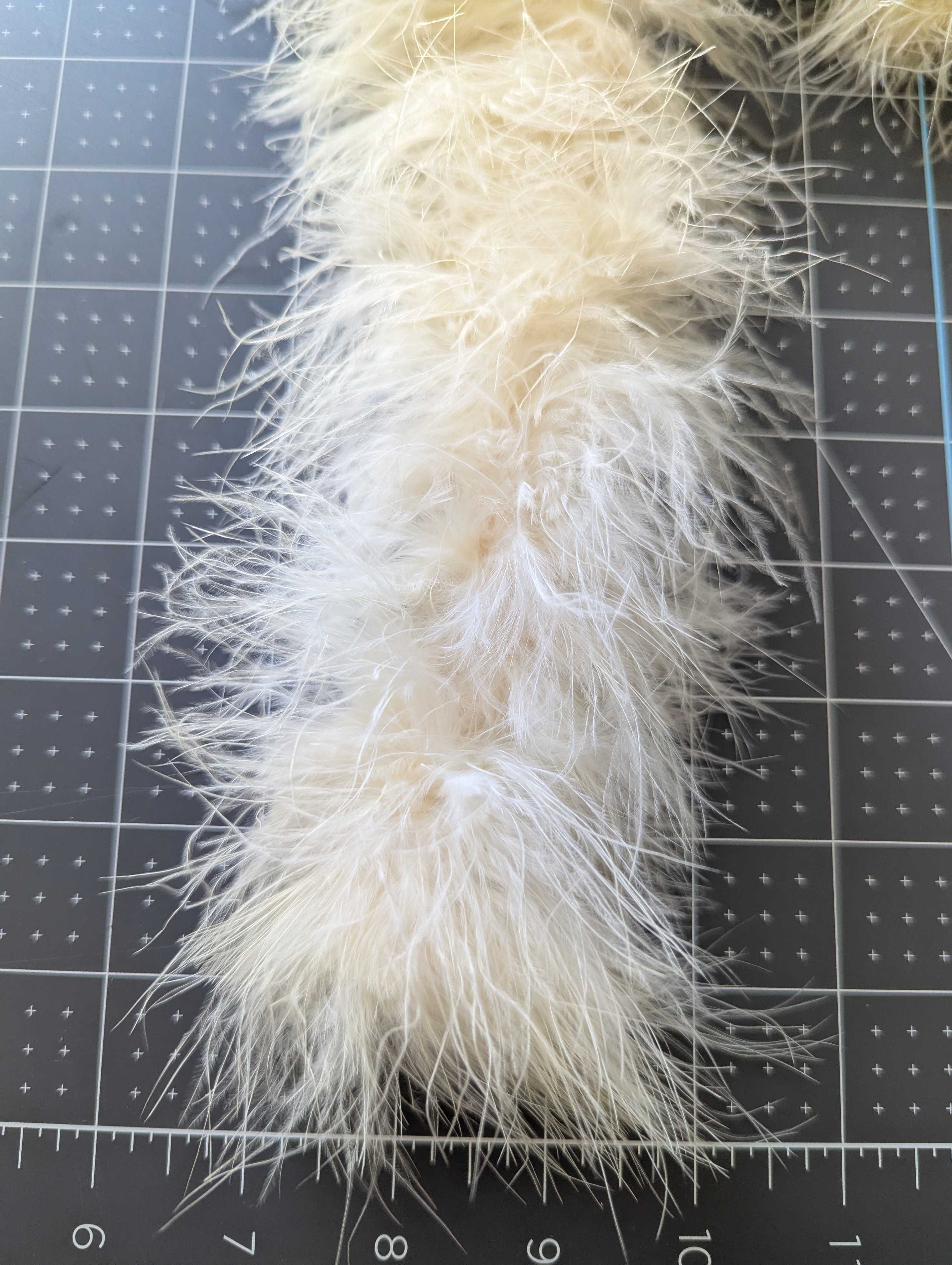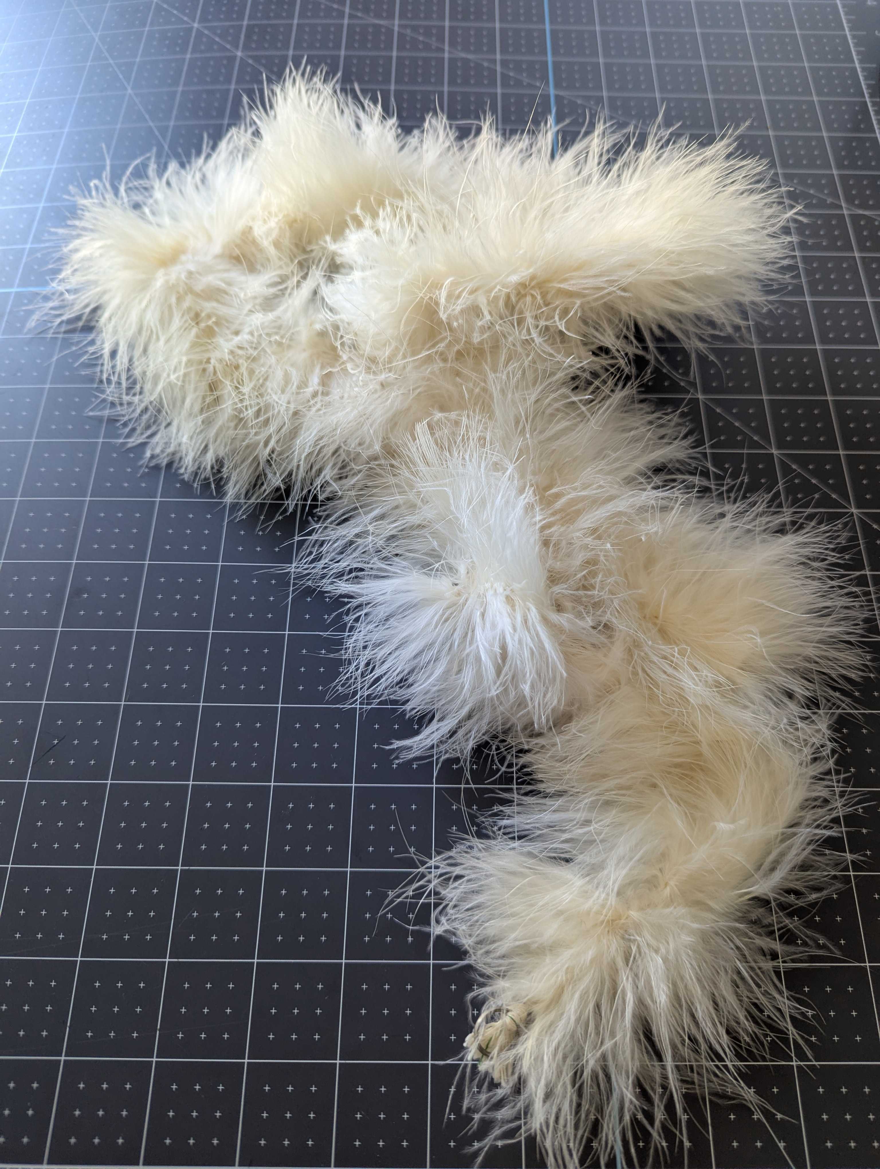 A single piece of ultra soft feathers in a natural cream color. About 3 inches wide with feather fringe laid out. 37 inches long. Has a loop on one end in metal.
