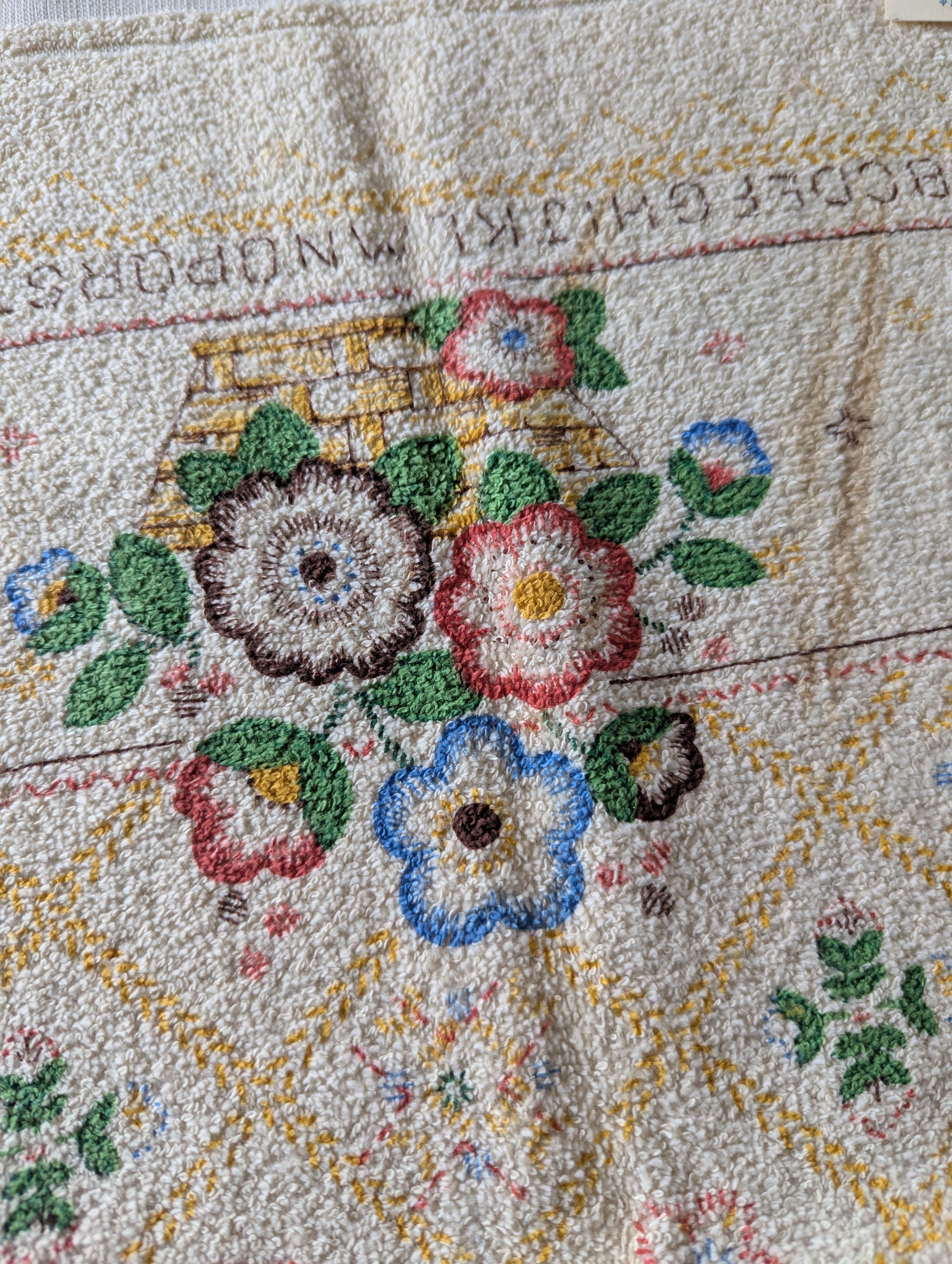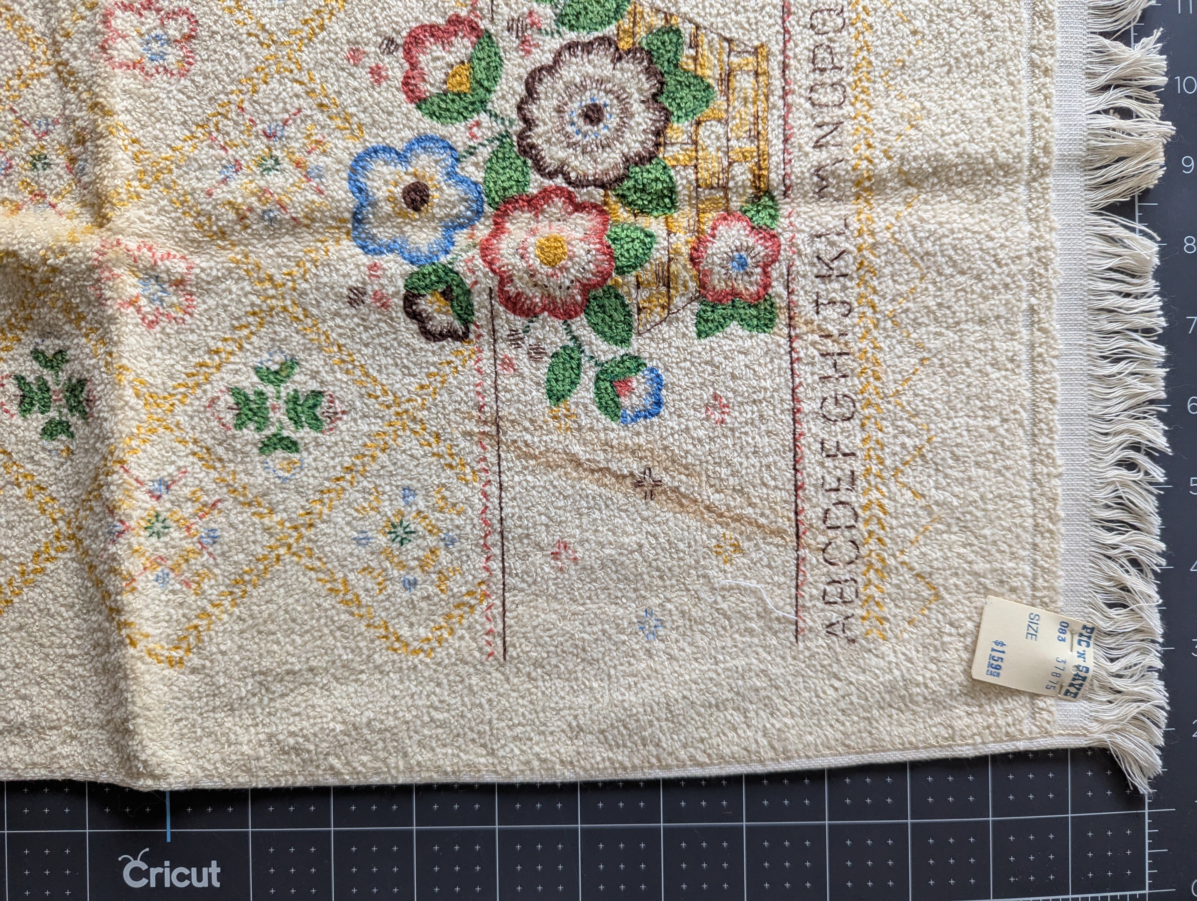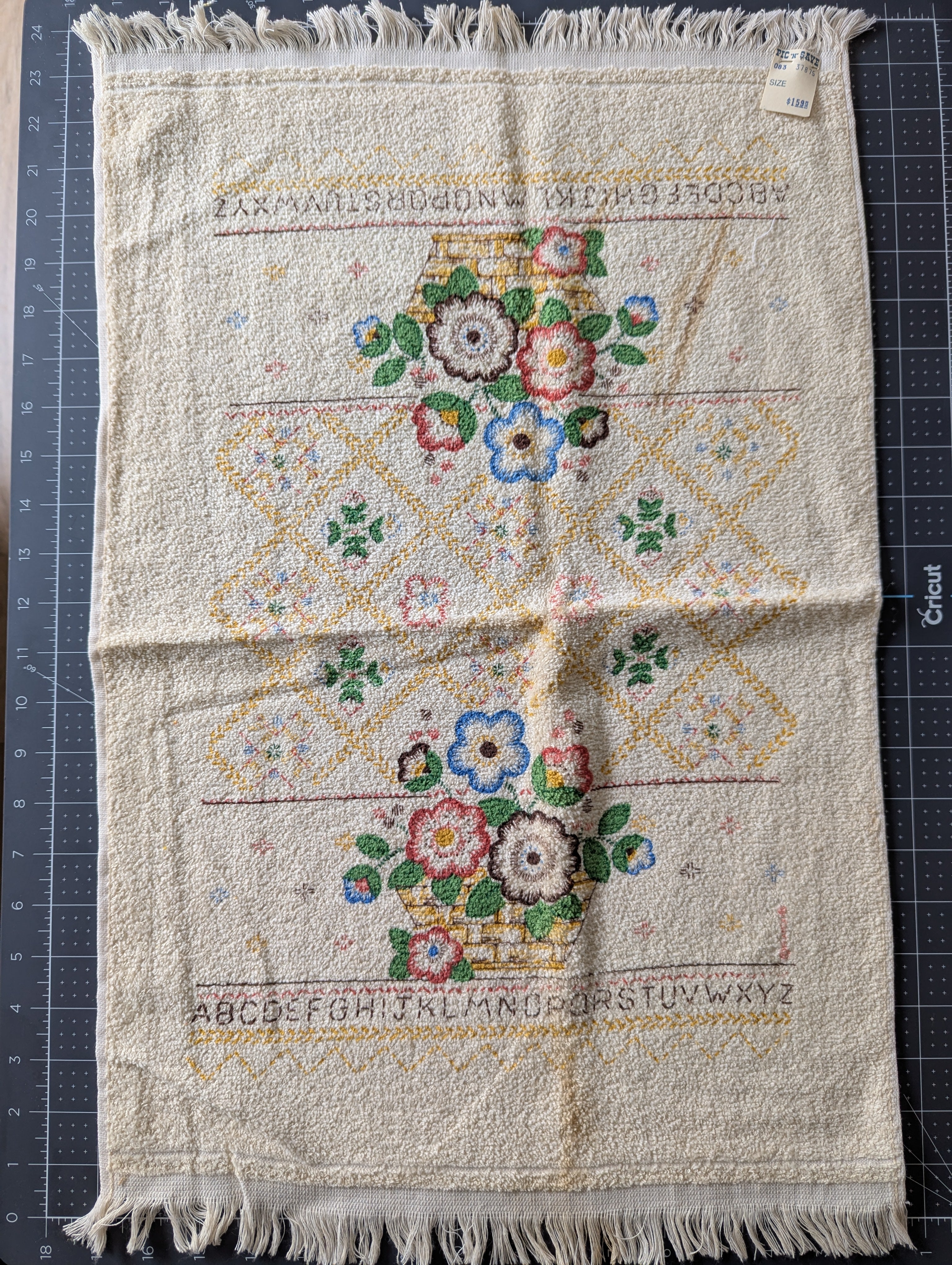 Vintage towel found in a craft supply bin from an old crafter. Still has the pick 'n save tag on. Some discoloration due to age not use.