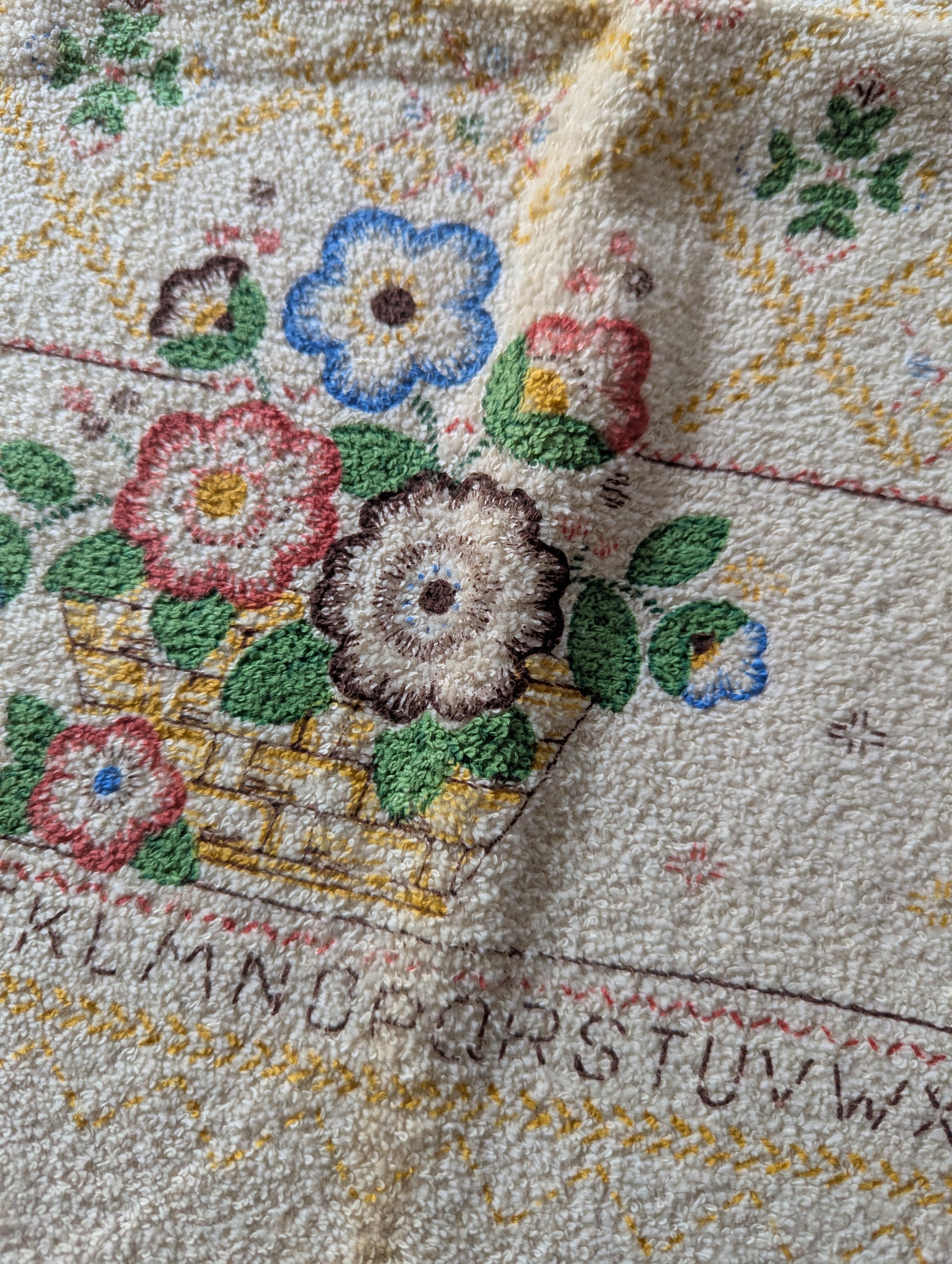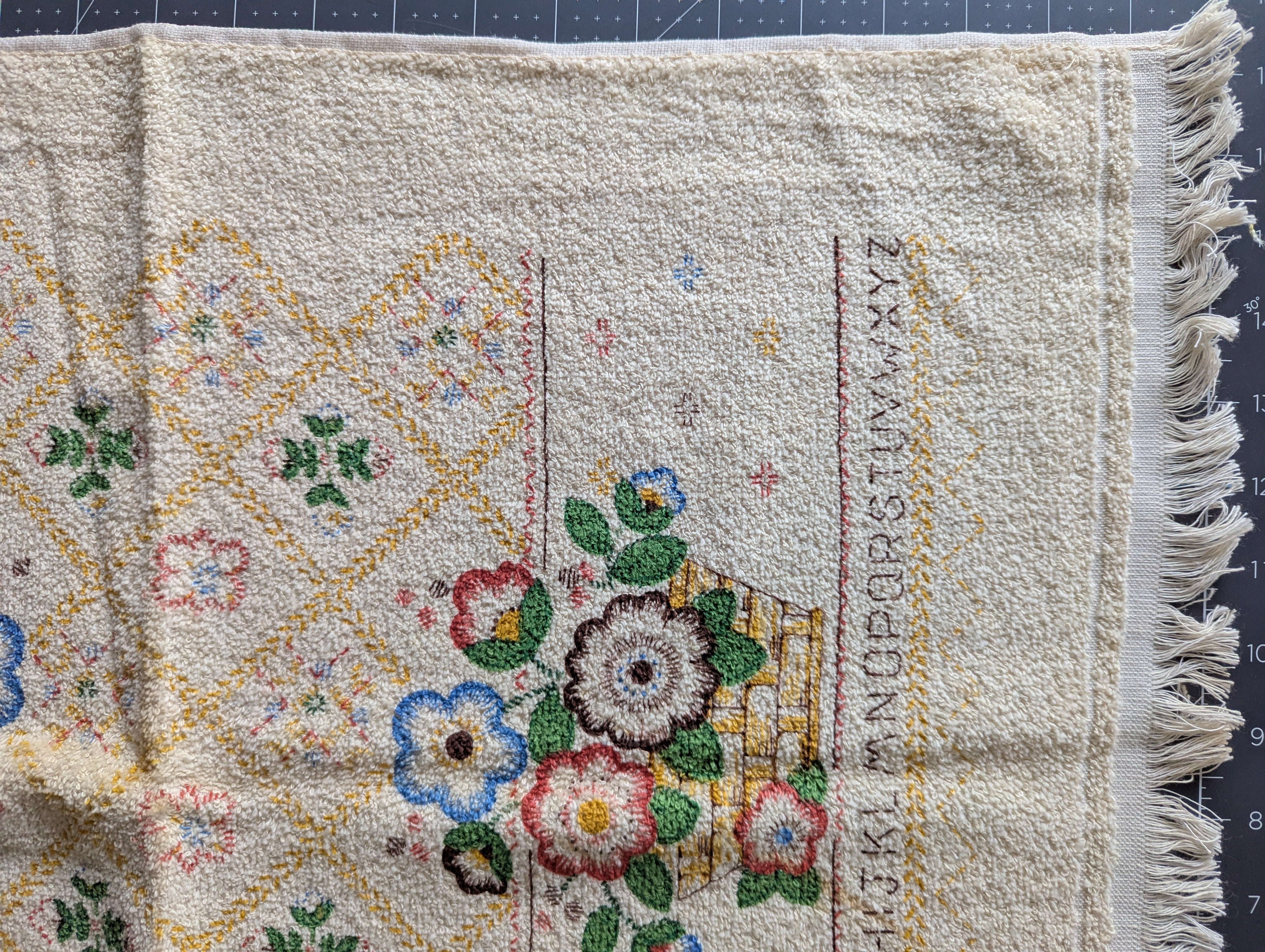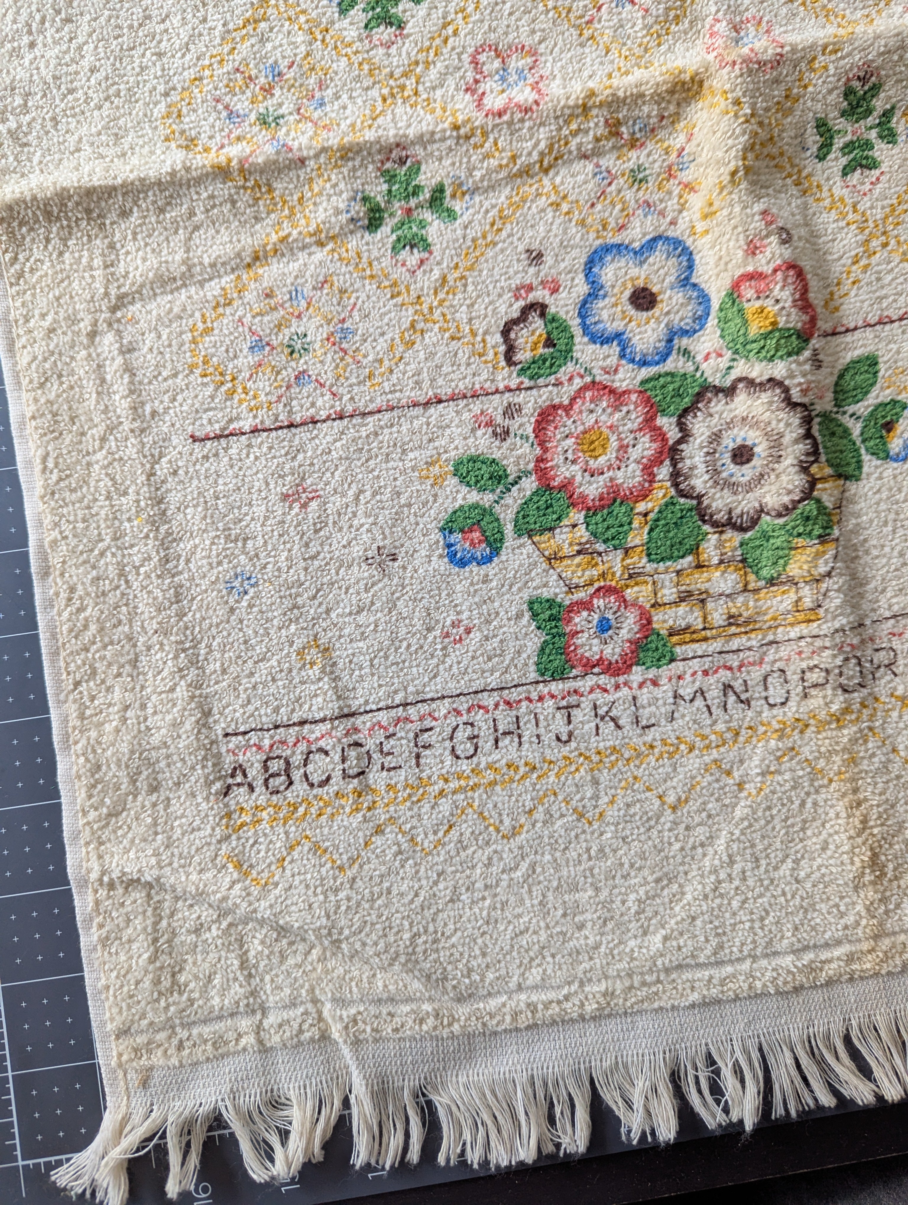 Vintage towel found in a craft supply bin from an old crafter. Still has the pick 'n save tag on. Some discoloration due to age not use.