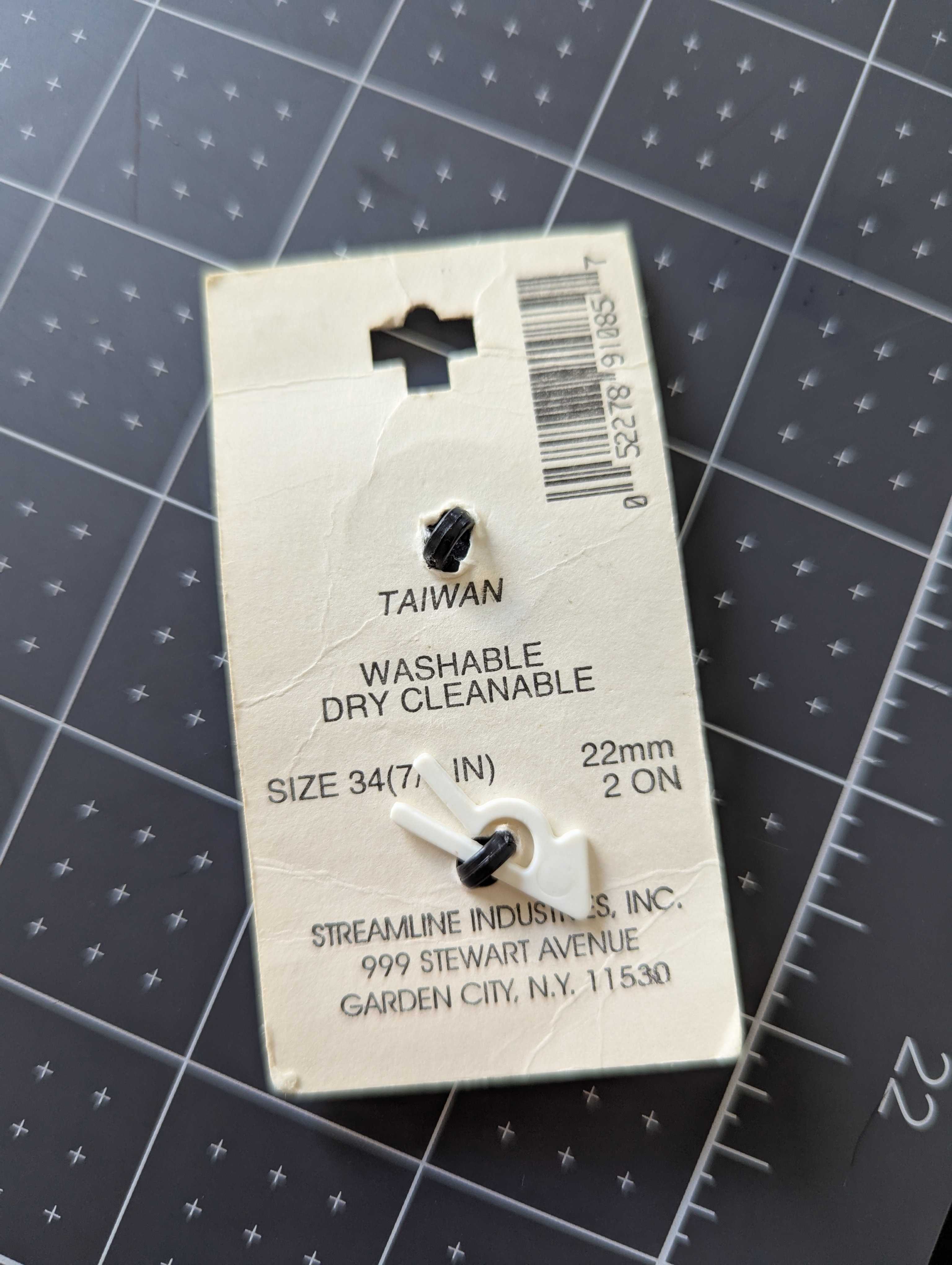 A set of two buttons, made in Taiwan. Washable/dry cleanable. Streamline Industries, Inc.