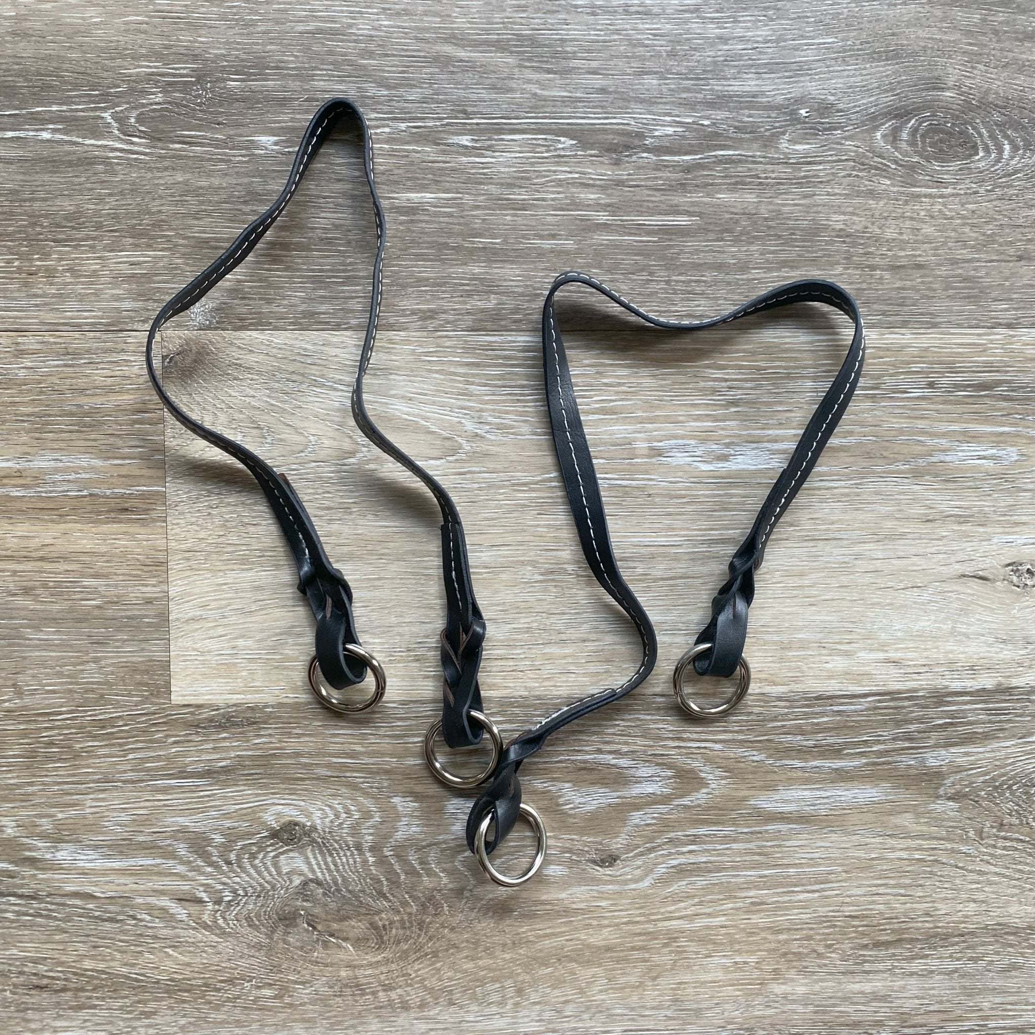 A pair of purse handles.  They are black vinyl and have a silver-tone o-ring for attachment.  They are 22.5" long.