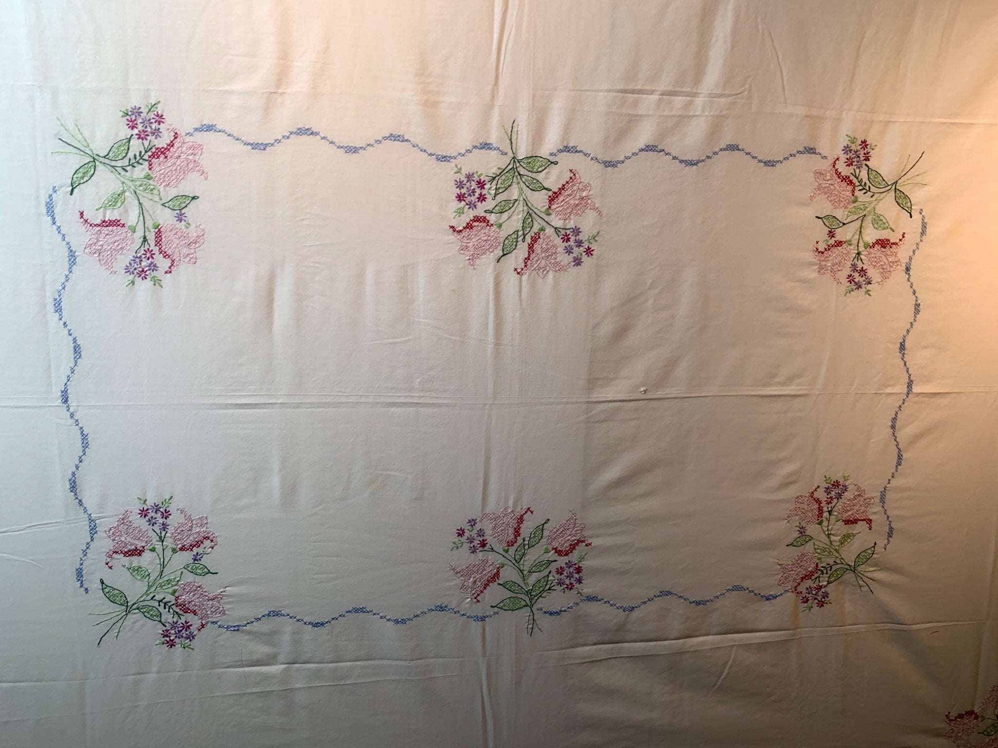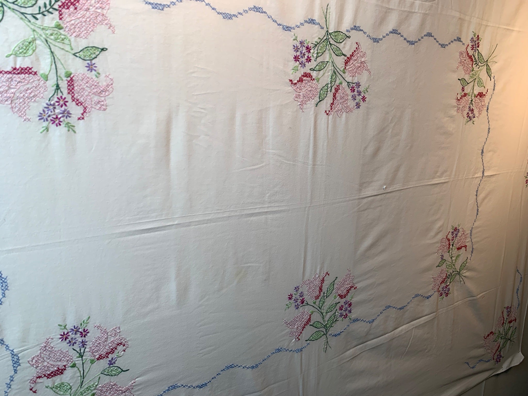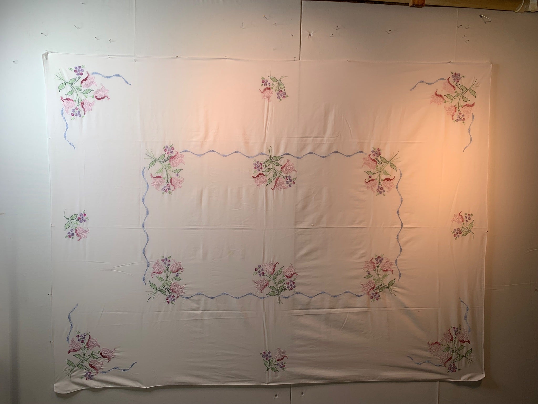 Beautiful Pastel Multi-colored rectangular Tulip Design table cloth. 100% Cotton with cross stitch embroidery throughout the piece. No rips, tears holes, stains or snags. This seriously looks like it was never used. Gorgeous piece to use for a spring table setting or in fabric collage or appliqué work. 67" L X 50"W Just five inches shy of two yards. When did women have time to do this amazing repetitive work? It always fascinates me. But then, I just love textiles. I hope you do too.
