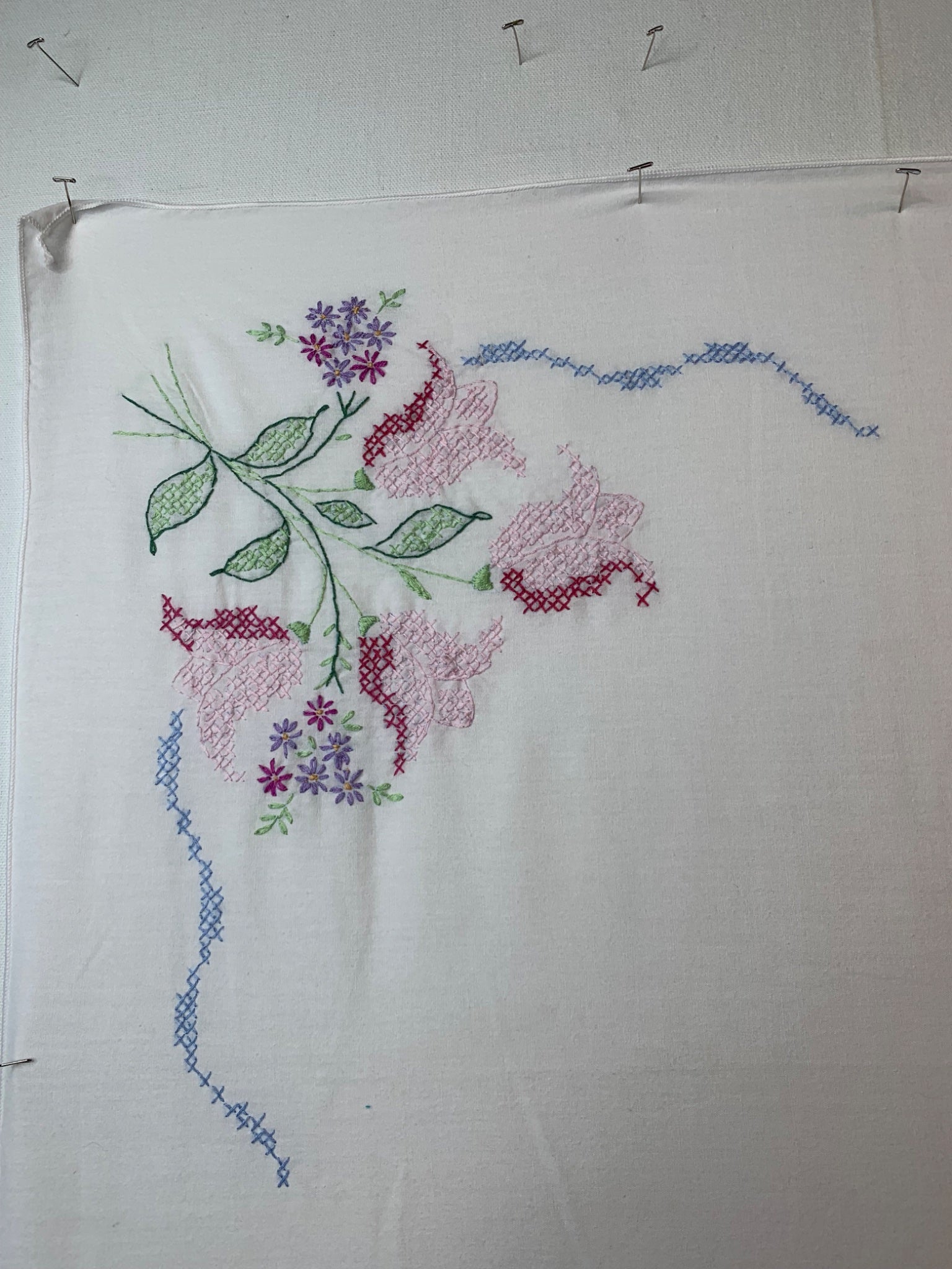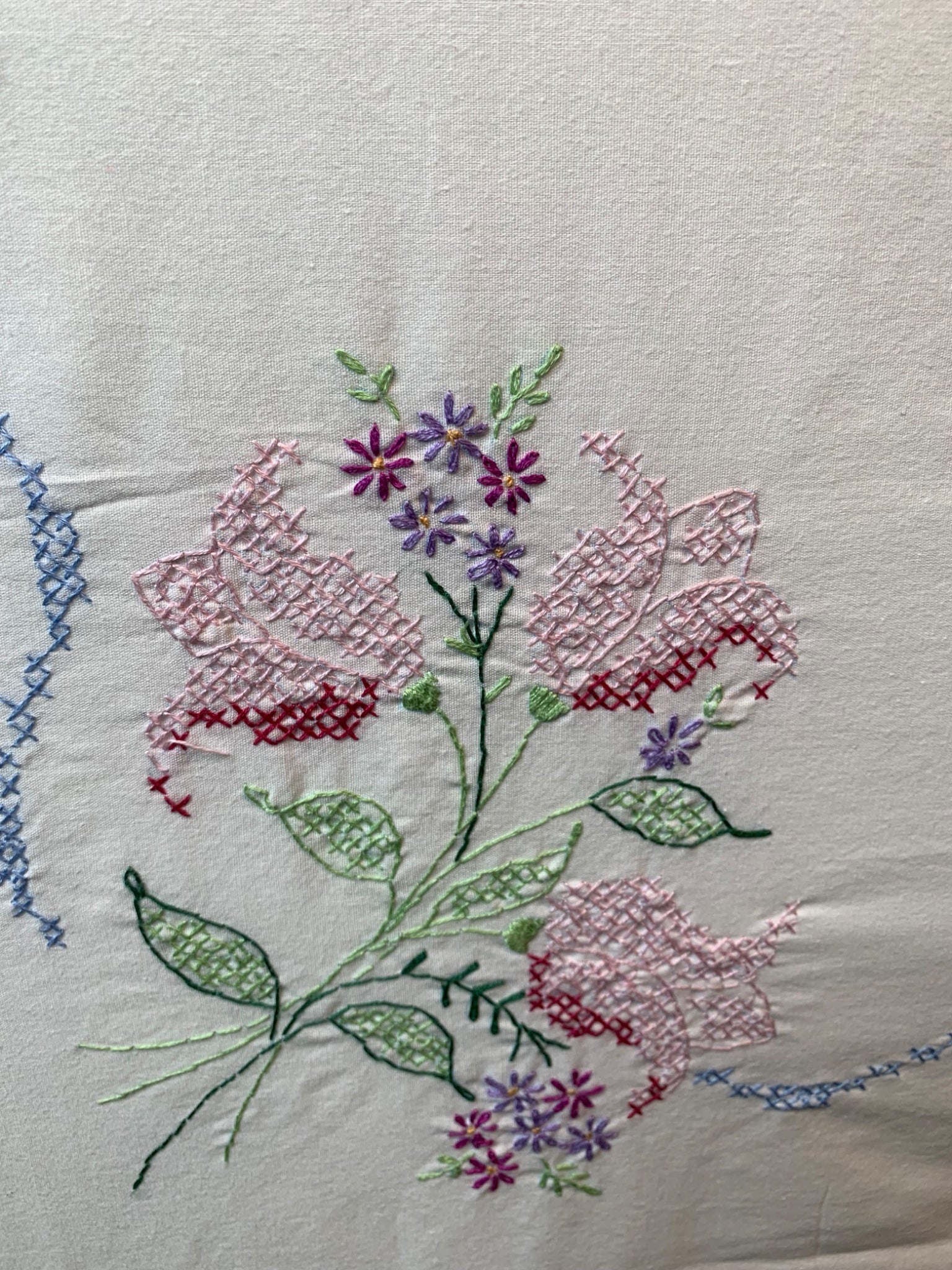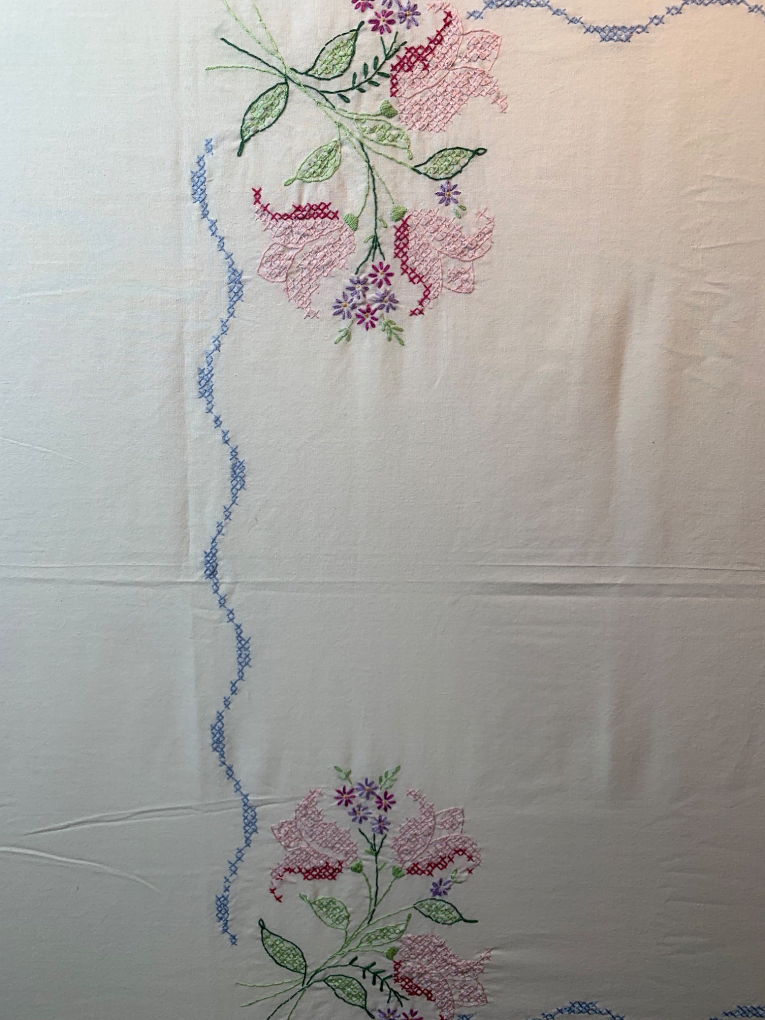 Beautiful Pastel Multi-colored rectangular Tulip Design table cloth. 100% Cotton with cross stitch embroidery throughout the piece. No rips, tears holes, stains or snags. This seriously looks like it was never used. Gorgeous piece to use for a spring table setting or in fabric collage or appliqué work. 67" L X 50"W Just five inches shy of two yards. When did women have time to do this amazing repetitive work? It always fascinates me. But then, I just love textiles. I hope you do too.
