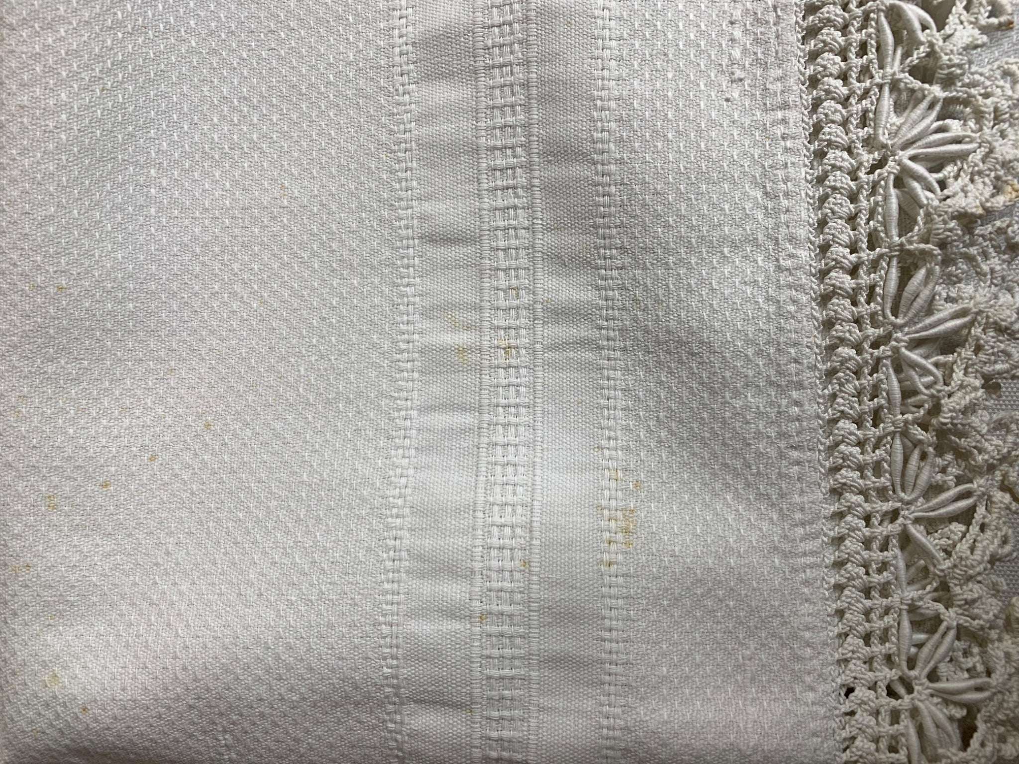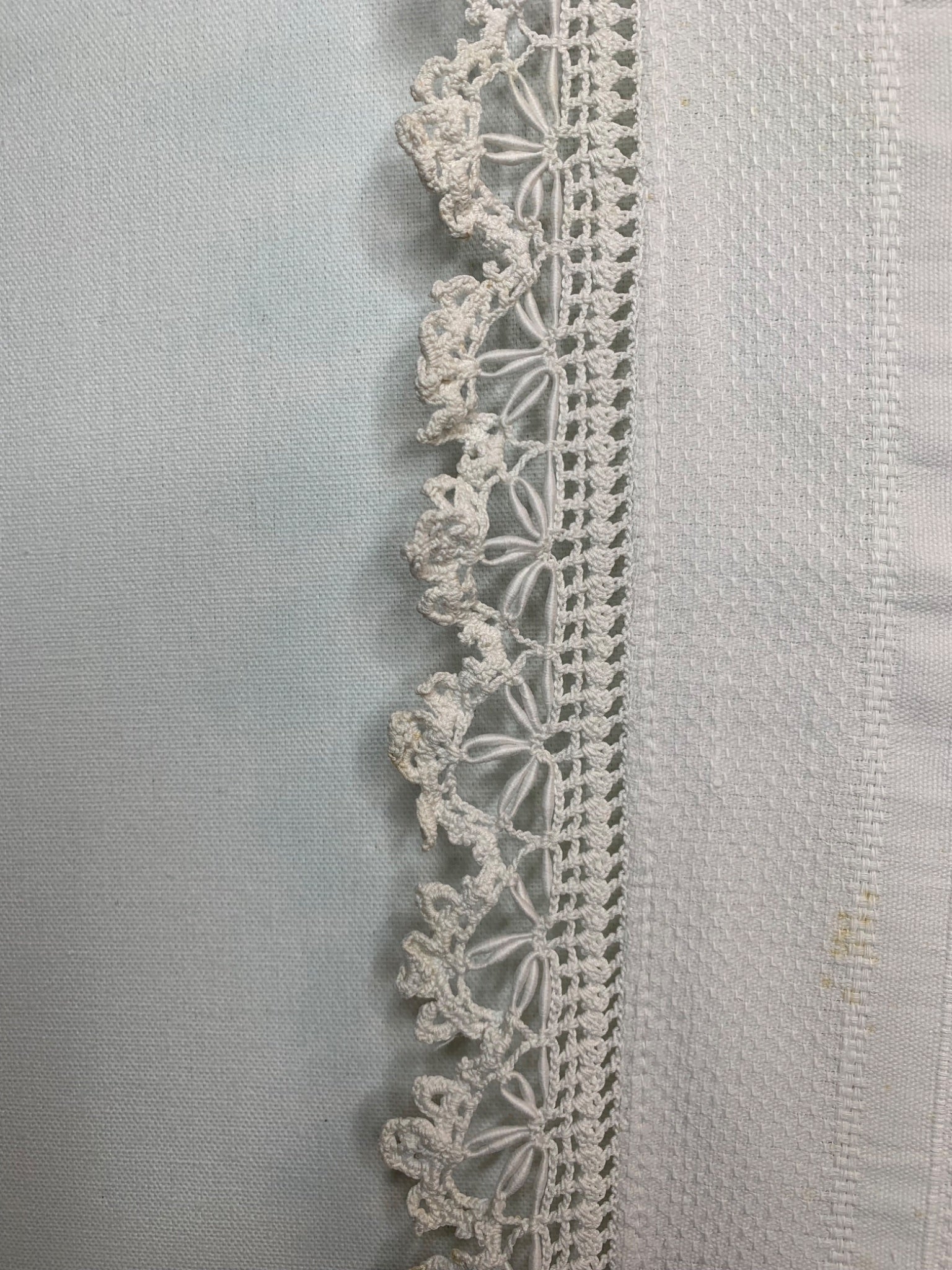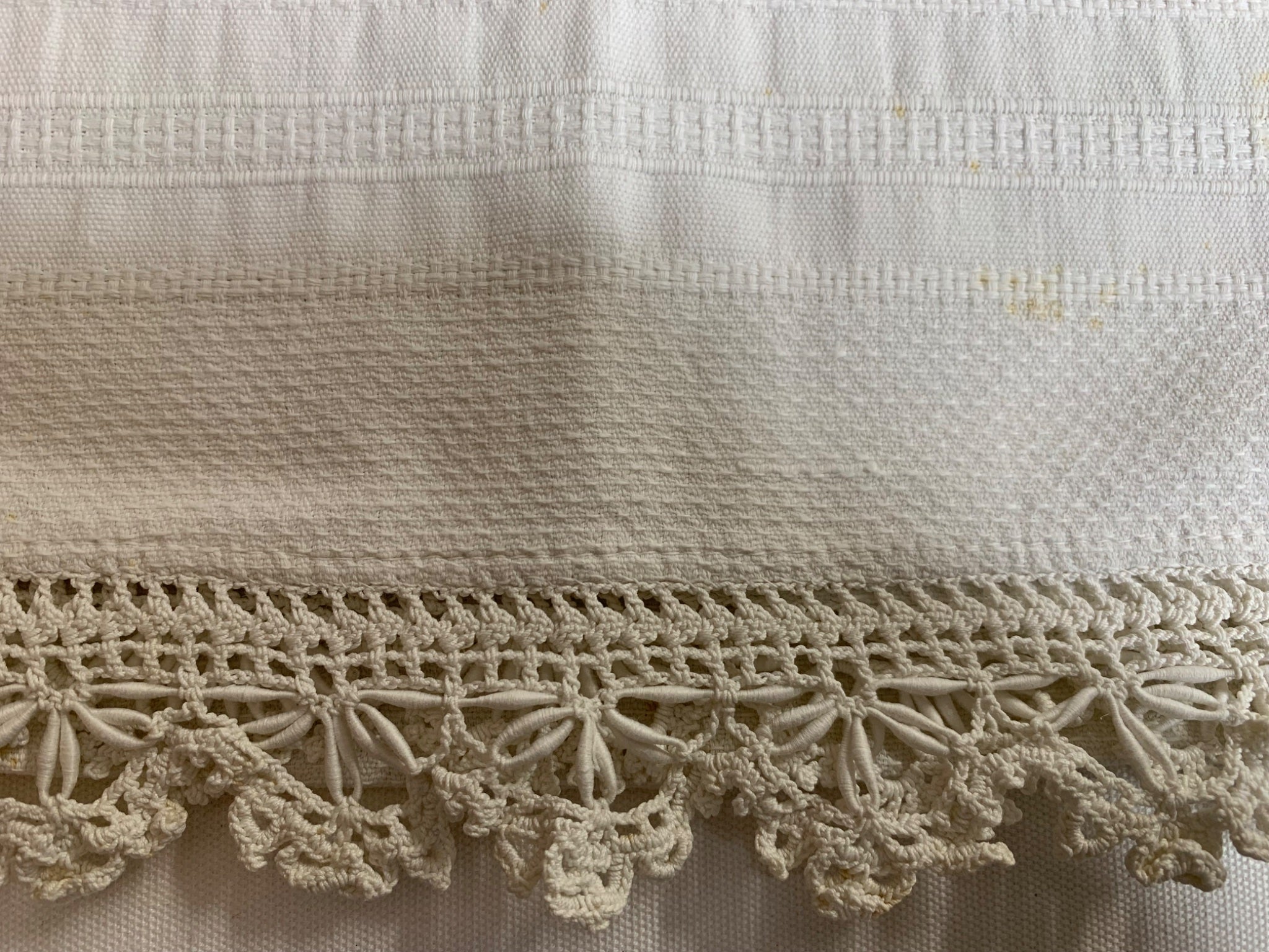A VTG White Hand towel or dresser scarf with crochet lace trim edges. I has a few yellow spots that need curated spot wash attention...or not, great piece for embroidery substrate, collage quilting or printed and dyed projects. It has no holes, rips or tears. 35 1/2"L X 17 1/2"w