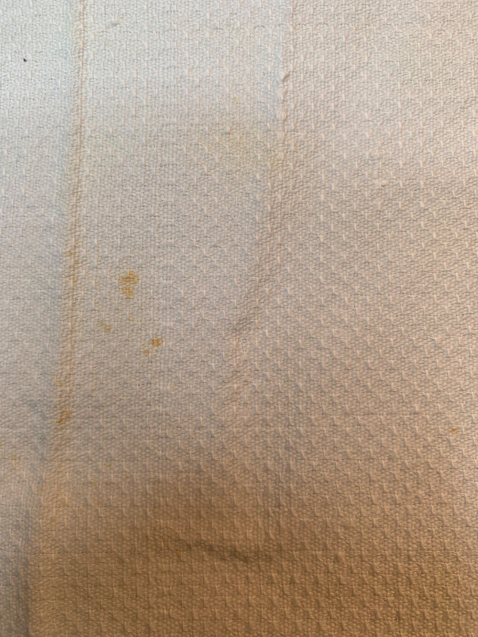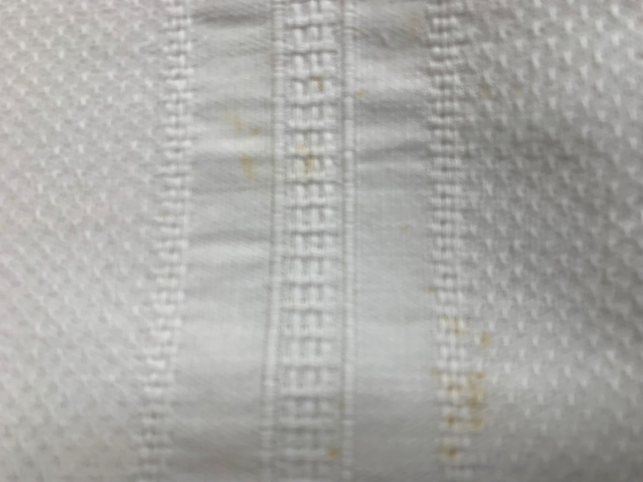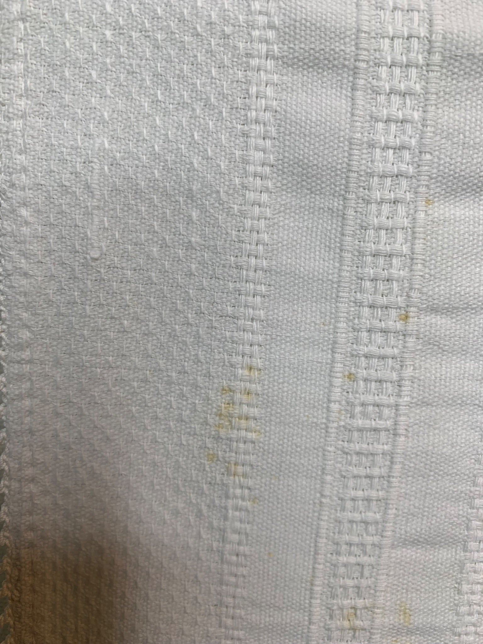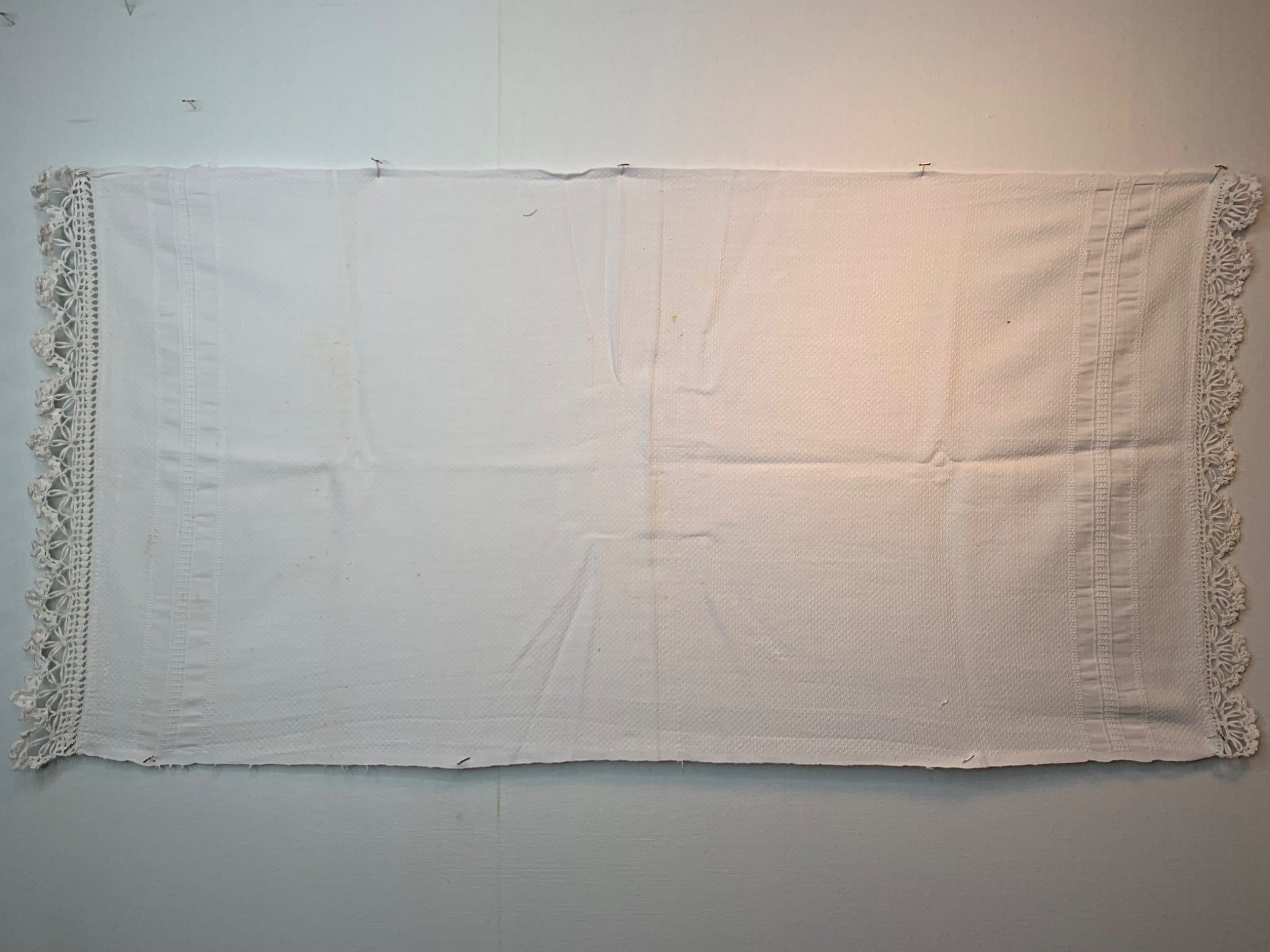 A VTG White Hand towel or dresser scarf with crochet lace trim edges. I has a few yellow spots that need curated spot wash attention...or not, great piece for embroidery substrate, collage quilting or printed and dyed projects. It has no holes, rips or tears. 35 1/2"L X 17 1/2"w