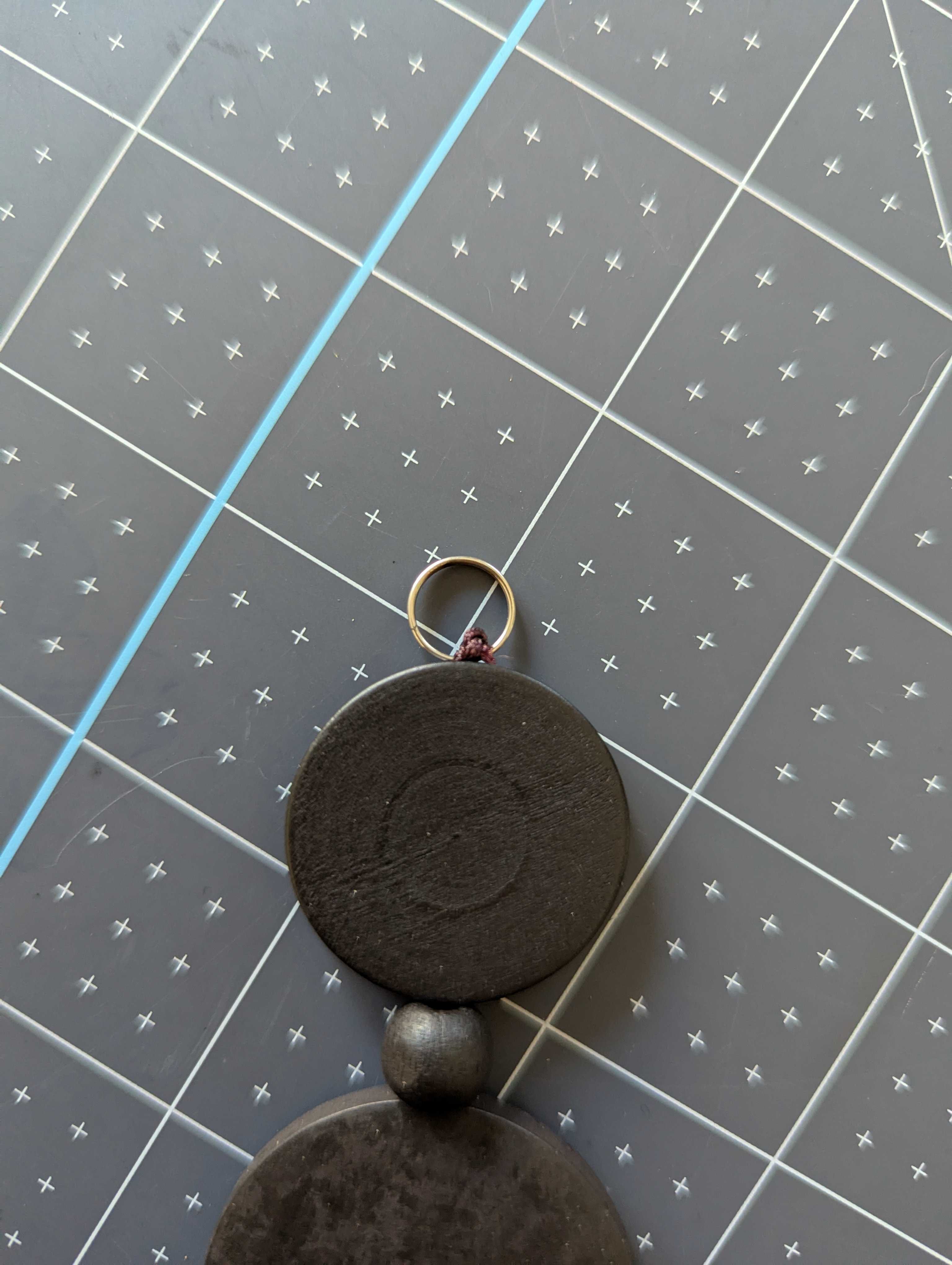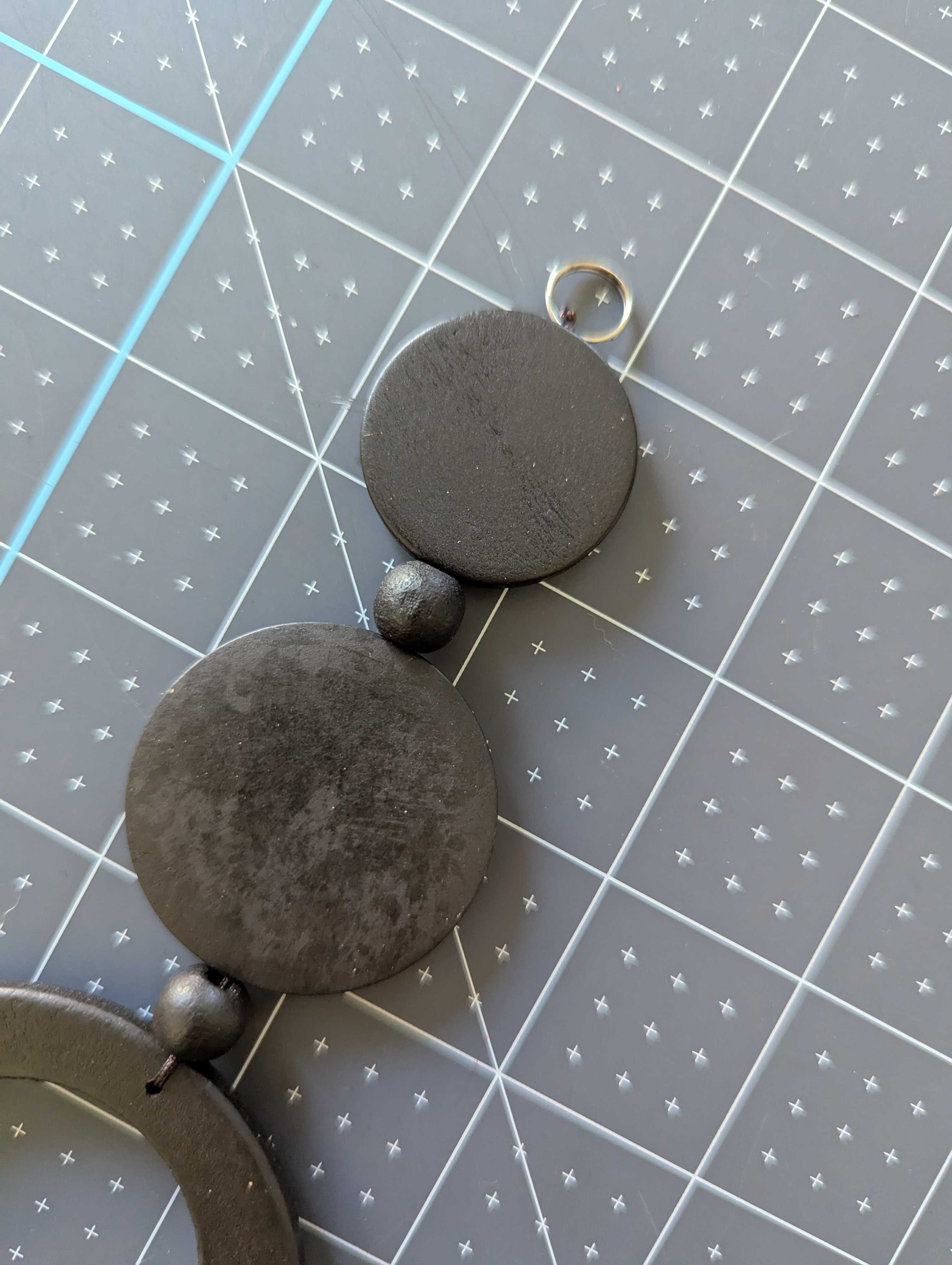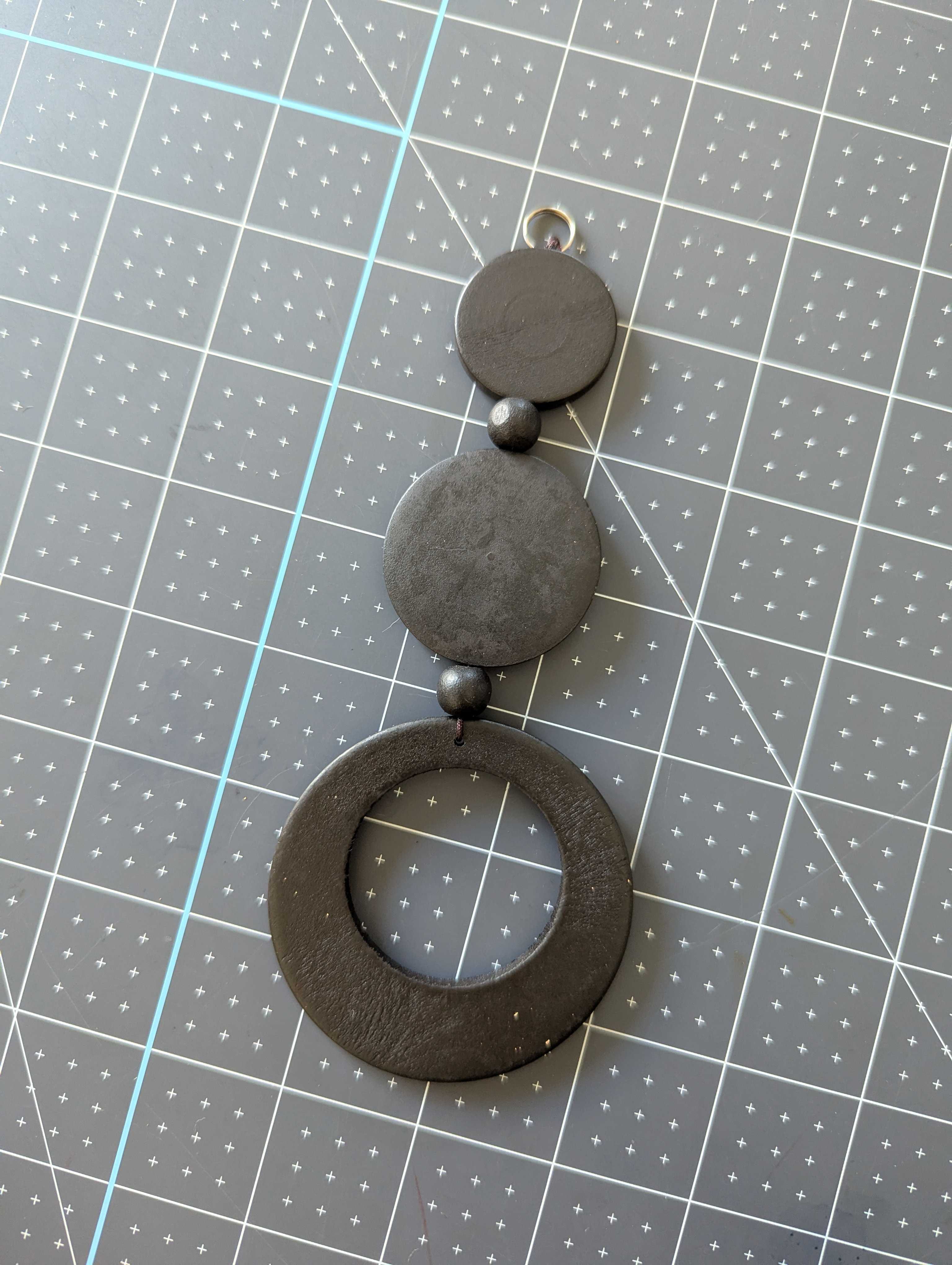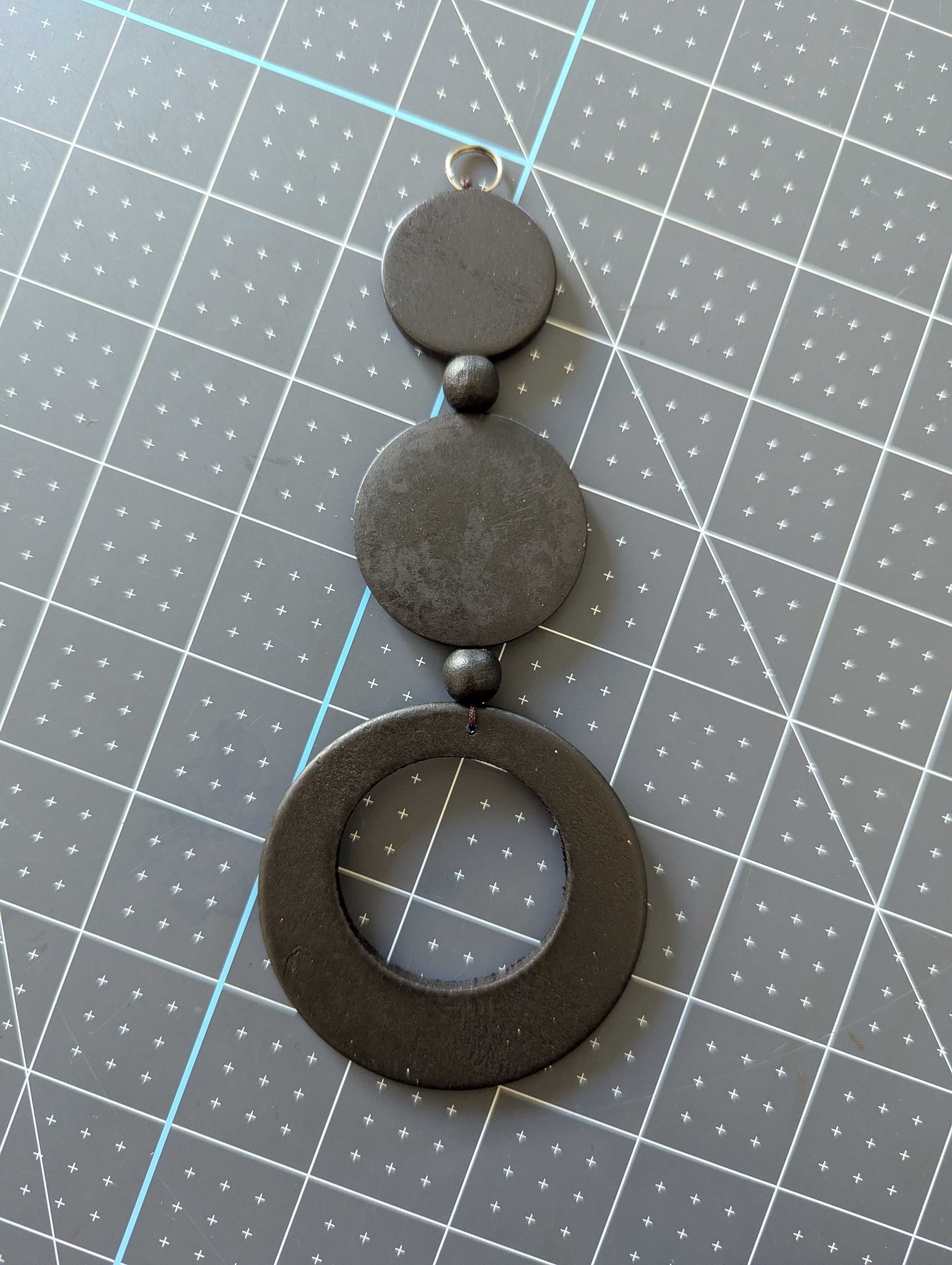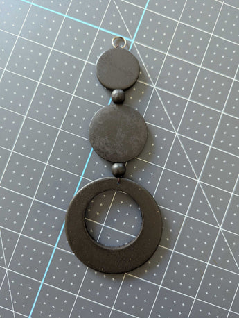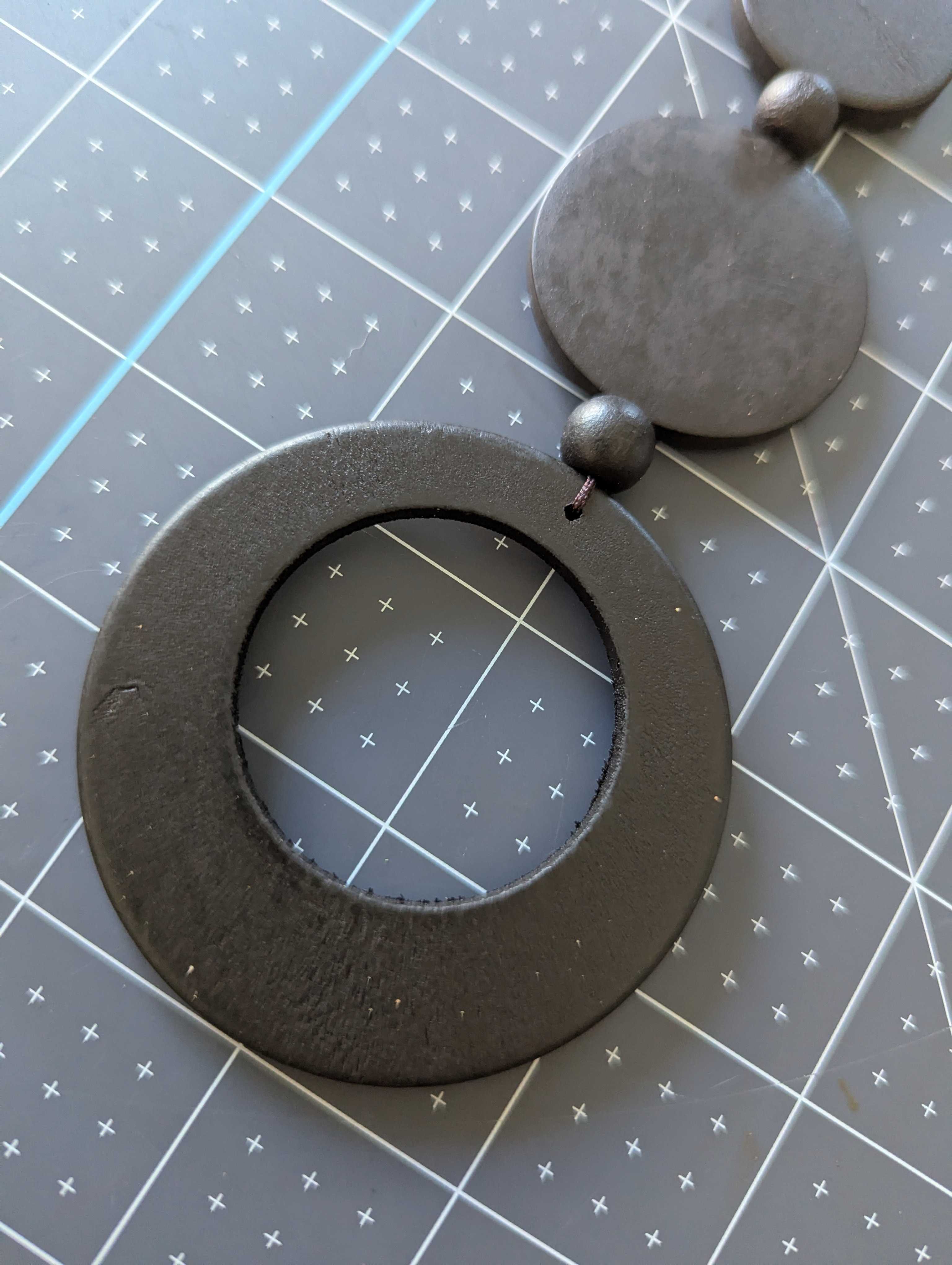 A strand of black painted wooden beads, measures 6" long without the split ring. Lightweight, in package. Mat board is in inches for size reference.
