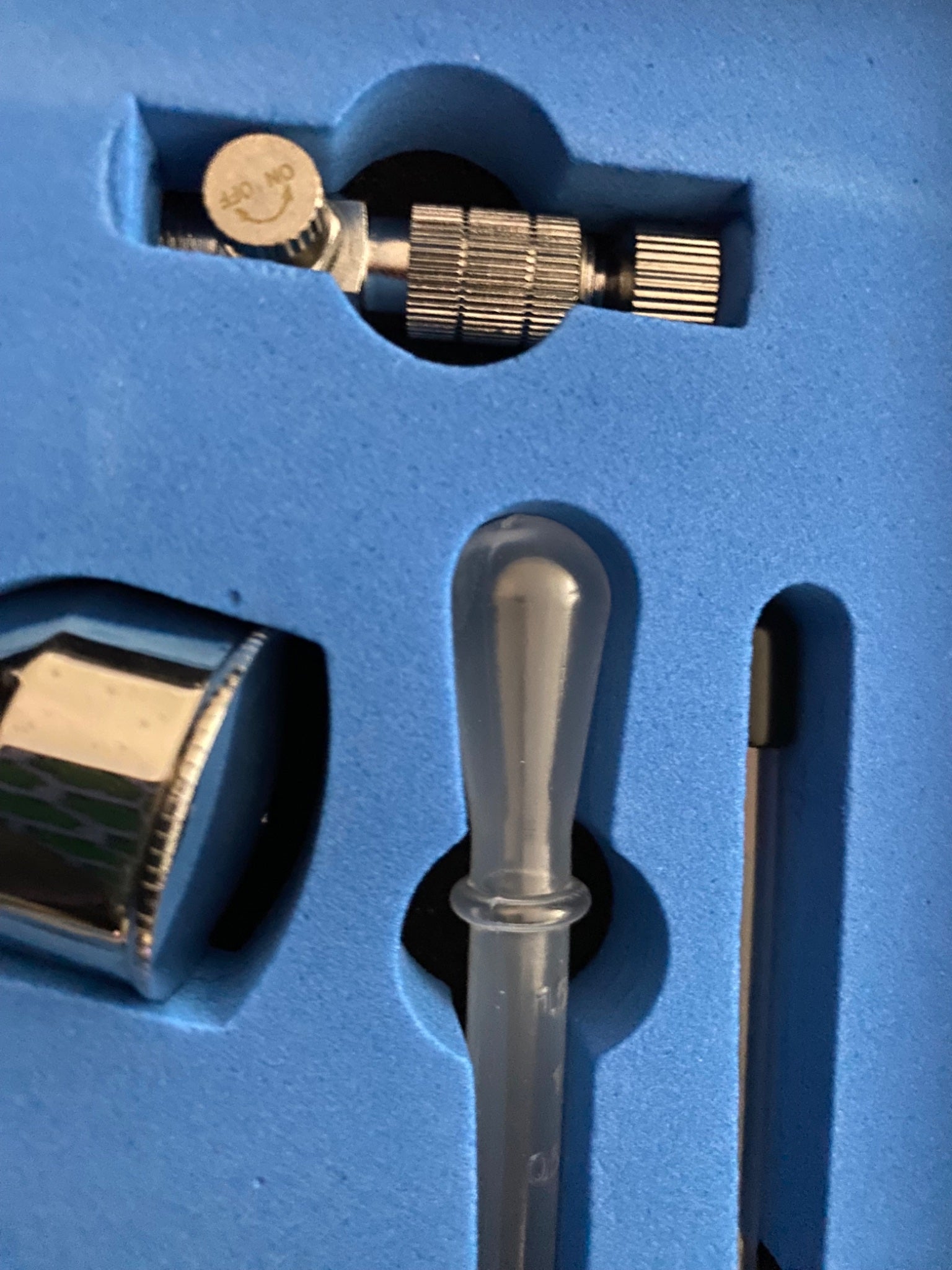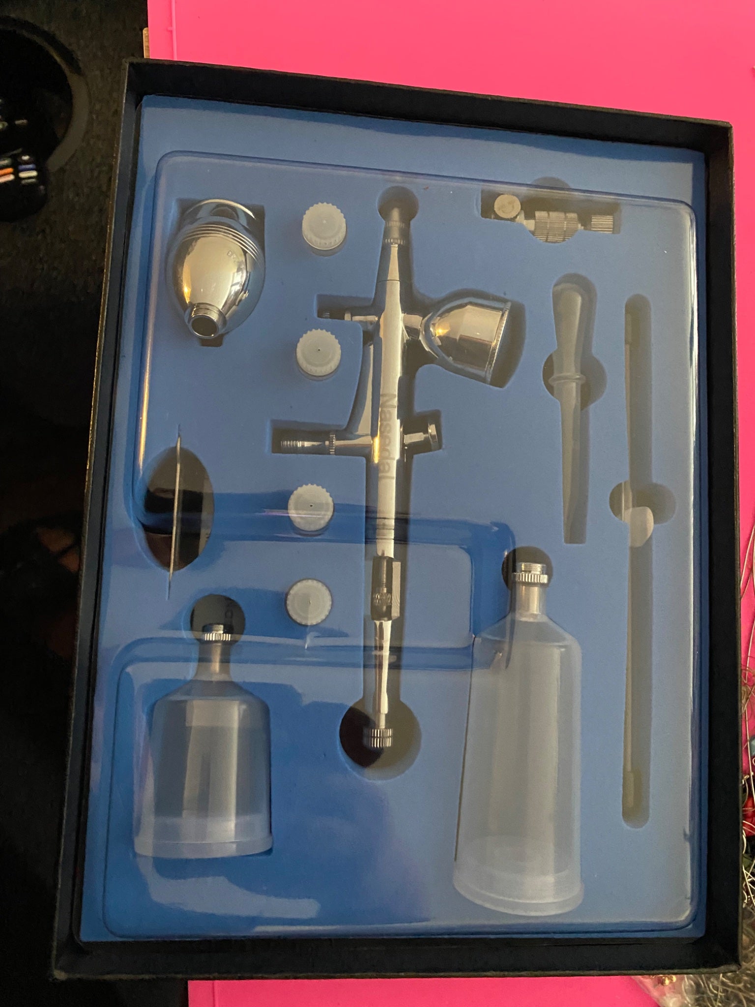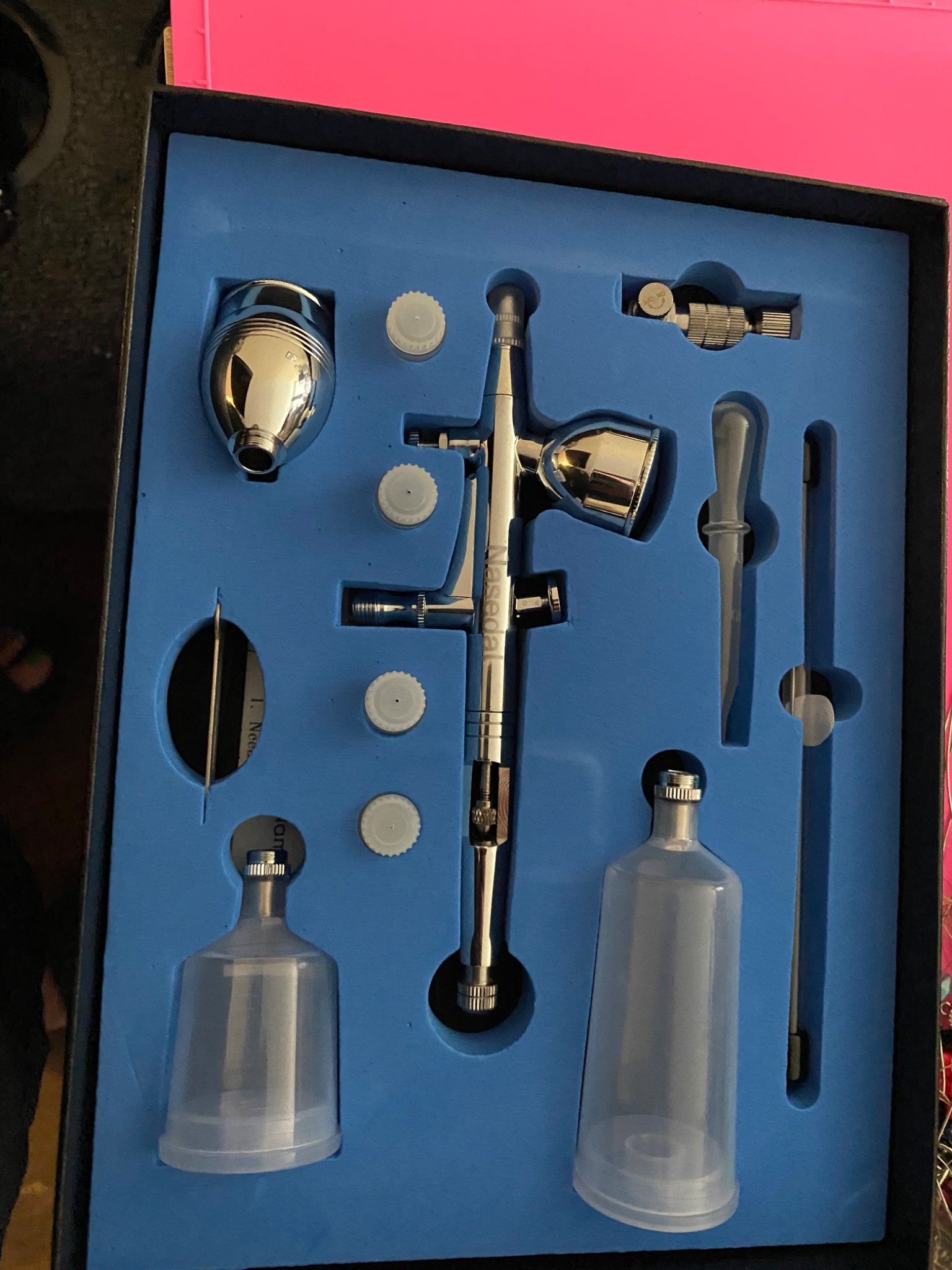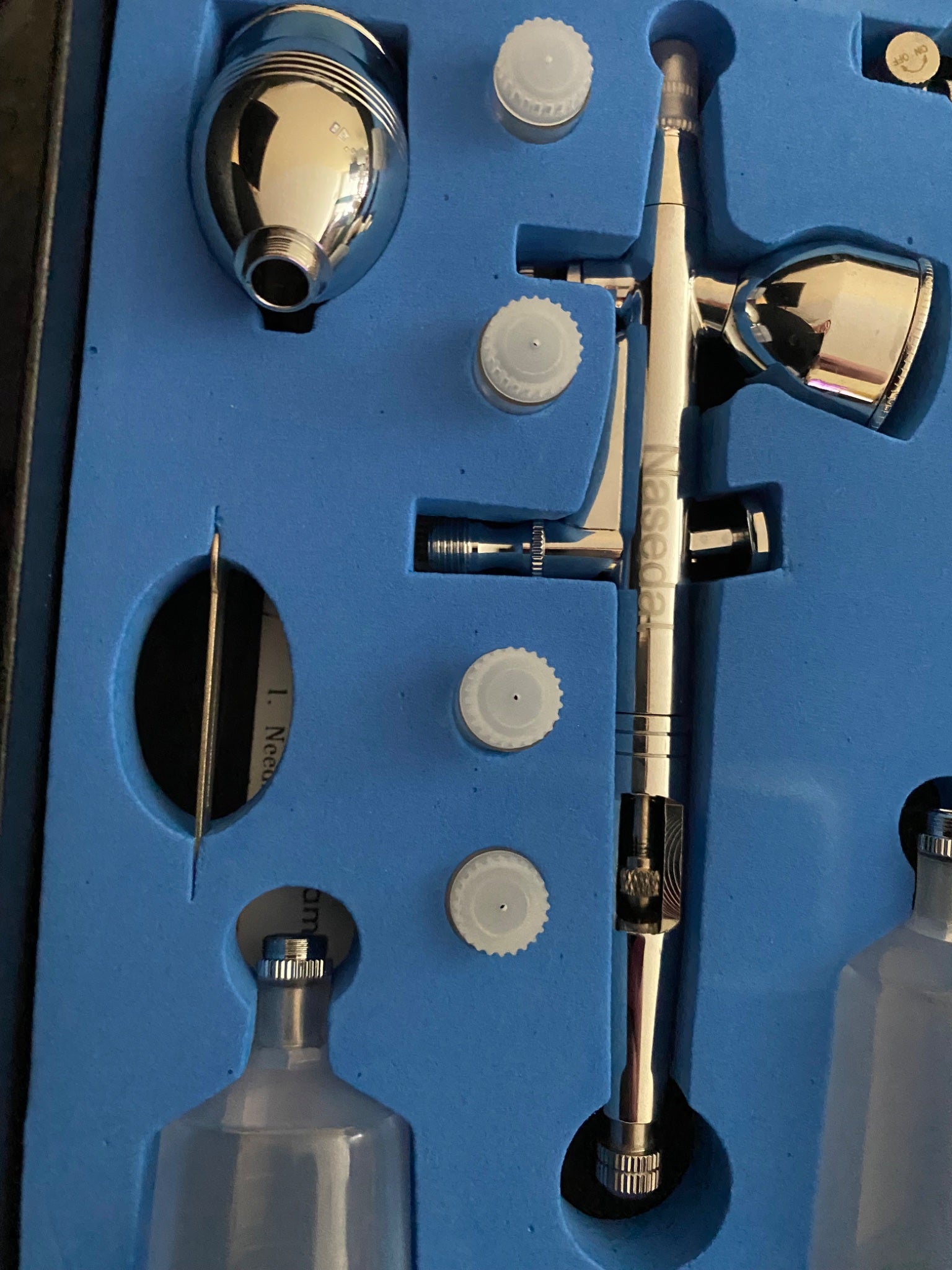Brand new complete airbrush kit by Nasedal! Never used. Comes with everything seen here: 5cc and 13cc metal cups, 20cc and 40cc plastic cups, and extra seals.