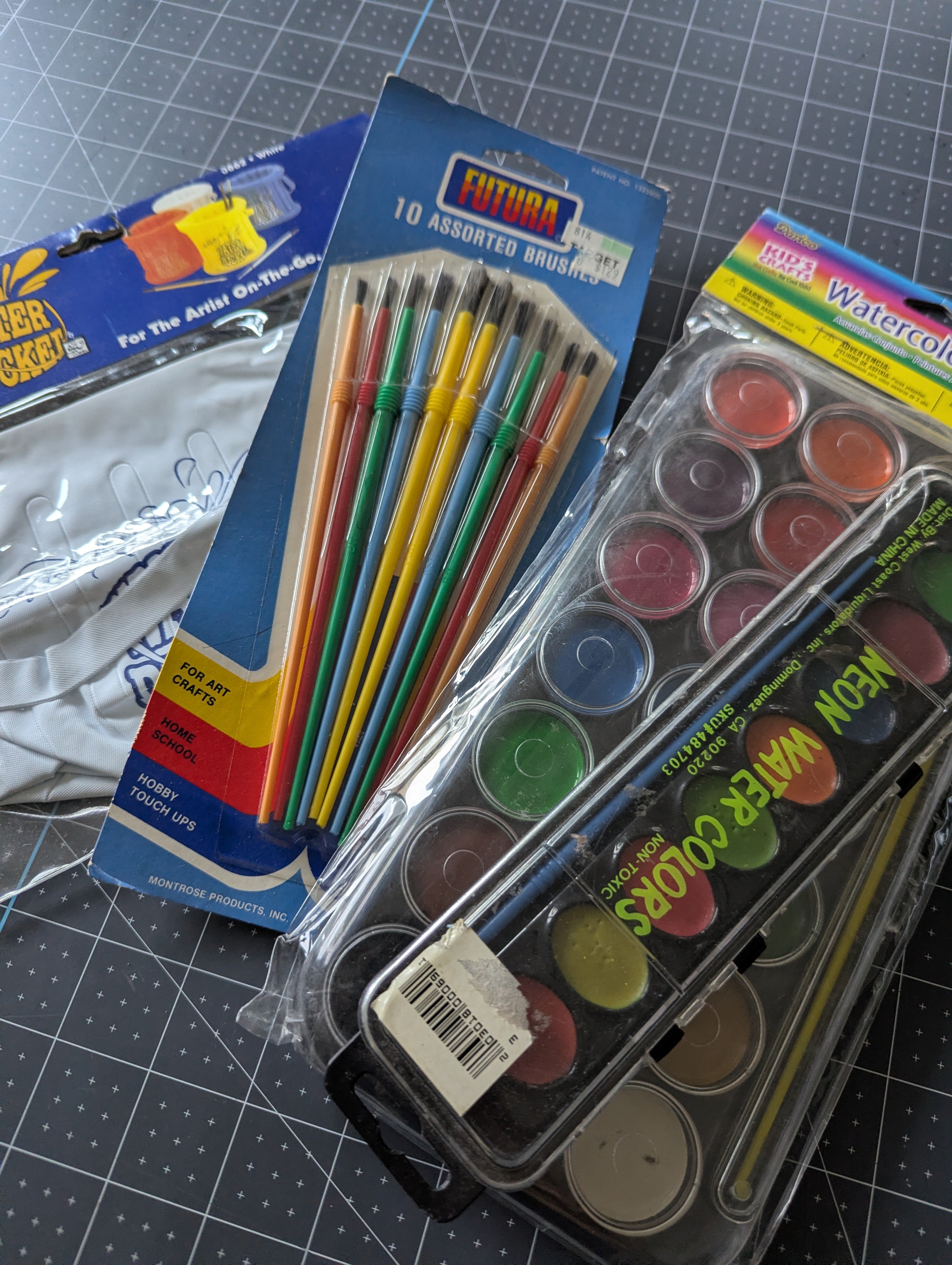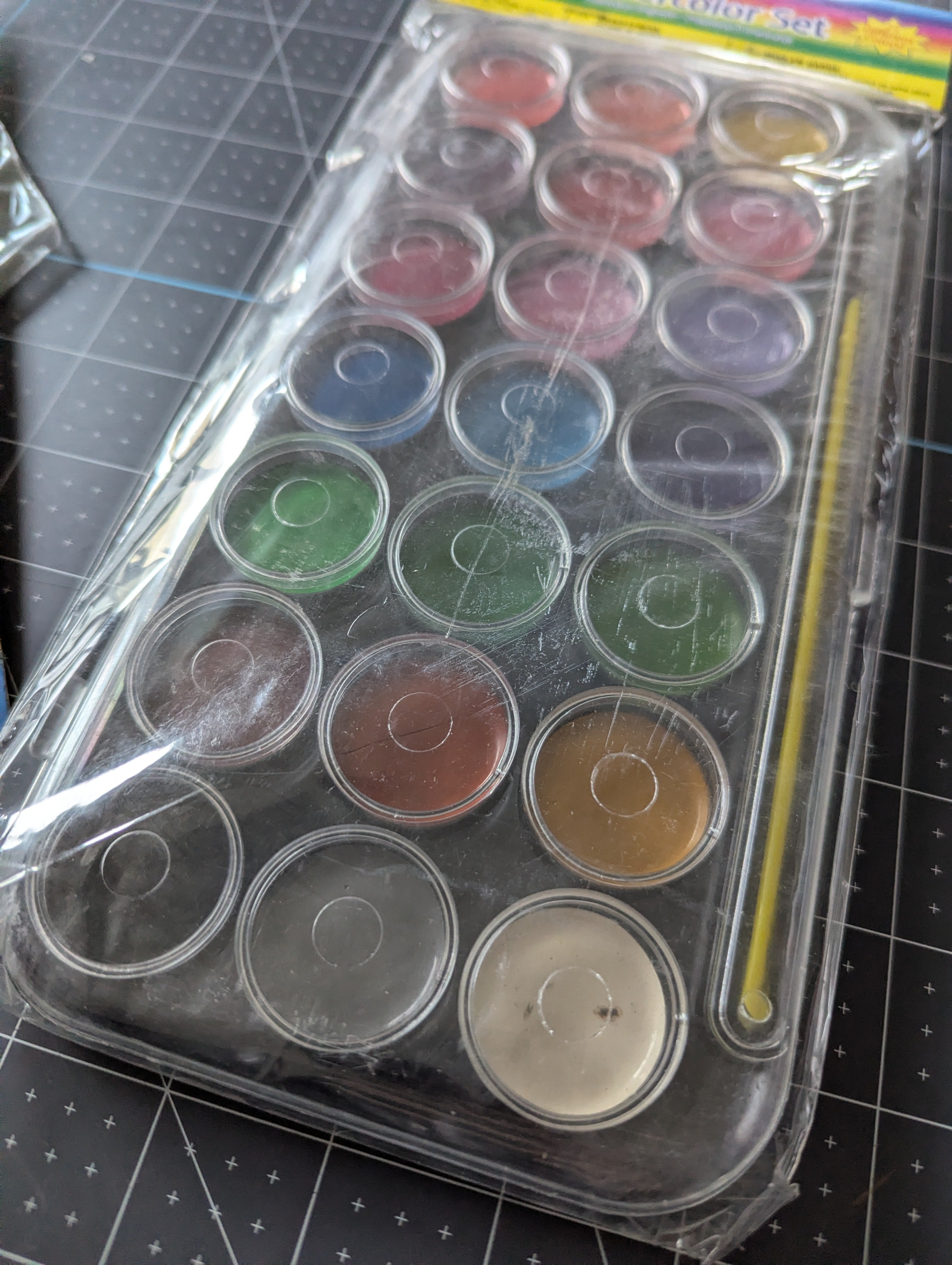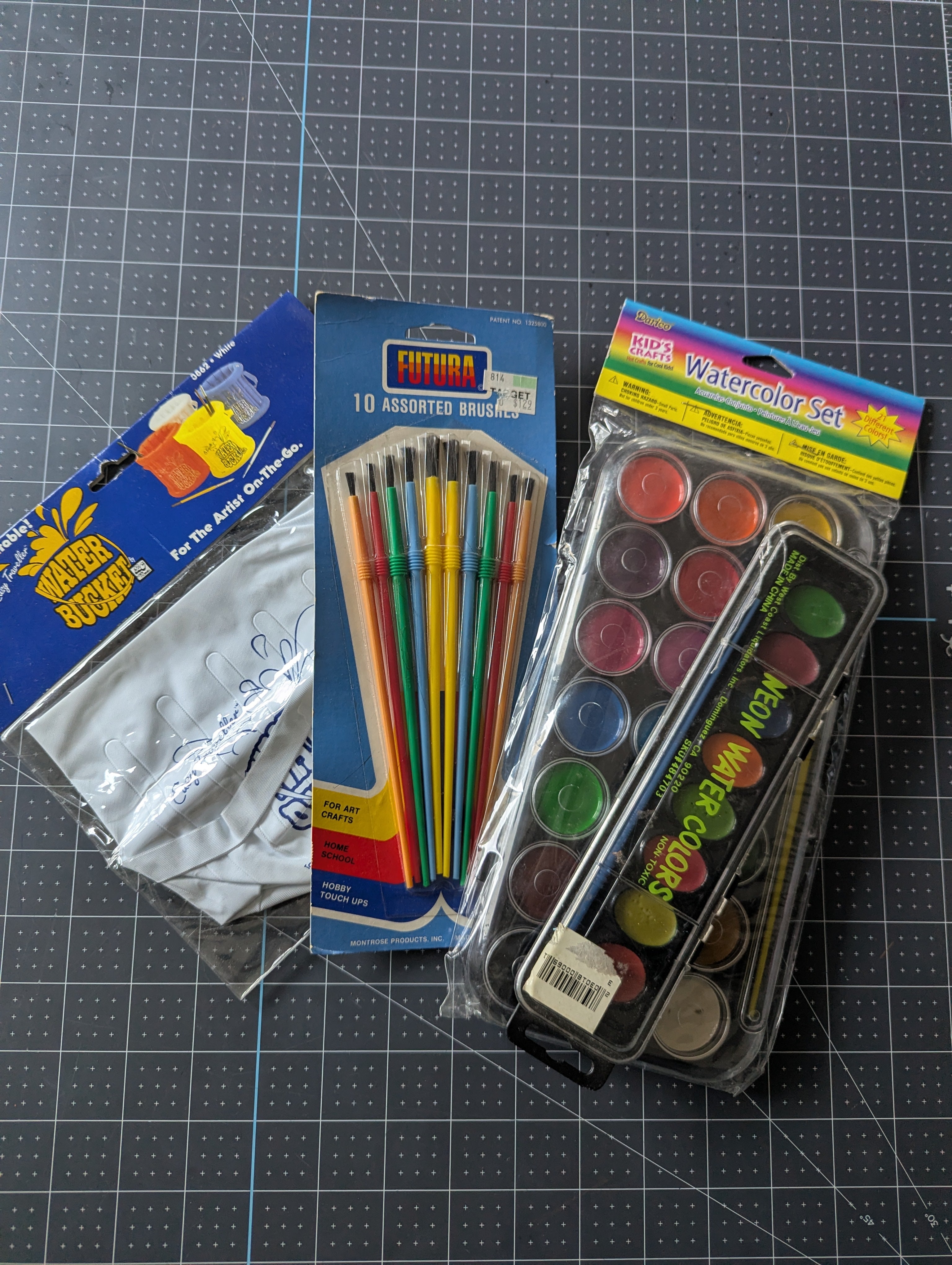 You'll receive one unopened 21-set painting palette, a 7 color palette which is unused but open, a set of unopened brushes, and an unopened inflatable6 water 'bucket'.
