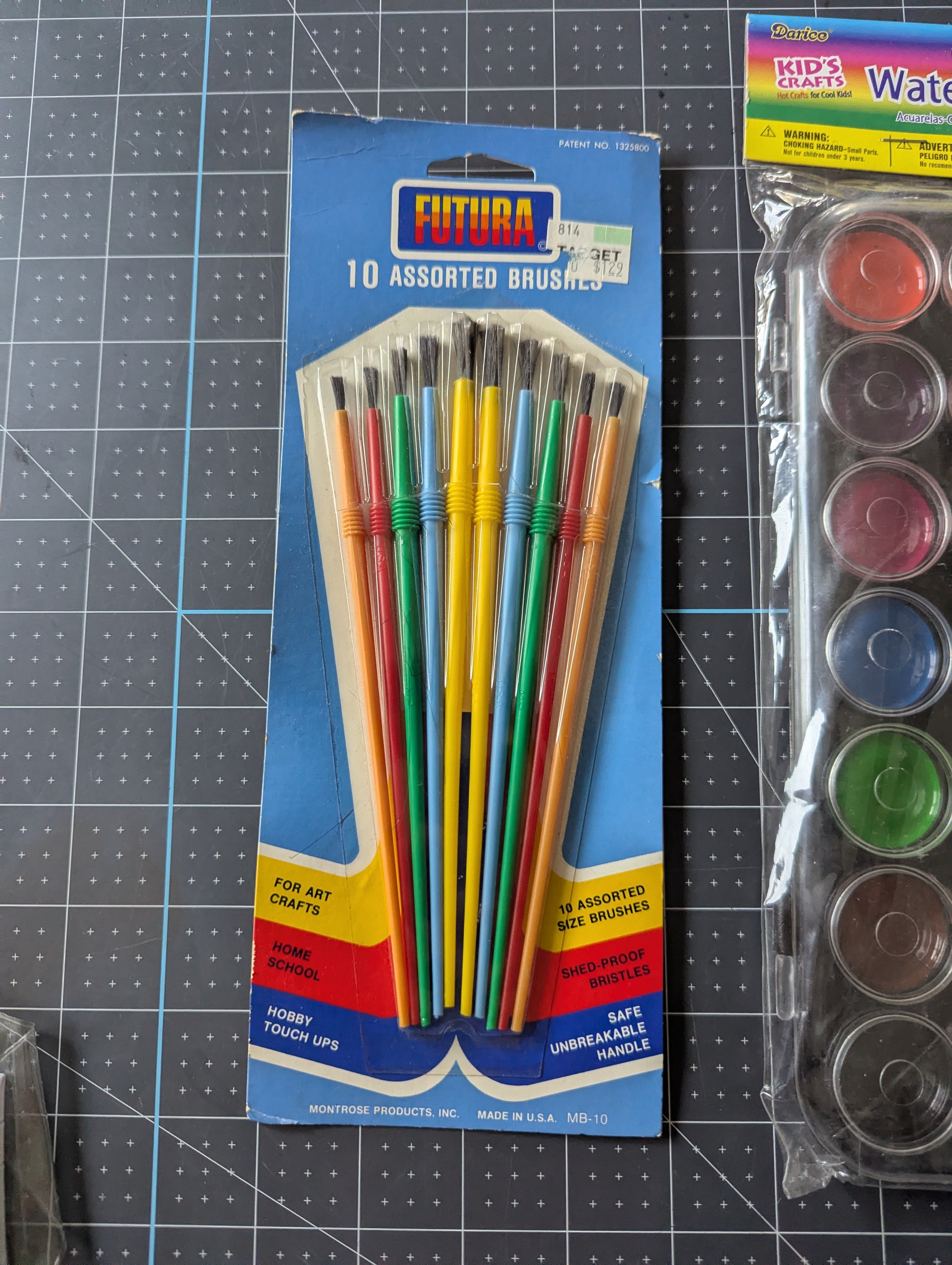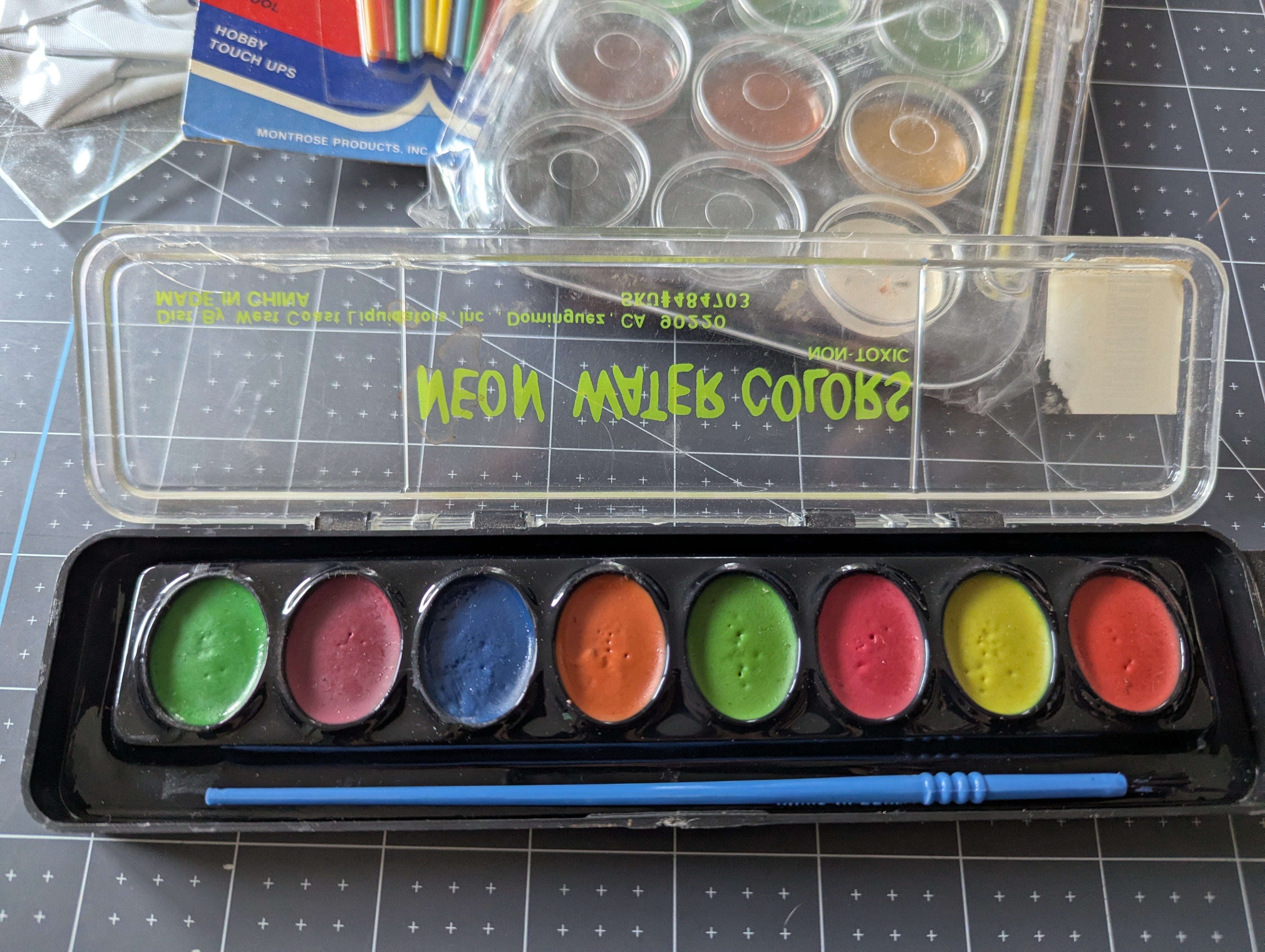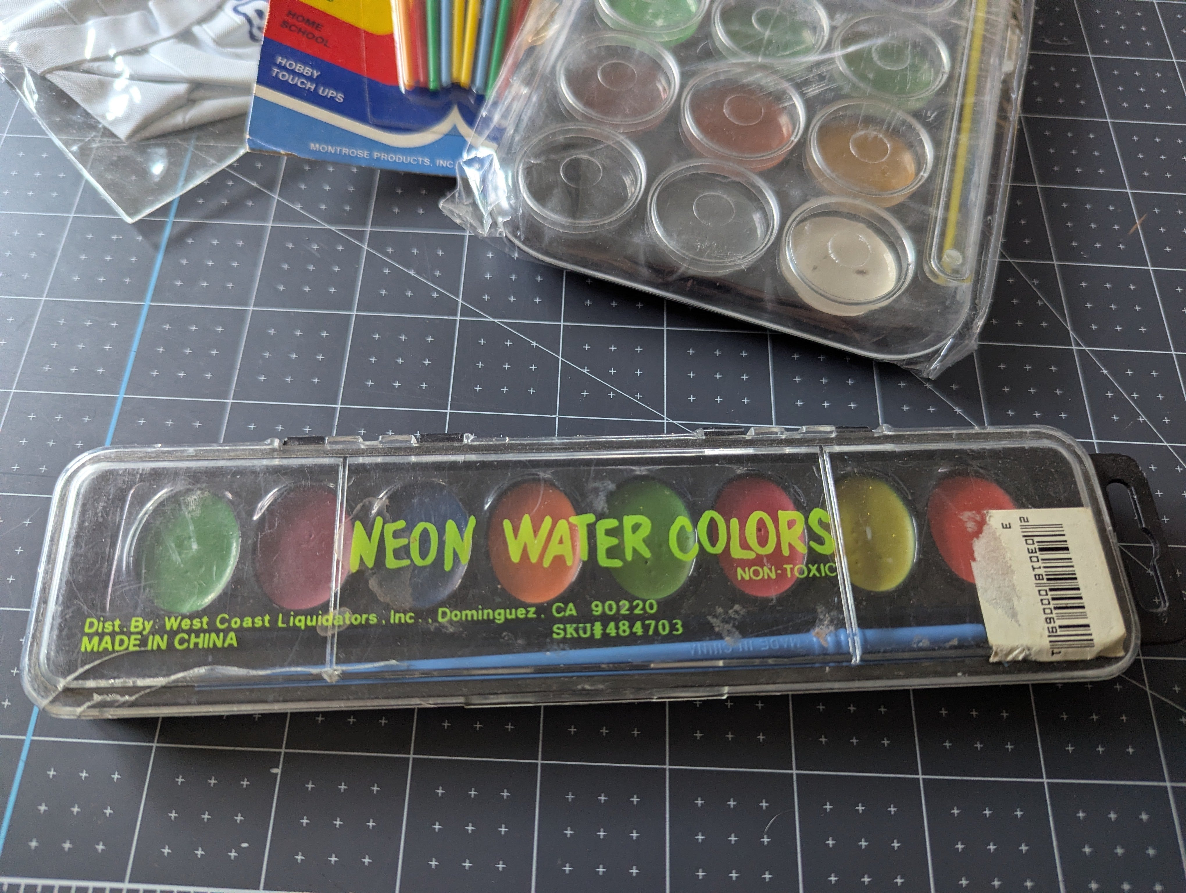 You'll receive one unopened 21-set painting palette, a 7 color palette which is unused but open, a set of unopened brushes, and an unopened inflatable6 water 'bucket'.