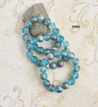 One strand of matte blue glass beads with a half AB coating. They are 10mm. I have a total of 3 strands available