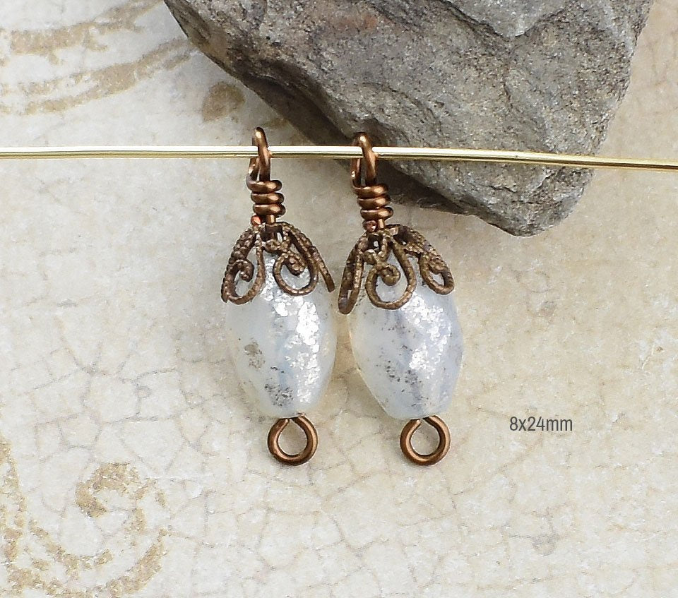 Pair of handmade charms - silver coated white faceted ovals with an aged brass filigree cap. Loop on the bottom to add more beads. Wire is bronze plated copper. they are 8x24mm
