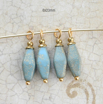 Little Czech Glass etched blue 4 sided glass drops with gold wash charms. Sold per pair.