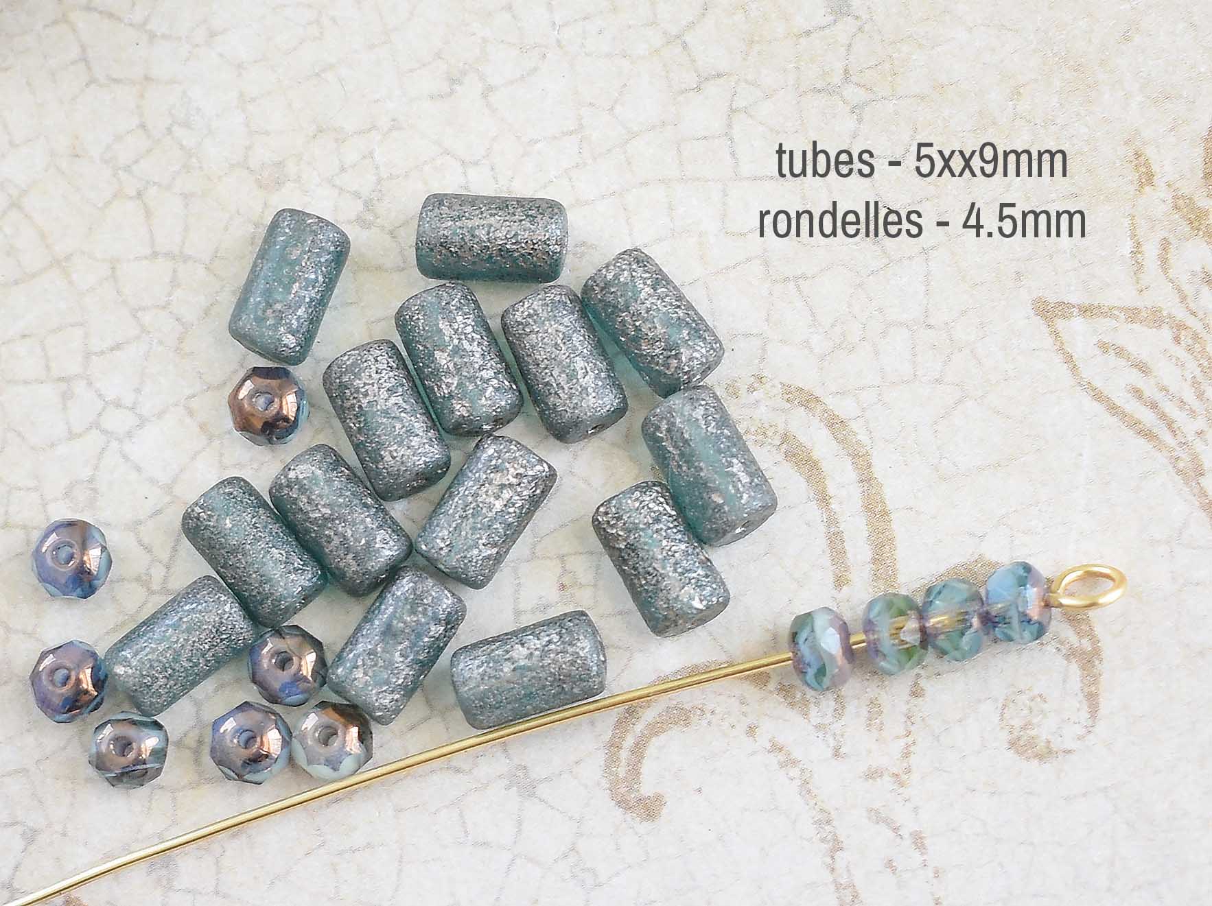 Lot of left over beads - tubes are etched with a silver wash and are 5x9mm. The little rondelles are blue/white with a bronze top and bottom, and they are 4.5mm.