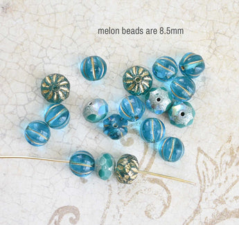 Gold washed blue cruller and melon beads - melons are 8.5mm. There are also some blue rondelles with a silver top and bottom. Those rondelles are 8.5mm