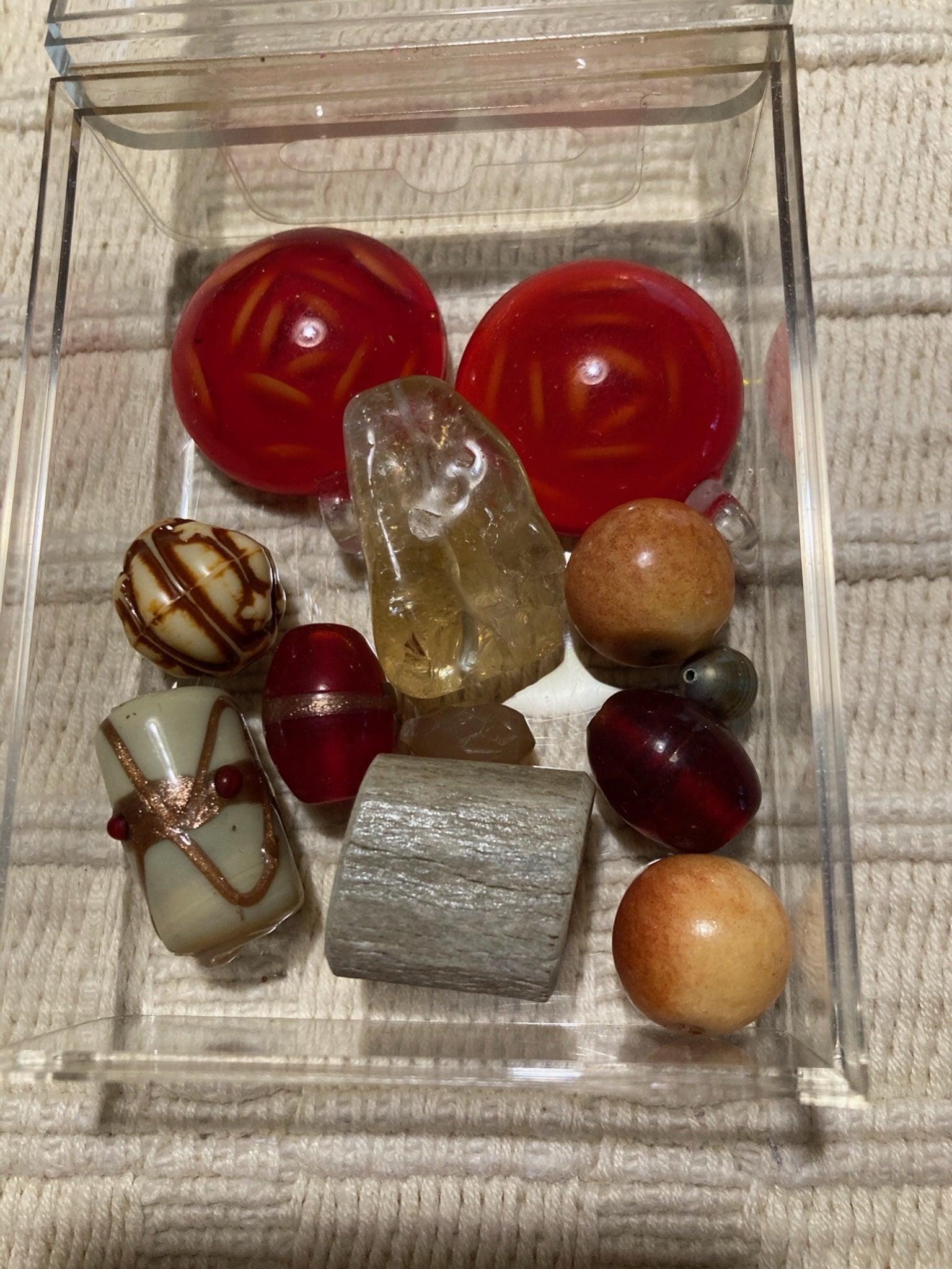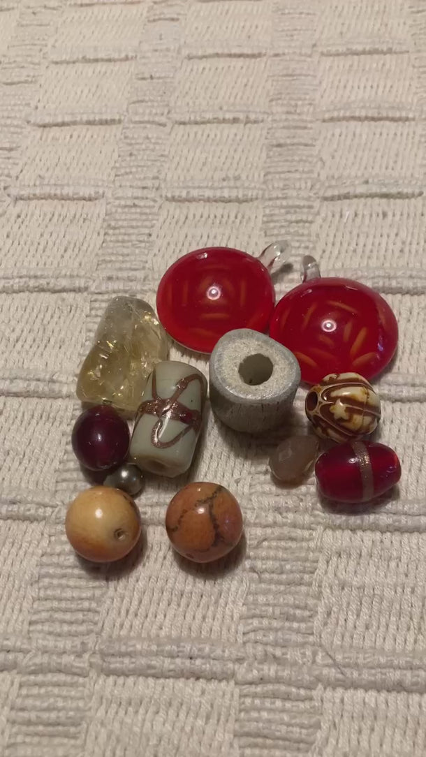 Rare and beautiful here. One large deer antler bead, a rustic chunk of citrine, one large beige hand painted gold & red bead, one golden yellow embossed focal bead, two orange with abstract black markings round beads, misc. assorted four beads and two amazing optical illusion red and orange centerpiece beads