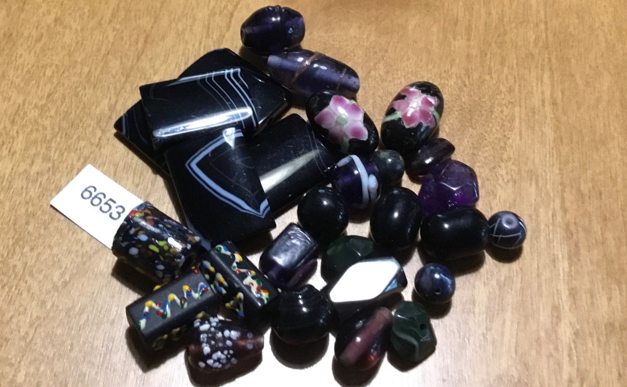 The black, grey and purple dark colors… Five flat rectangular high gloss op art beads, two oval barrel floral painted beads, three confetti beads, and an assortment of individual glass, different shapes and sizes complimenting the larger pieces in the lot