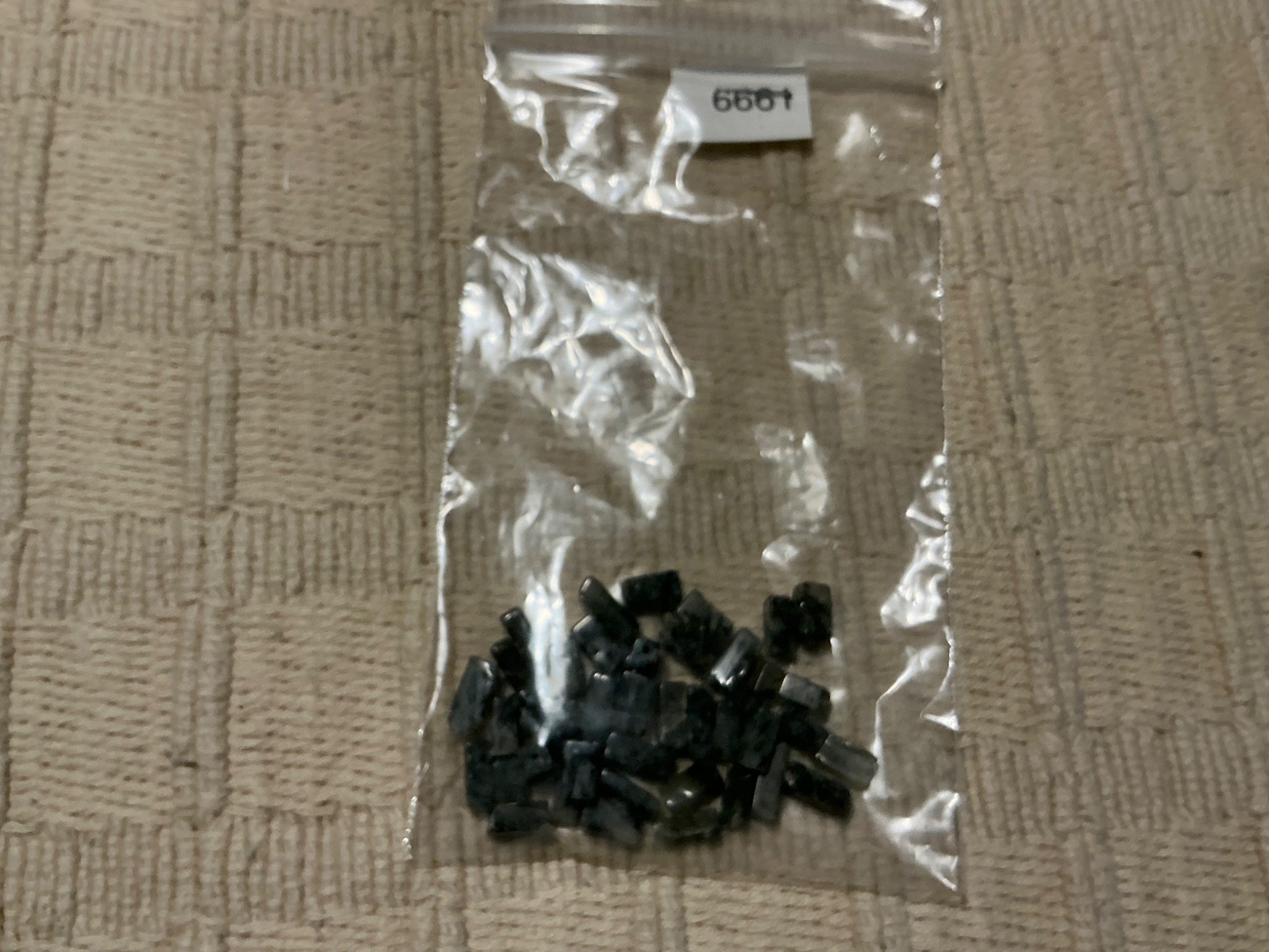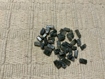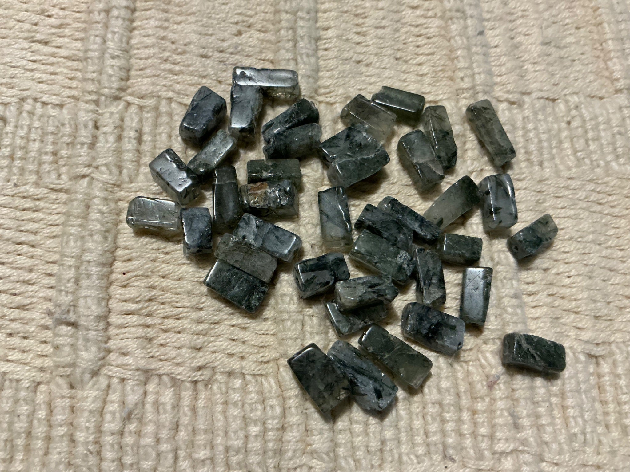 These prehnite beads are square tubes with a mottled black and white to grey tone, they measure 1/4” long and are drilled lengthwise. $1.00 1oz.