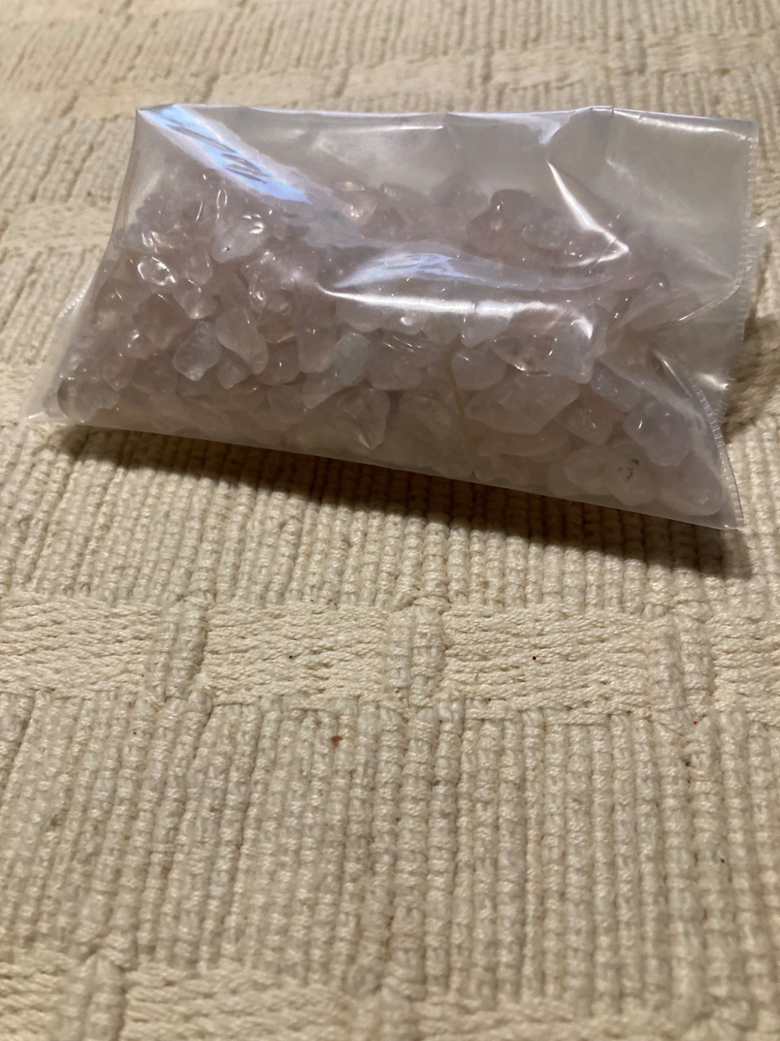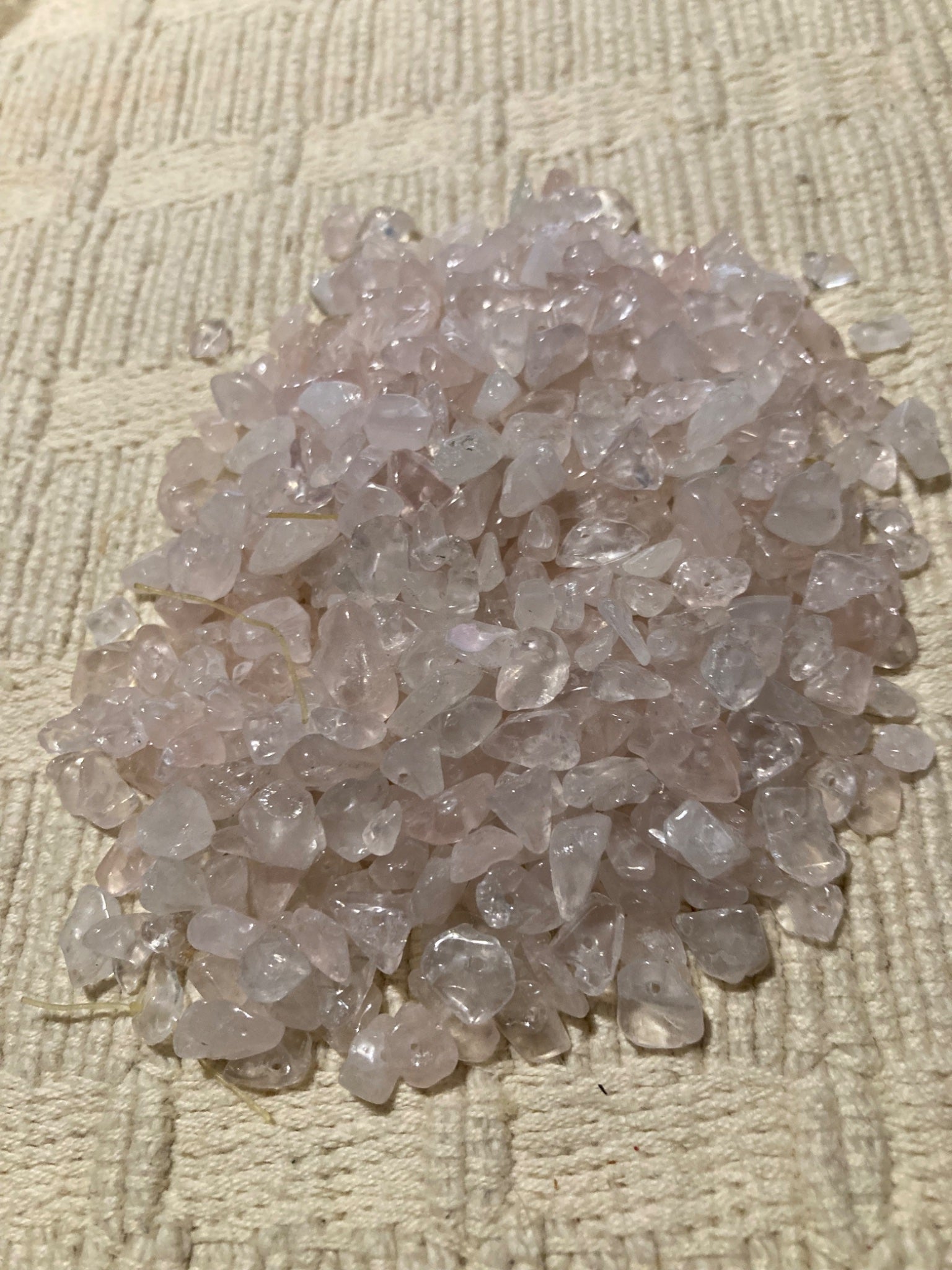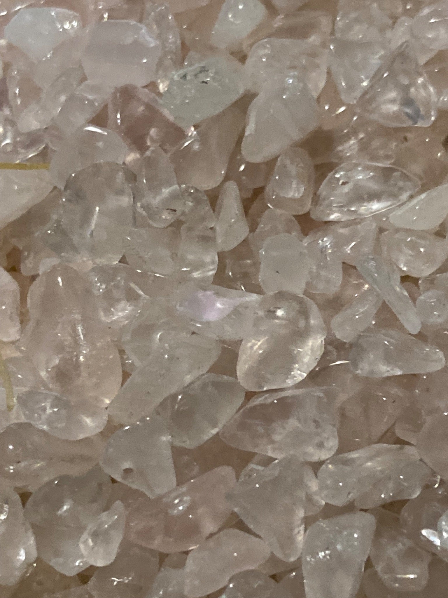 These rose quartz chips are various small sizes all drilled to be strung. Pretty light colored pink. Polish has a sheen. $6.00 4oz.