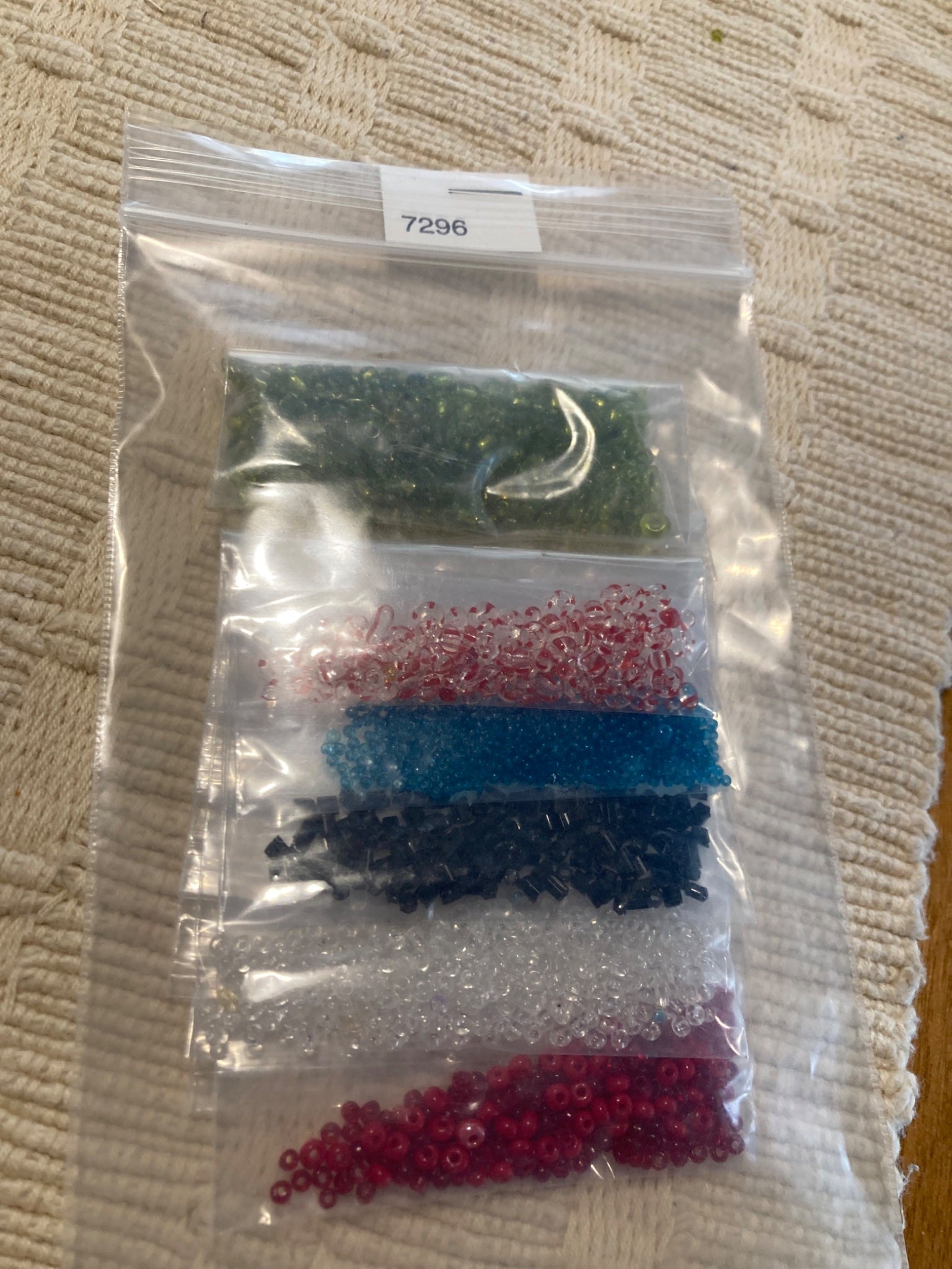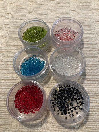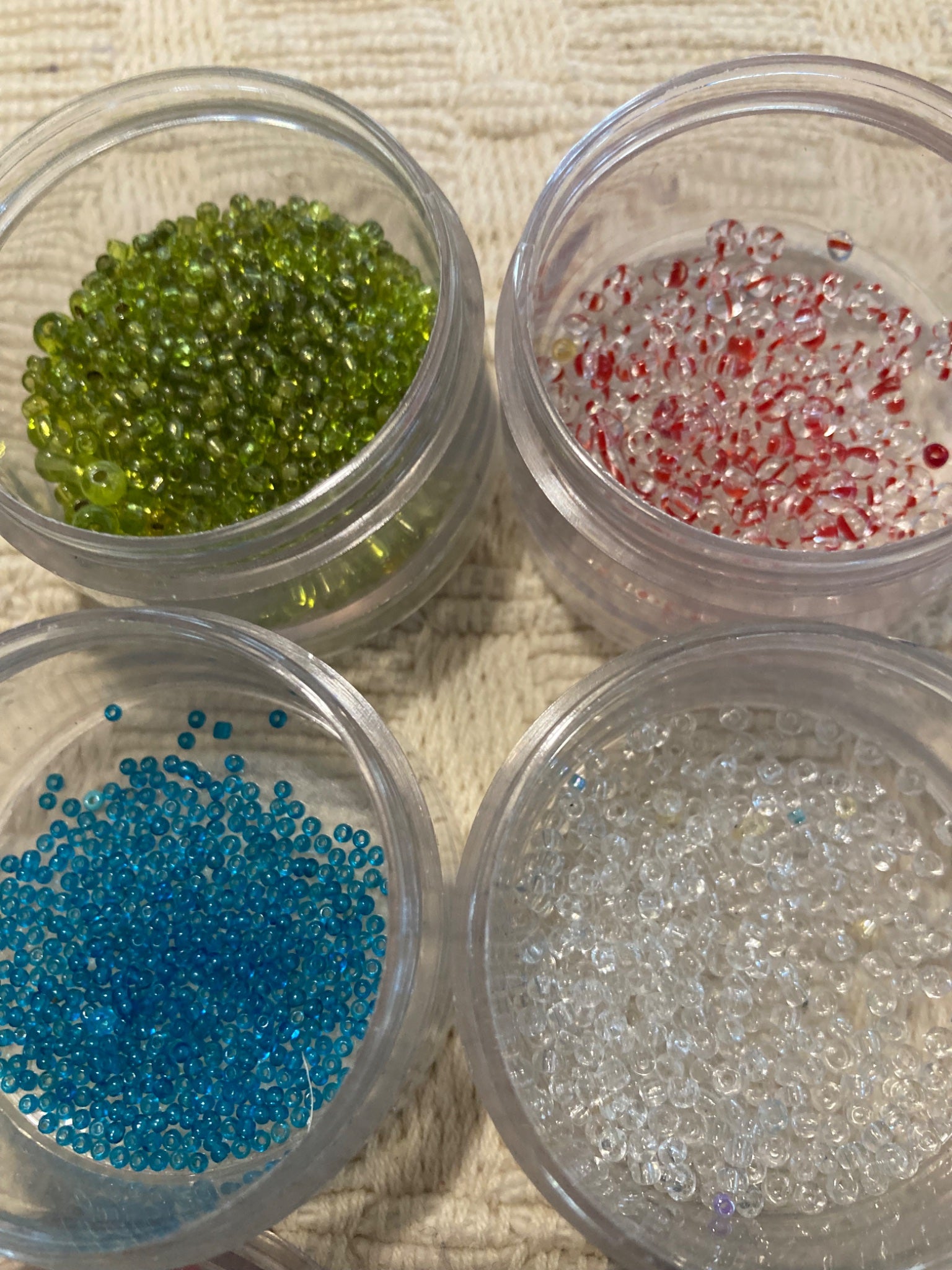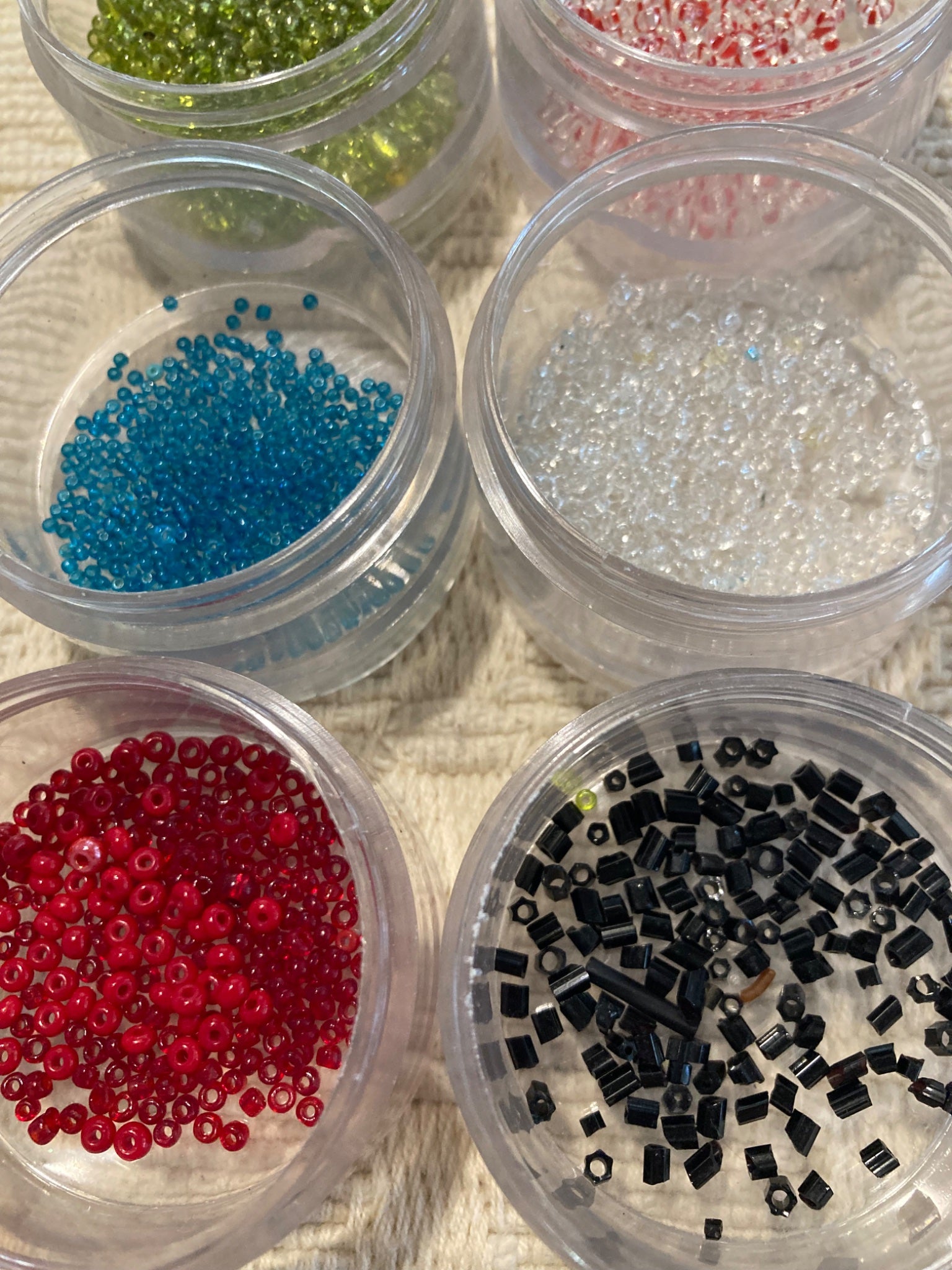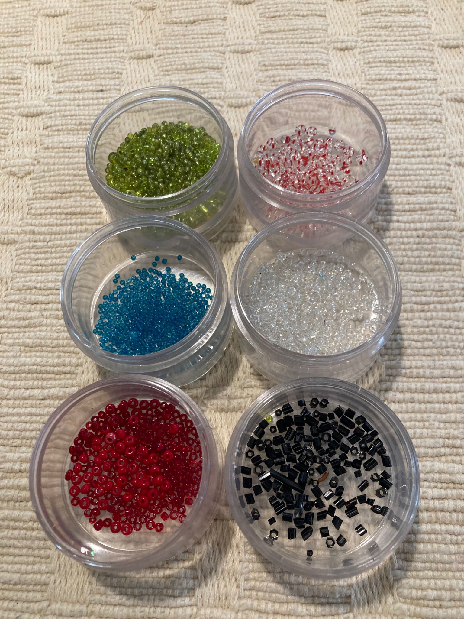 A smaller lot here. An offering of six different colors. Green (two sizes, seed and a 1/16” in diameter bead), Candy Cane (a clear bead with a red strip at the center), Deep Aqua, Jet (seed bead size, yet square shaped beads), and Red (seed beads - clear and slightly larger solid red).