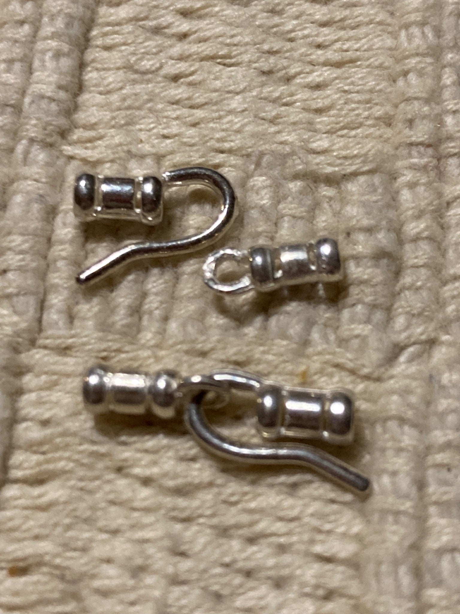 These two sterling silver hook and eye necklace closures are clamp style. Thread on to strand and the flat space is clamped down which holds the finding on the strand. A clean and crisp finish to your necklaces. (2 pieces)