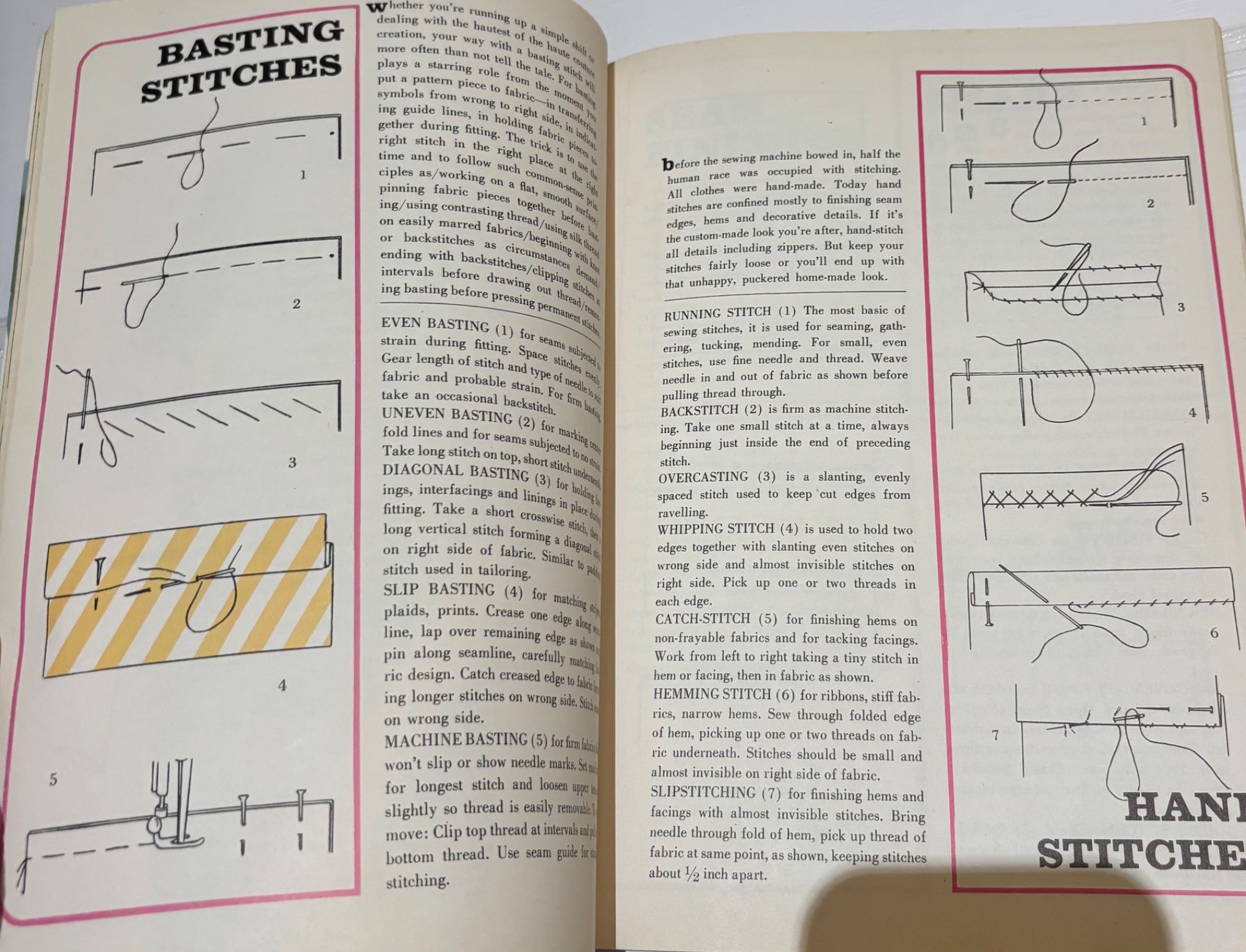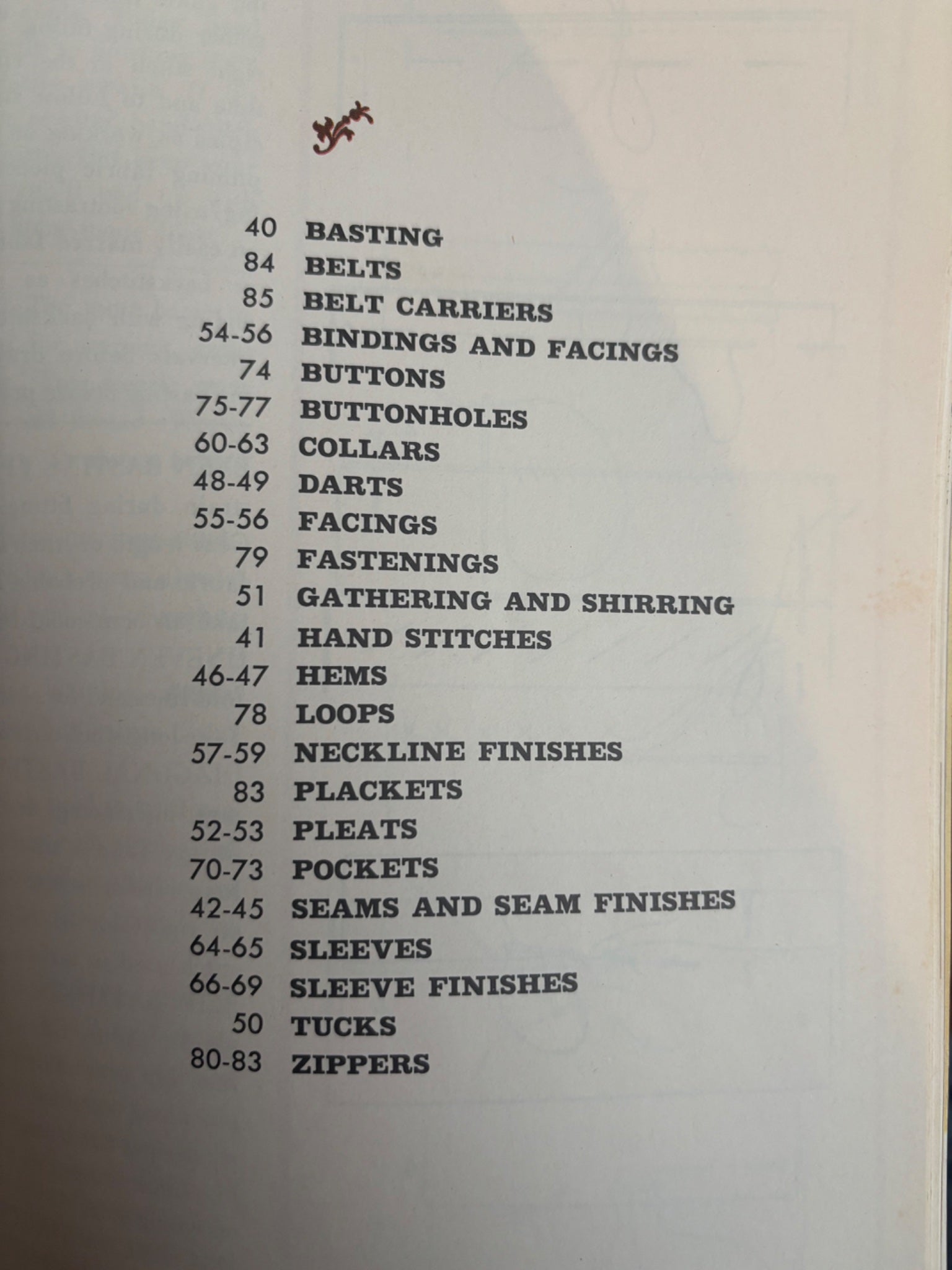Basting, Seams, Hems, Darts, Tucks, Gathering, Shirring, Pleats, Bindings, Facings, neckline, Armhole, Collars, Sleeves, Pockets, Buttons, zippers, Linings, Tailorong, Trimmings,etc.