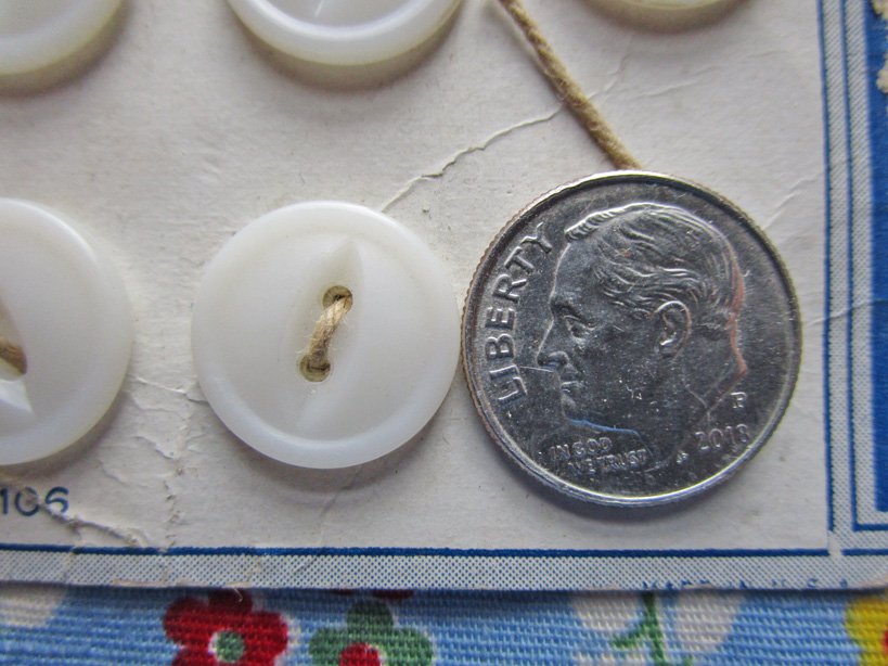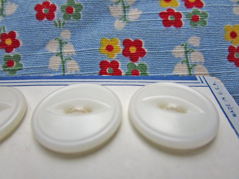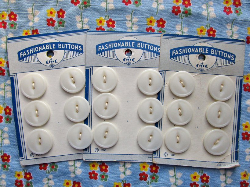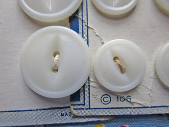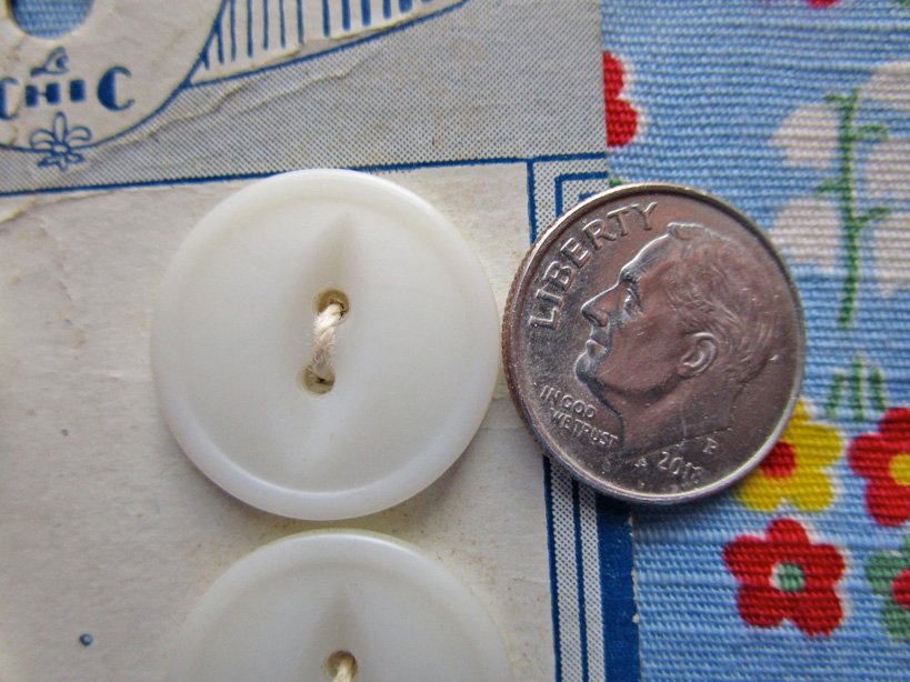 Twenty (20) vintage Le Chic brand white plastic buttons on three original cards. Twelve buttons measure 3/4" (19mm) and eight measure 9/16" (14mm). All the same style with a fisheye center and thin raised rim. Two-hole, sew-through. Made in USA. Very good condition.