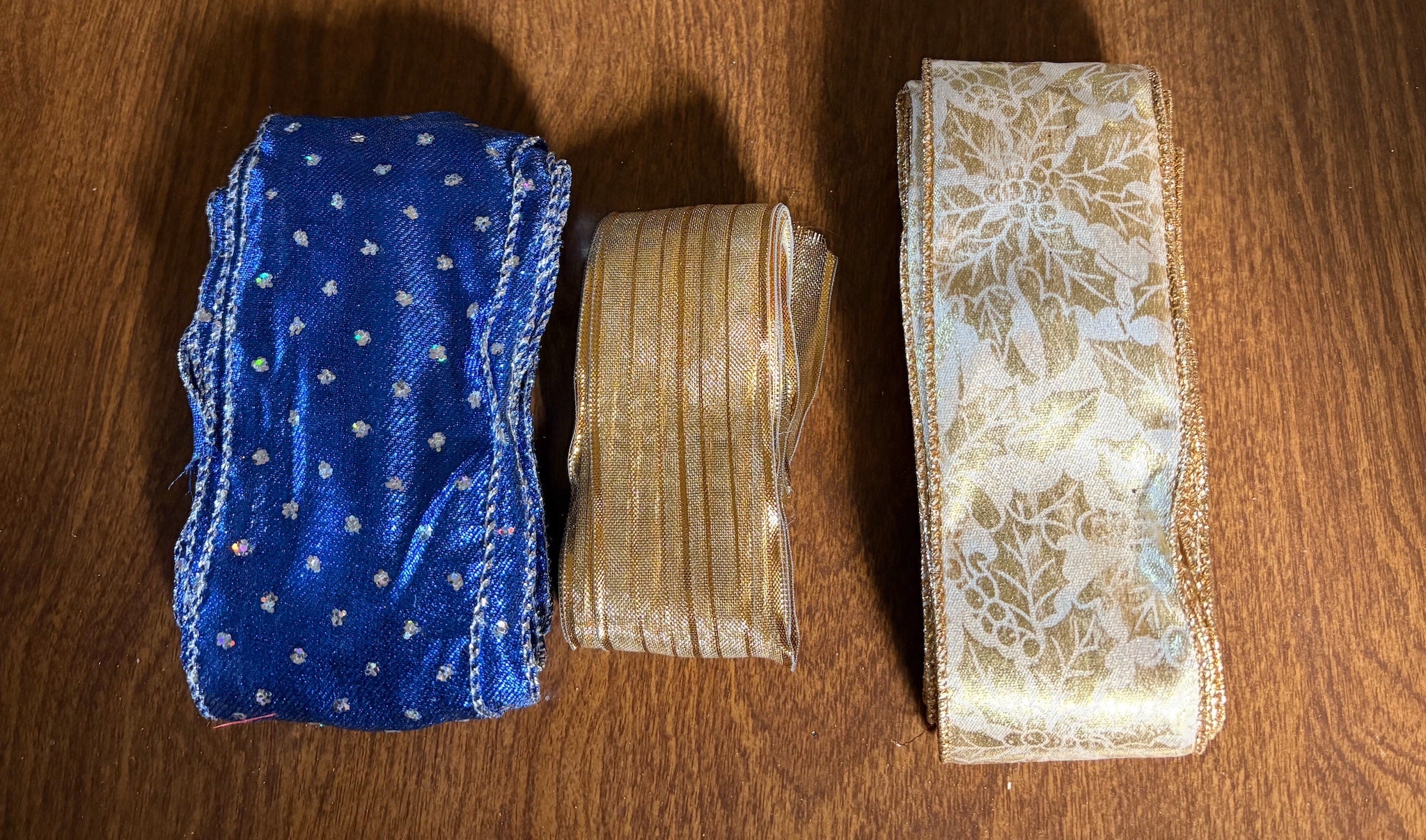 I have 73partial rolls of ribbon with the blue having 5 1/2 yards and the gold 5 yards in each.  I removed the ribbon from the spools 1) to measure and 2) to eliminate bulk for shipping.  I have other listings and would be happy to combine shipping.  If you see other listings you'd be interested in, please send me a message and I can give you a quote on combined shipping.