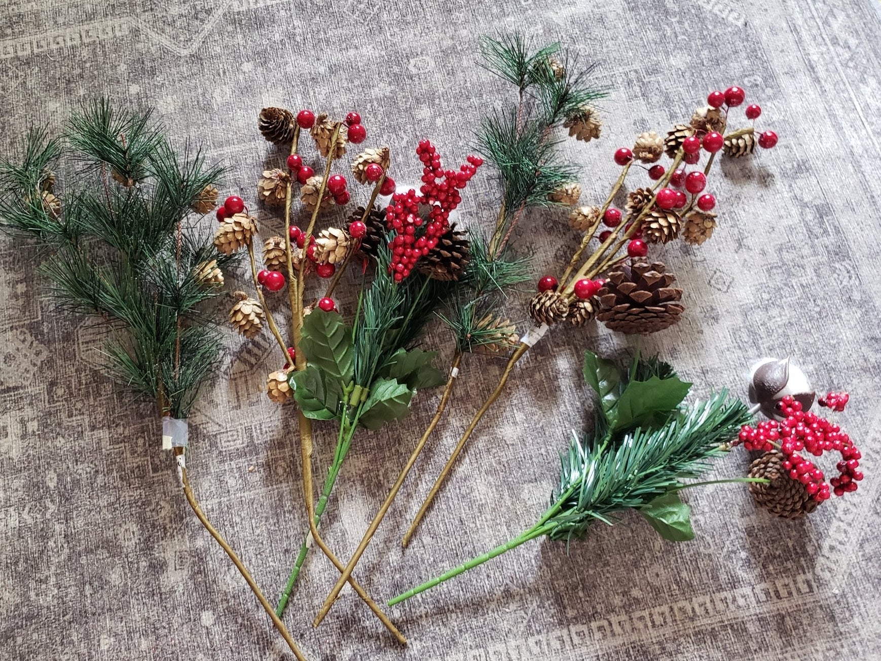 Pinecone, pine fir, red berries. Cotton bulbs   Great for embellishments for wreaths, and other types of crafts  all are new    set of 6 stems