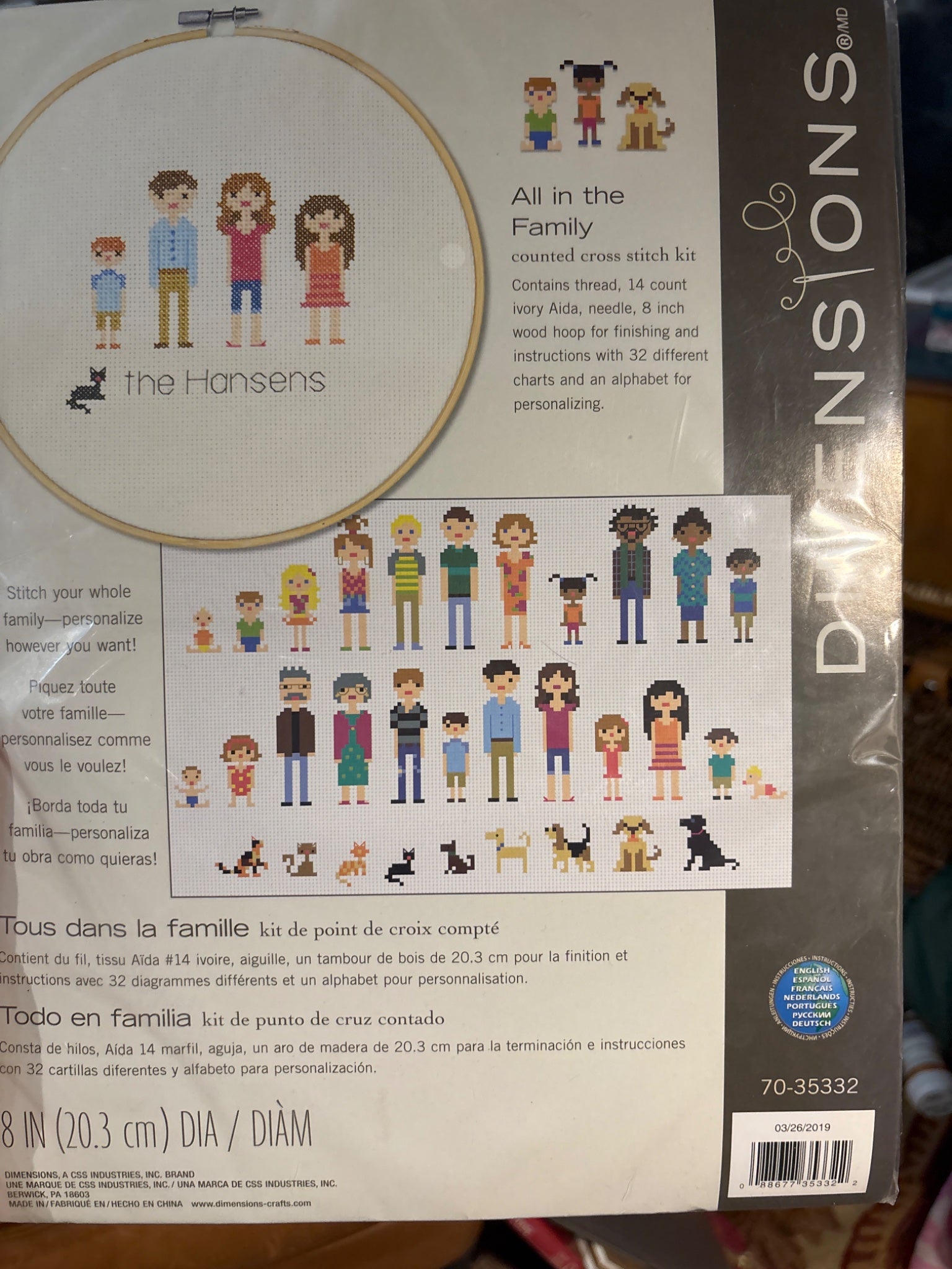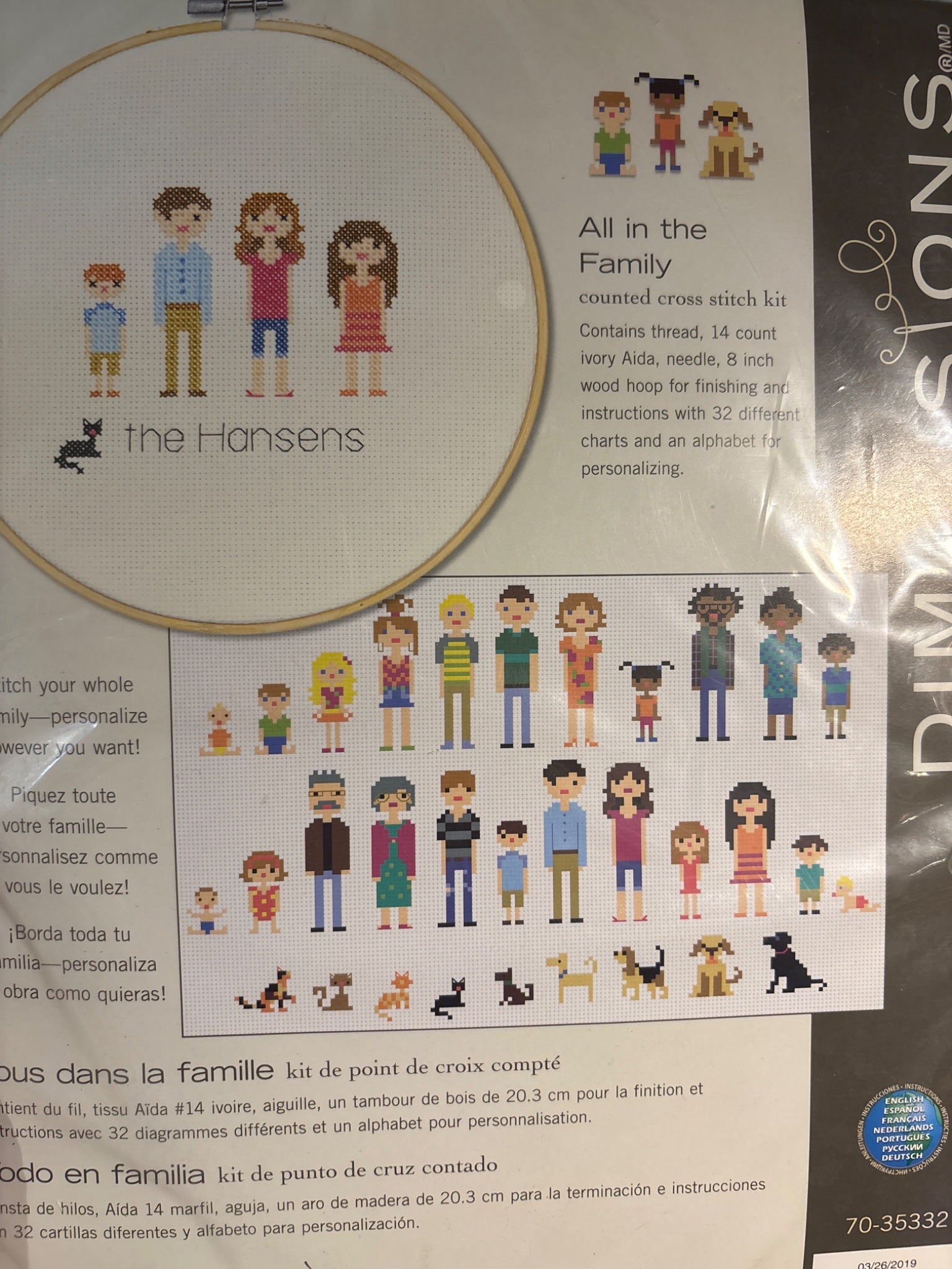 Dimensions Kit of counted cross stitch that can be customized to any family with multiple patterns for men, women, adults, children, and pets.