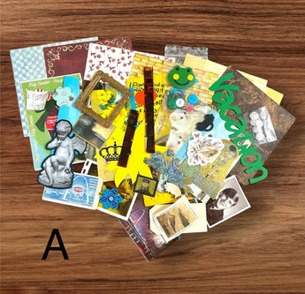 Items may include: old photographs, ticket stubs, buttons, die cuts, misc paper pieces.