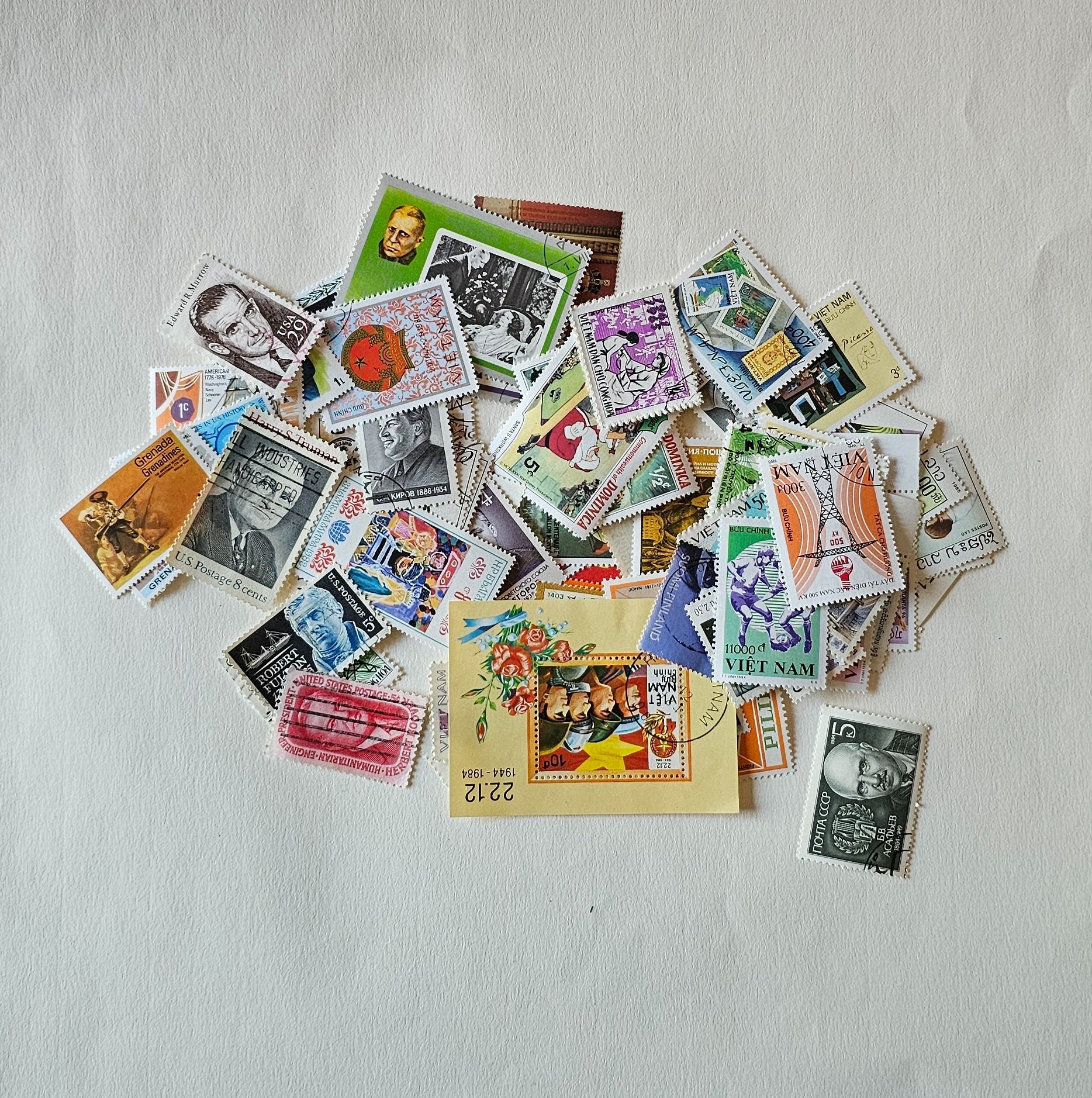 Postage Stamps bundle (A) of 70. International and USA, all different, and a mix of cancelled and uncancelled. Can be used for collecting, or used for art projects or scrapbooking, junk journal.