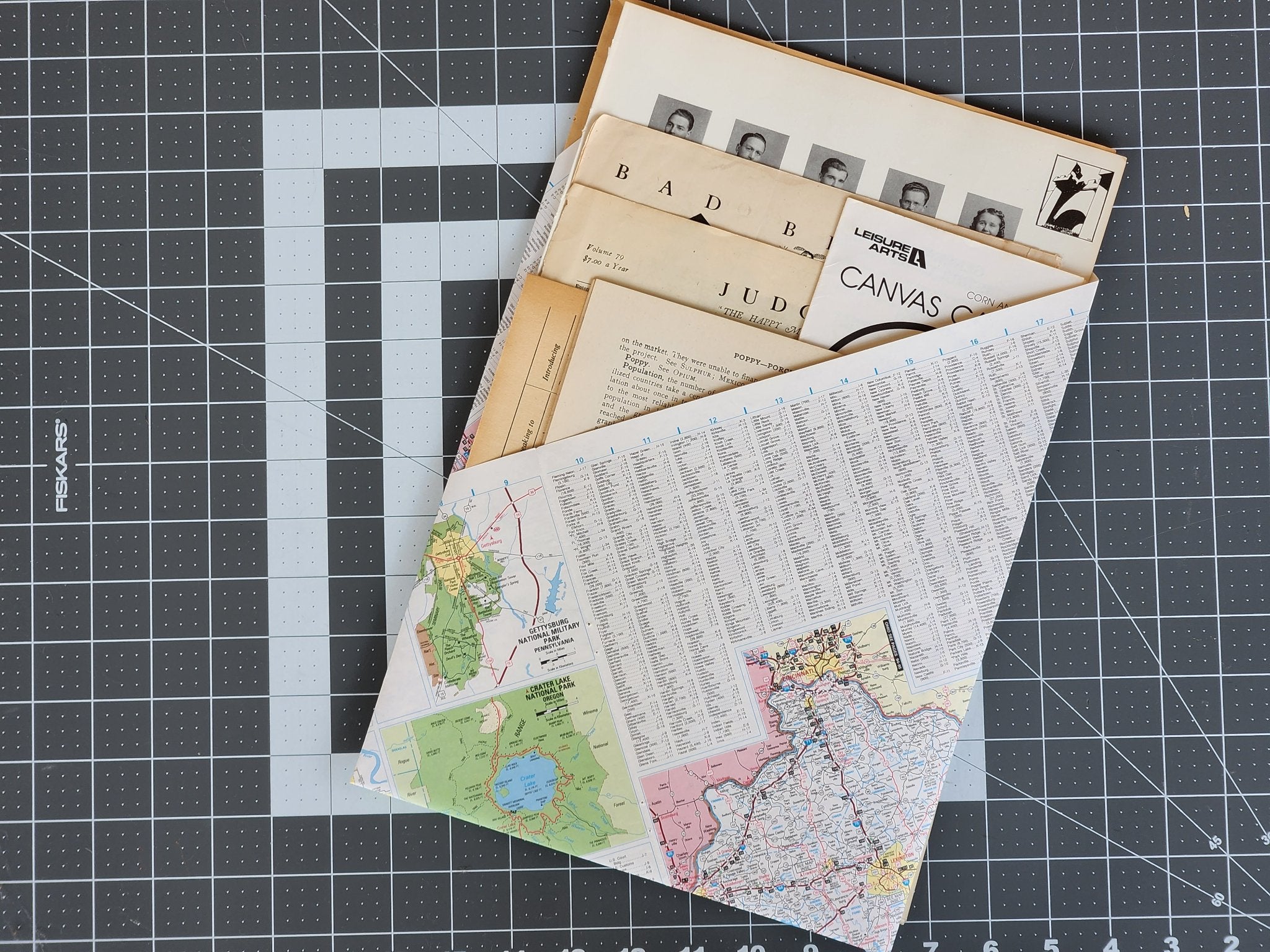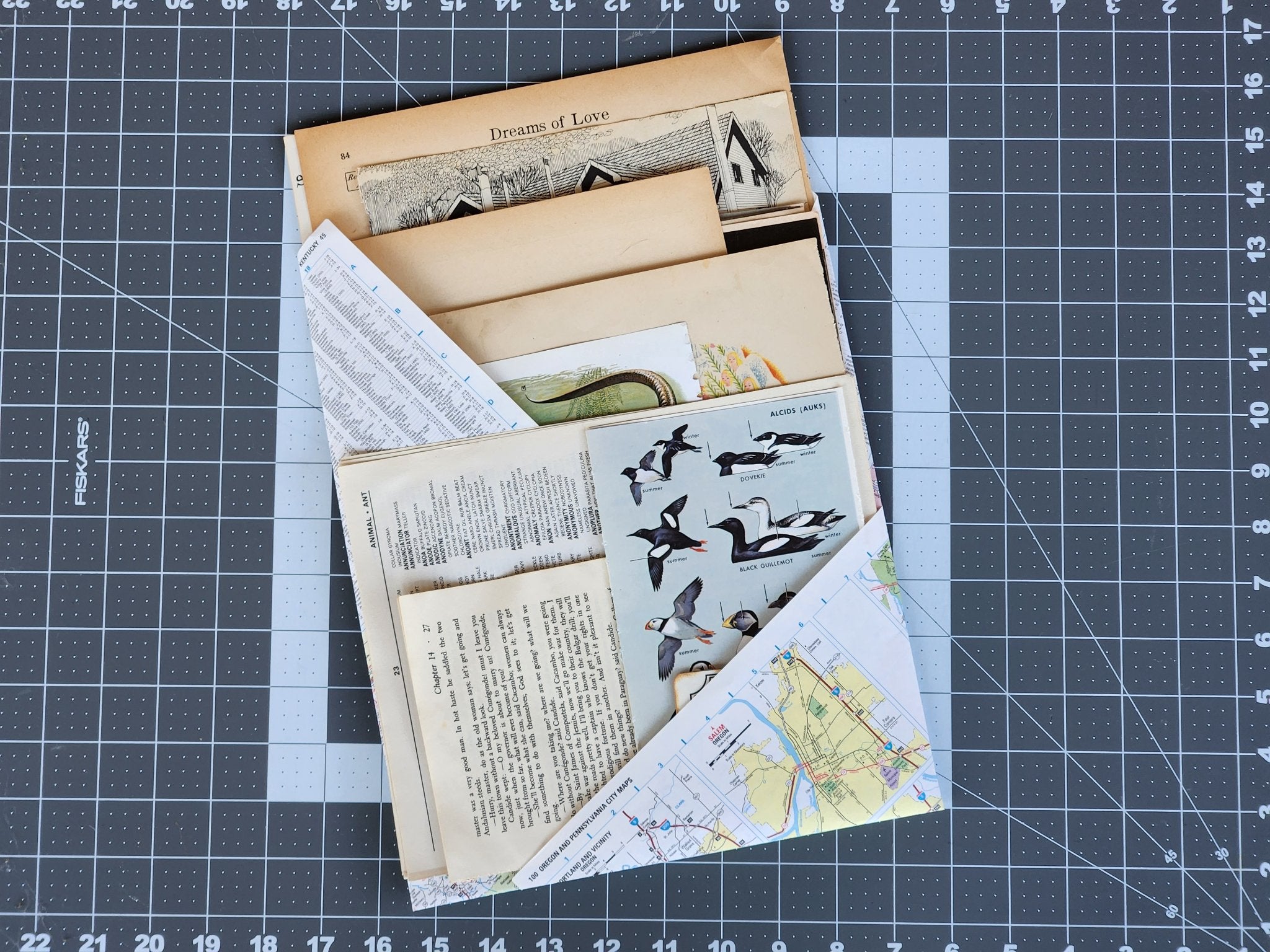 6 oz. curated pack of perfectly imperfect, vintage papers, wrapped in an atlas page. Great for collage, junk journaling, scrapbooking, and other paper crafts. Each unique pack contains at least one sheet of: