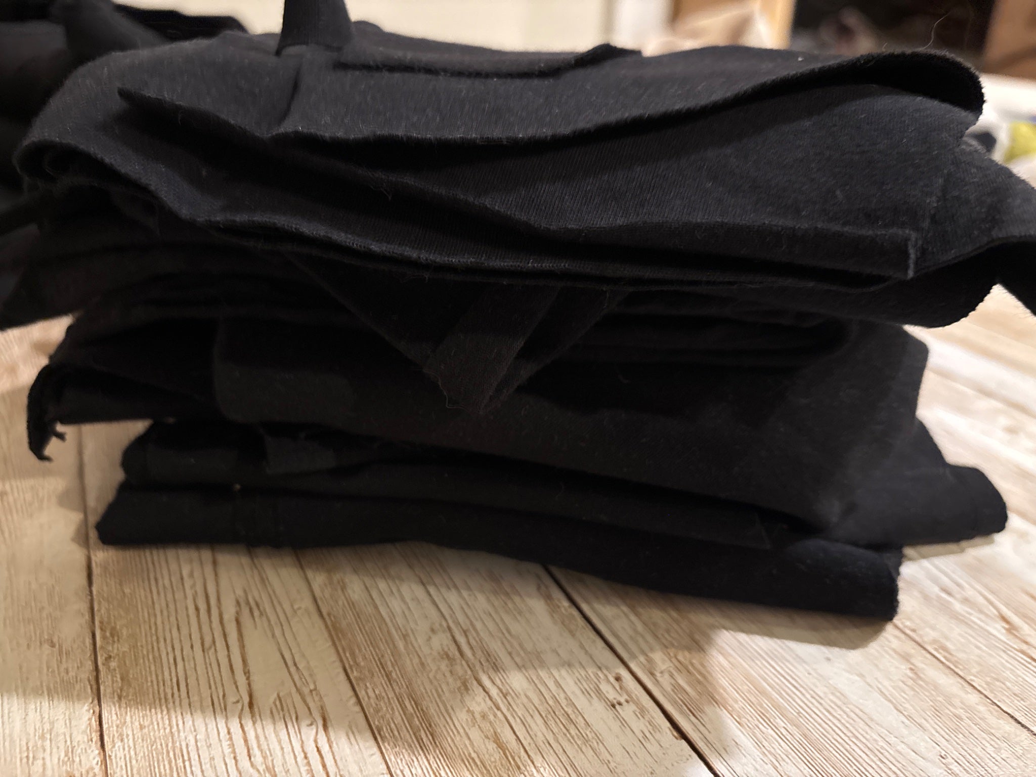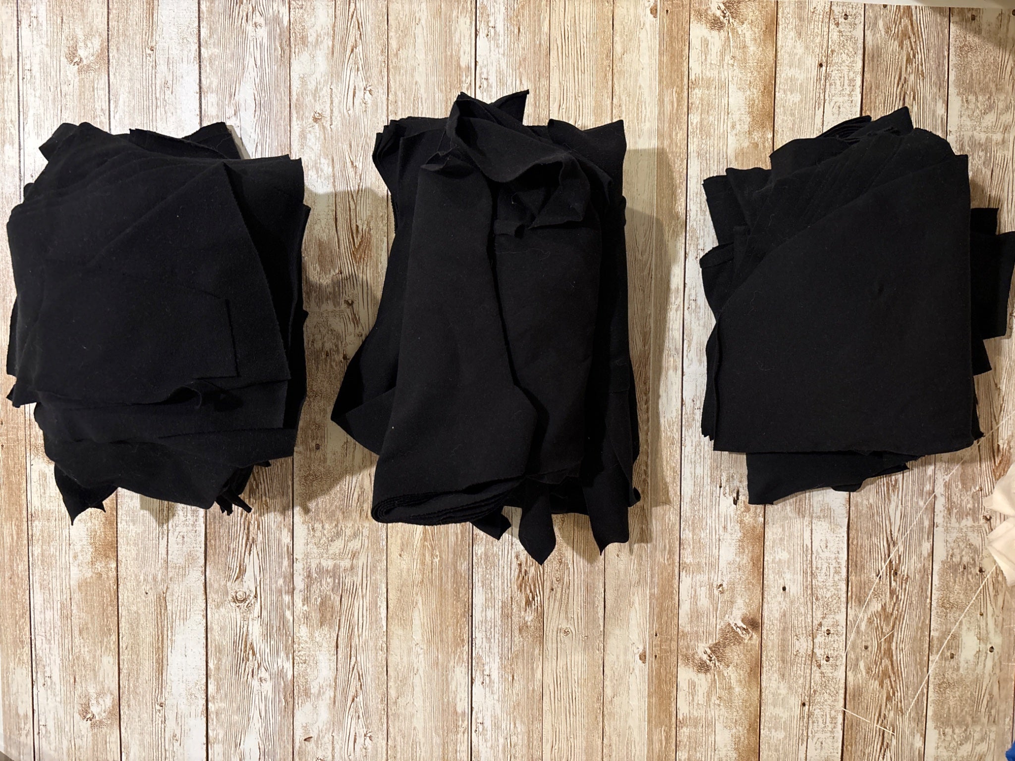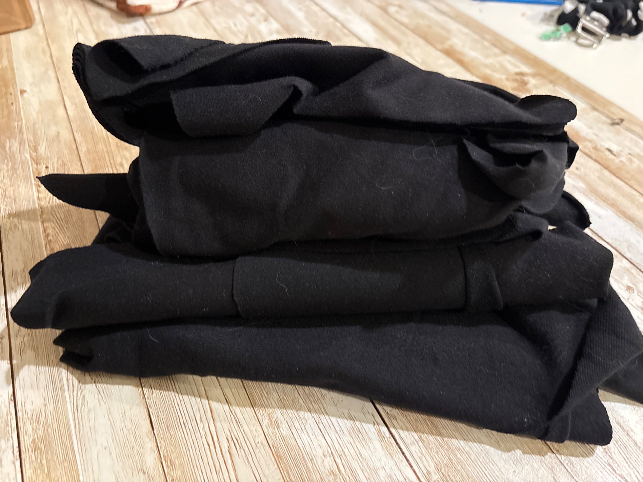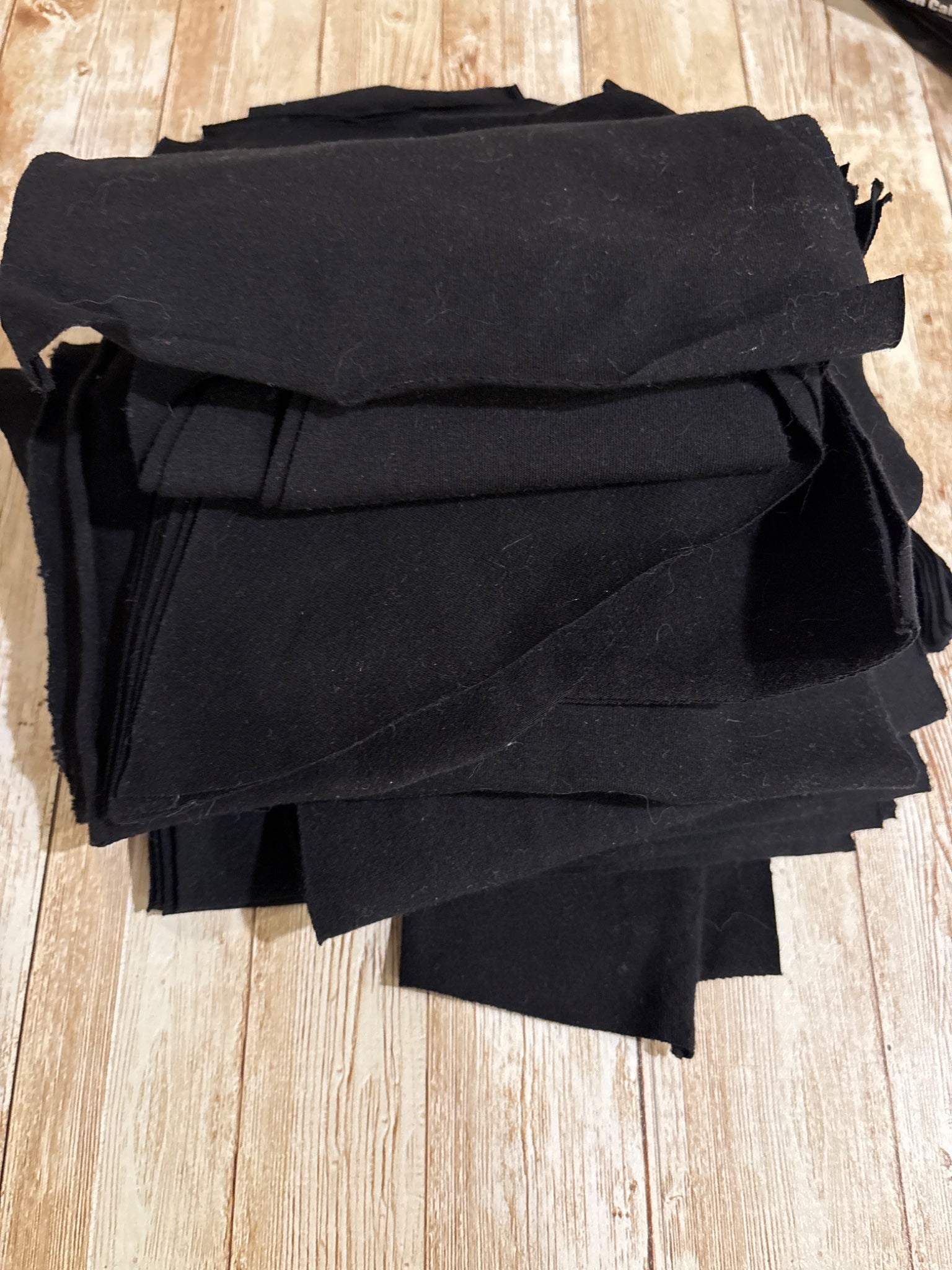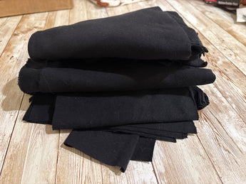 Several cuts of black scrap fabric. Pieces vary in size and quantity, but they are not tiny by any means. The fabric is stretchy but very thick, can be used for a variety of purposes.