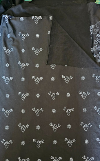Fabric stretchy black with slight sheen flowers floral & hearts 4 yards x 60"