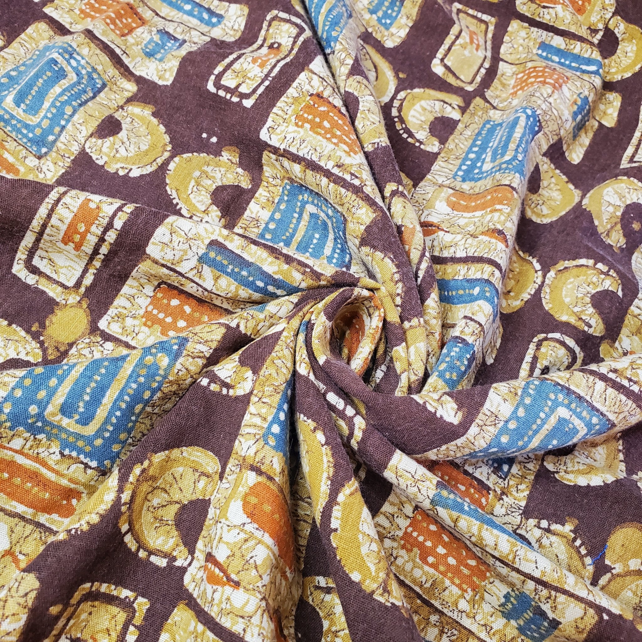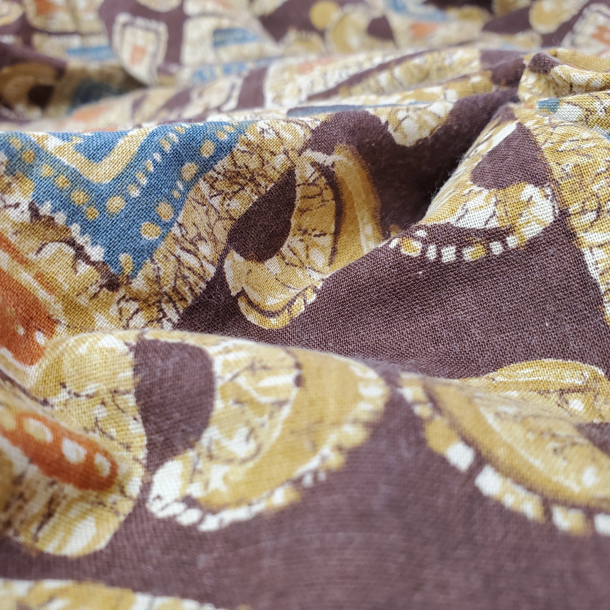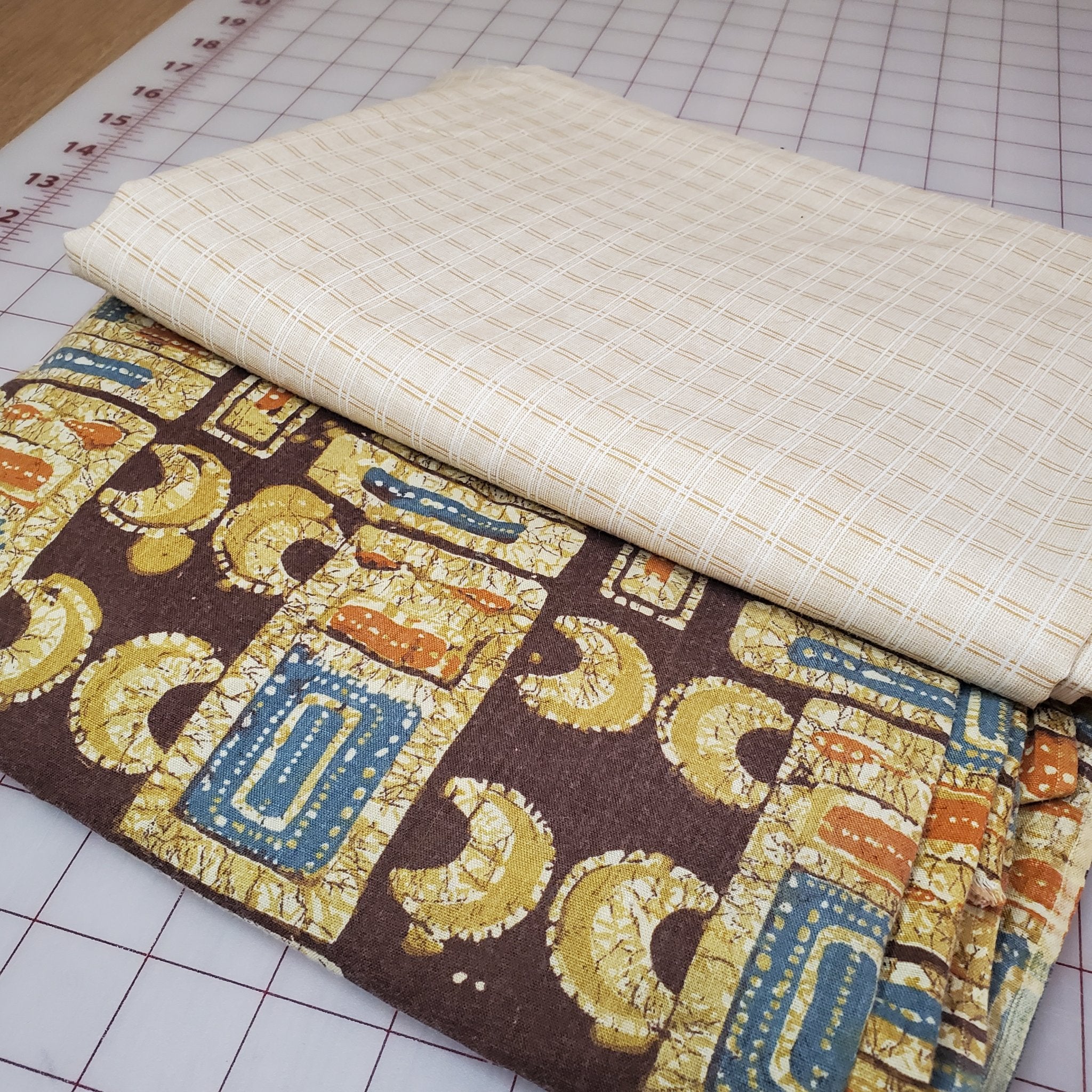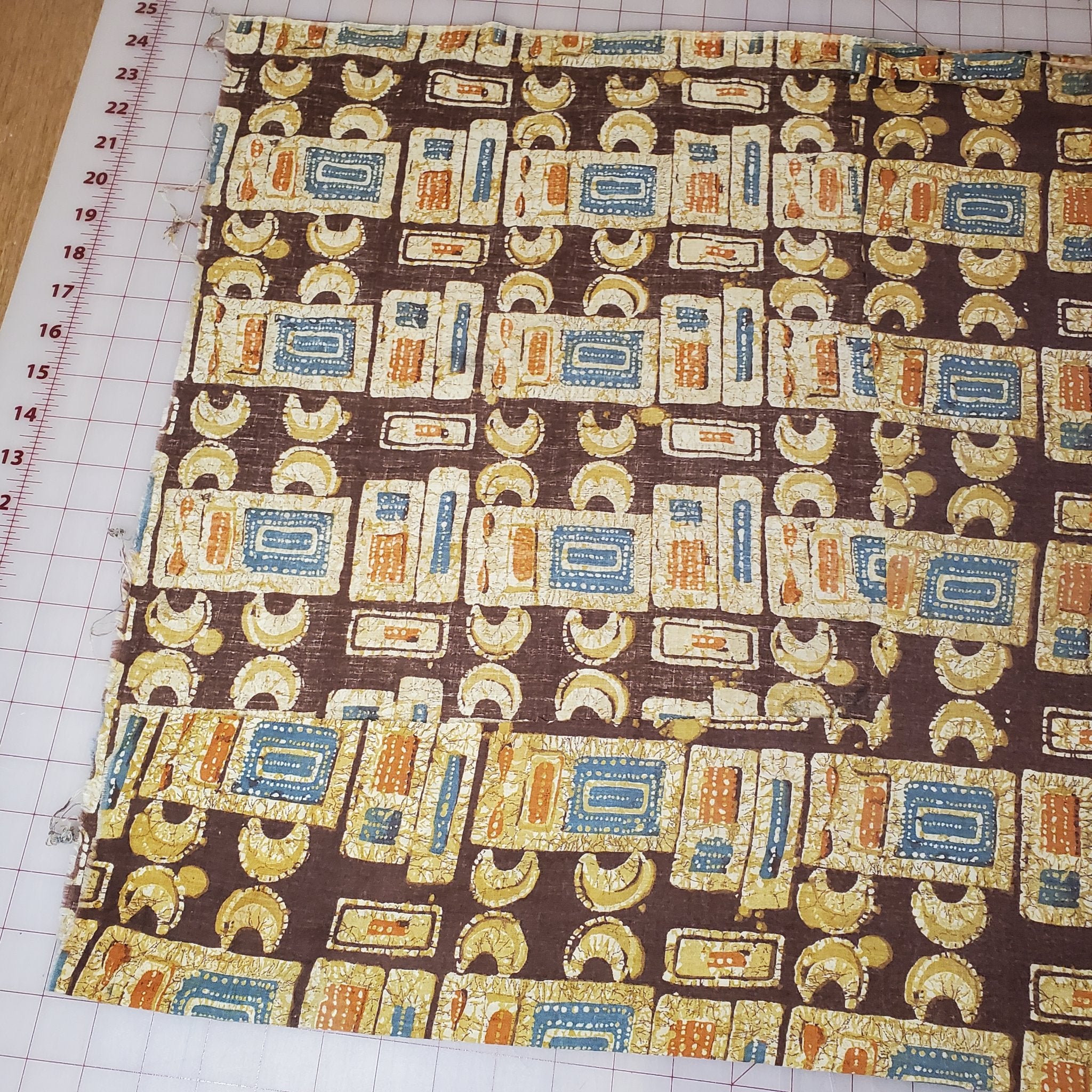 44" Width - We have 1 Yard 10" of the darker print. It looks like it could pass for a tiki bar fabric, right? This is much thinner than a quilting cotton. So we aren't sure if this is cotton lawn or just a thin cotton in general. There is a little more than what we've measured but we only calculated what is uncut.