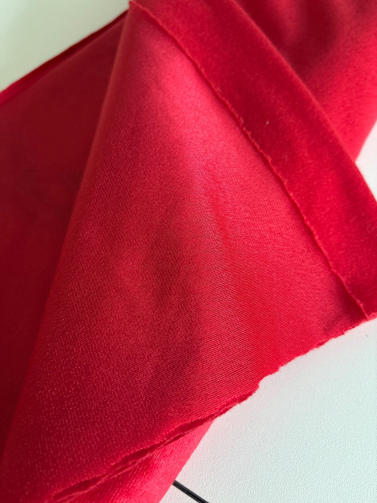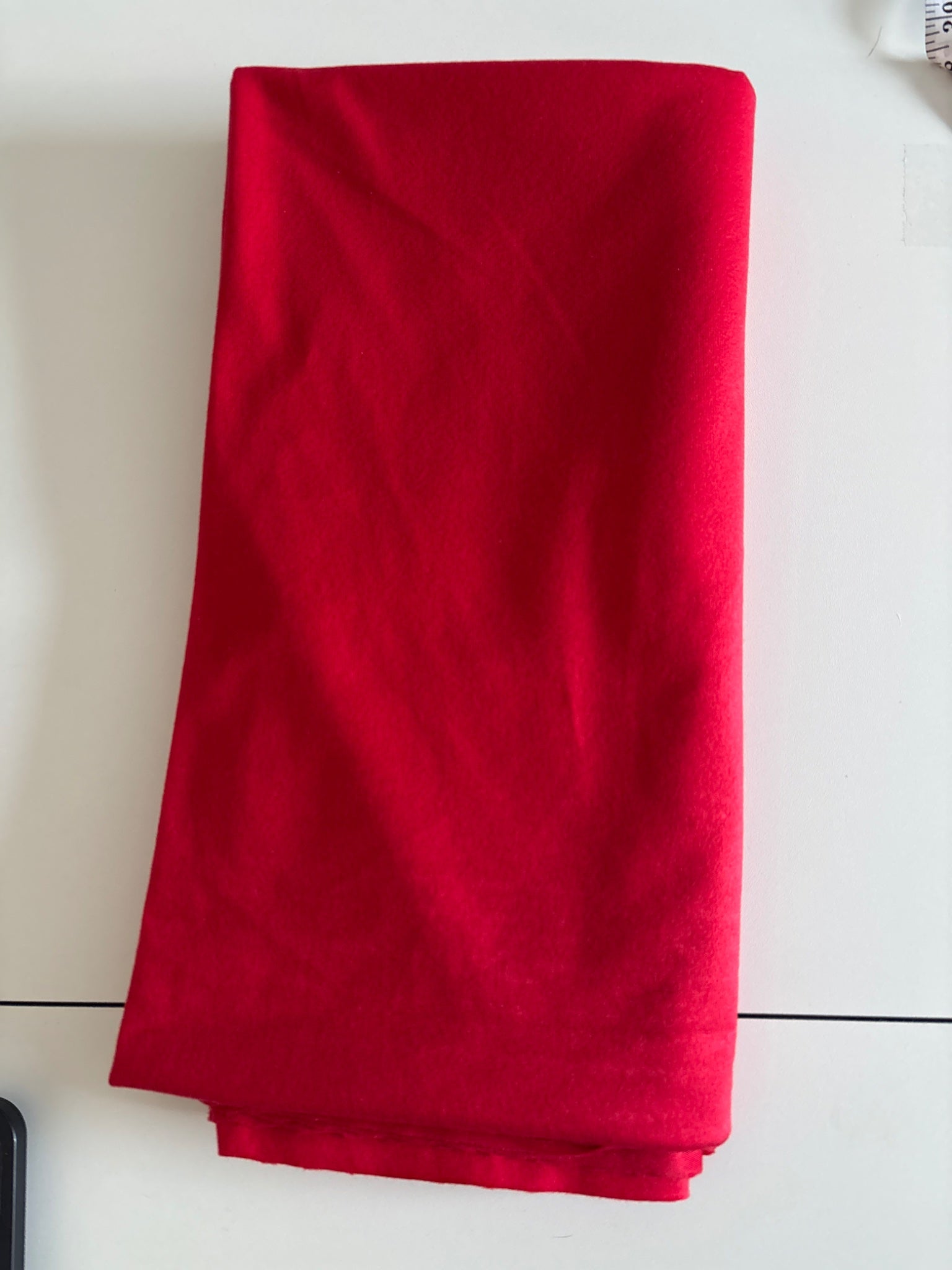 Red fabric has fuzzy feel on one side and slick feel to the other side. I'm not sure what it is exactly but could be used for costumes, apparel, bags or even blankets.