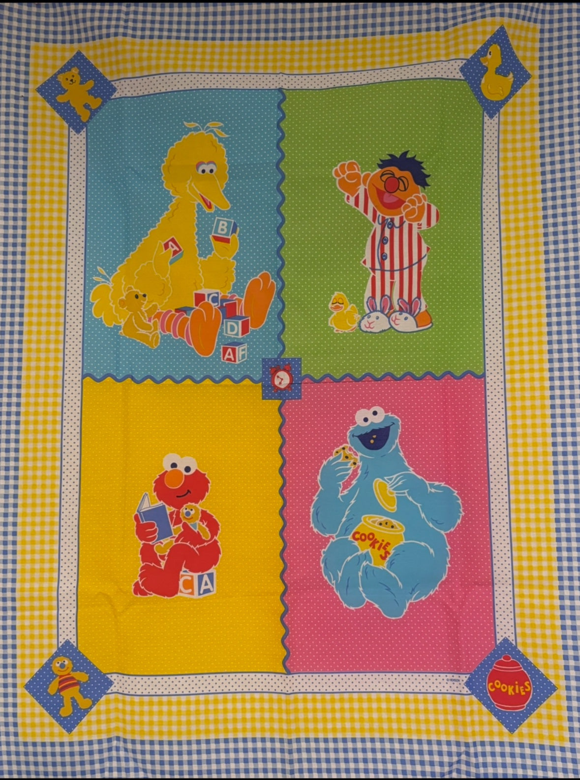 Vintage cotton quilt pattern featuring a few of Sesame Streets best; Ernie, Big Bird, Cookie Monster and Elmo. This panel is vibrant and in great condition.